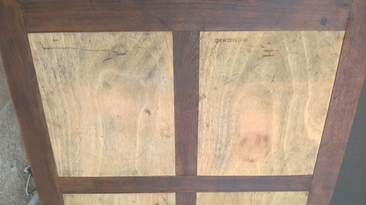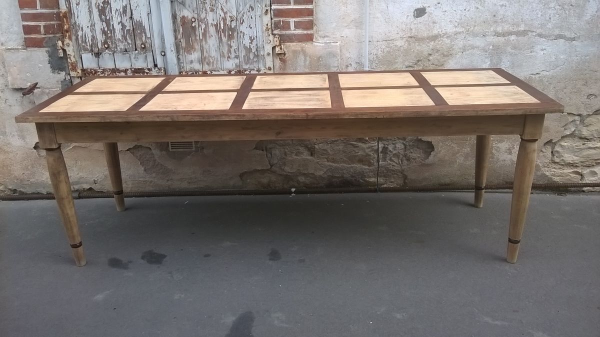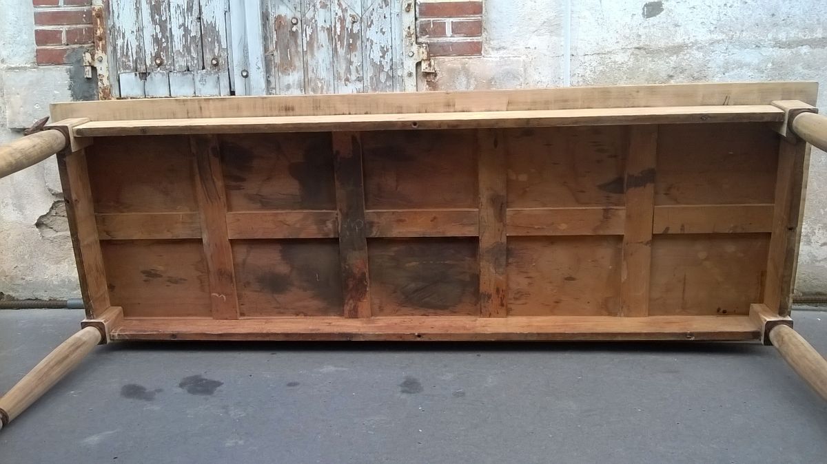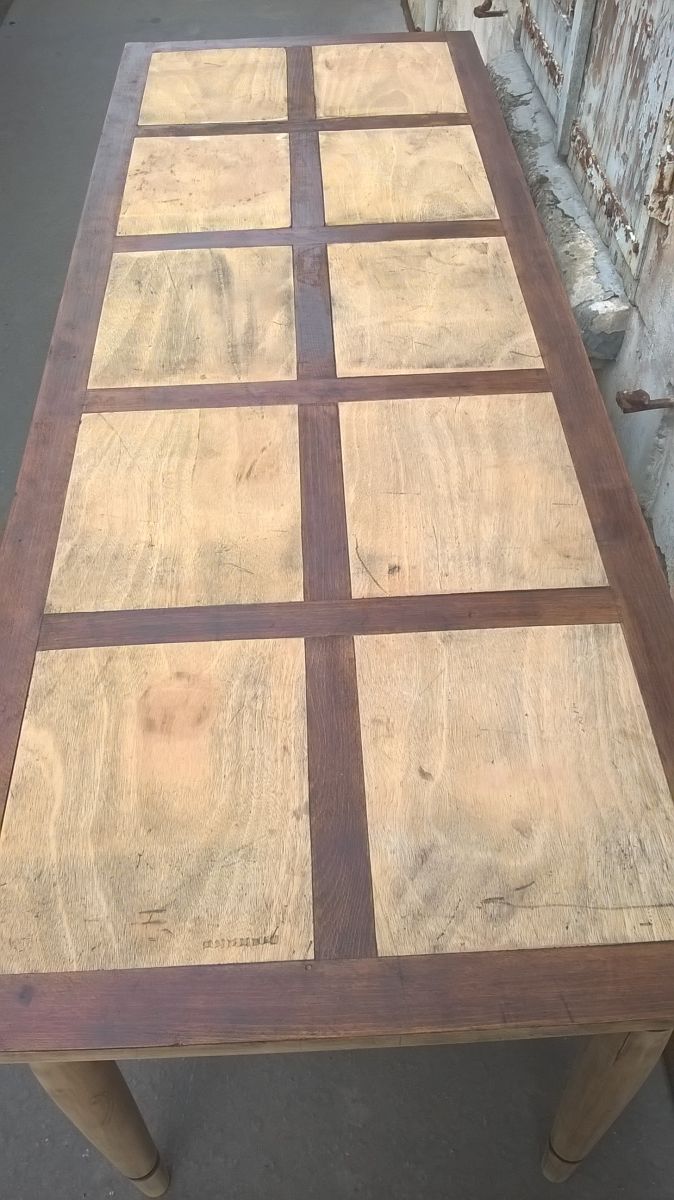 Ancienne table de ferme en sapin. Elle a été poncer, entourage du plateau tinté. Pied fuseau, a noté quelque ancienne marque sur le plateau. Longueur 210 cm, largeur 74.5 cm épaisseur du plateau 2.5 cm. Hauteur totale 73 cm, hauteur sous bandeau 60.5 cm.