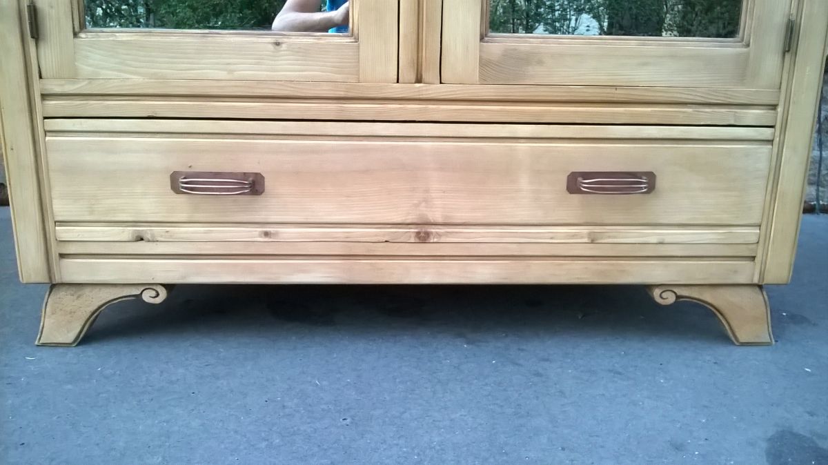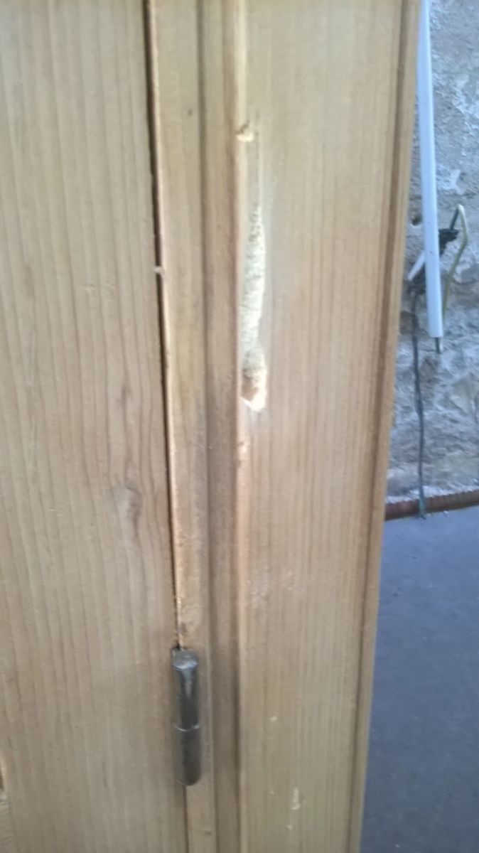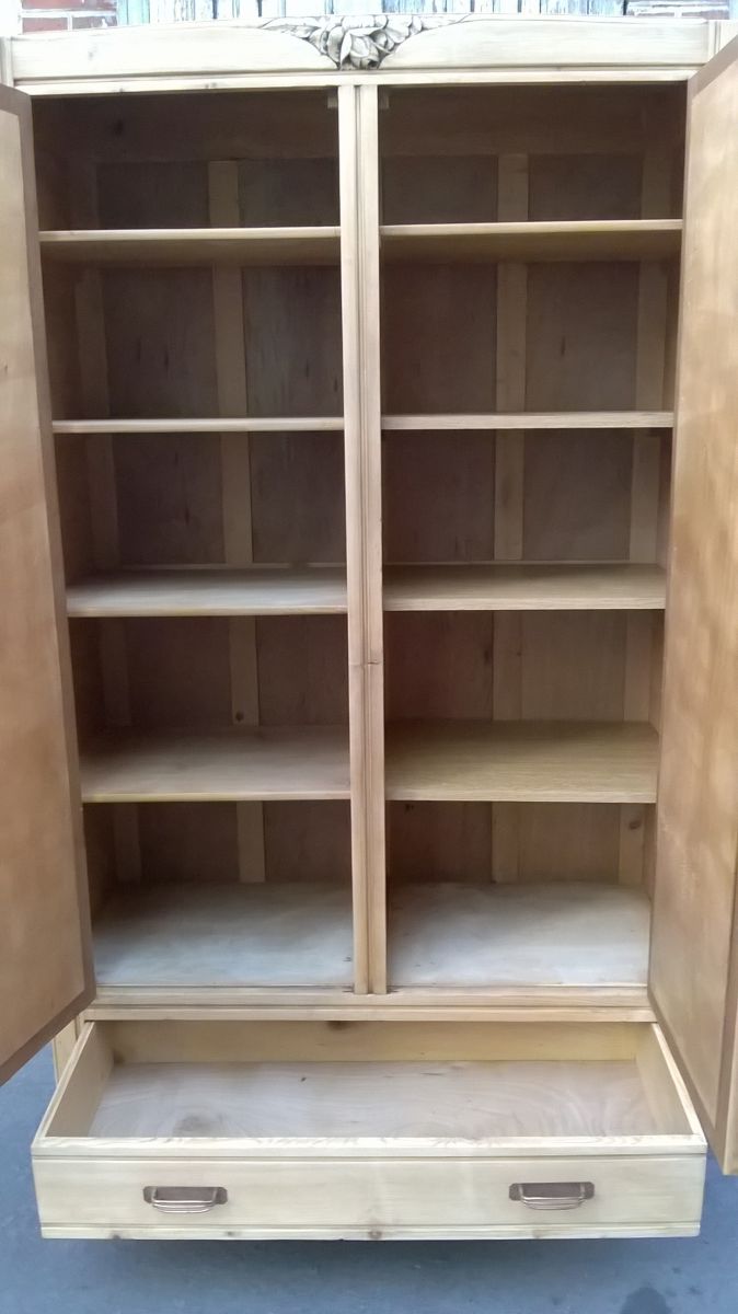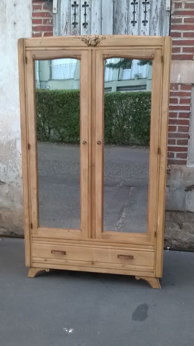 Superbe armoire parisienne année 30 style art déco. Possibilité de la mettre en penderie ou étagère. Elle a été décapé, il y deux clé, l armoire ferme bien. A noté petit éclat de bois voir photo 6. Hauteur totale 190 cm. Profondeur 48 cm. Largeur 112 cm.