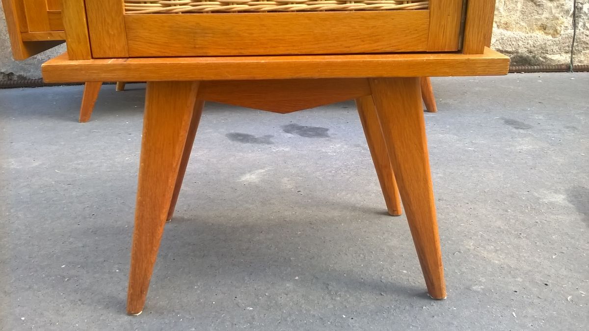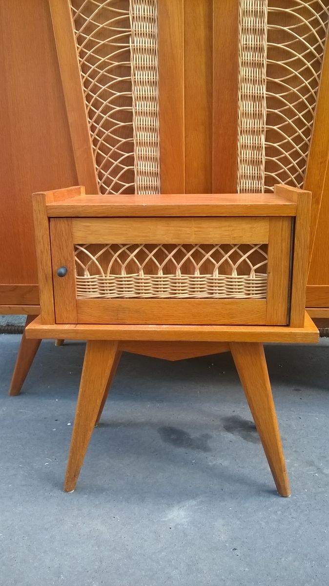 Petit chevet en rotin vintage. Quelque marque d usure voir photos. Le rotin est en bonne état. L armoire du même ensemble est en vente dans mes annonce.
