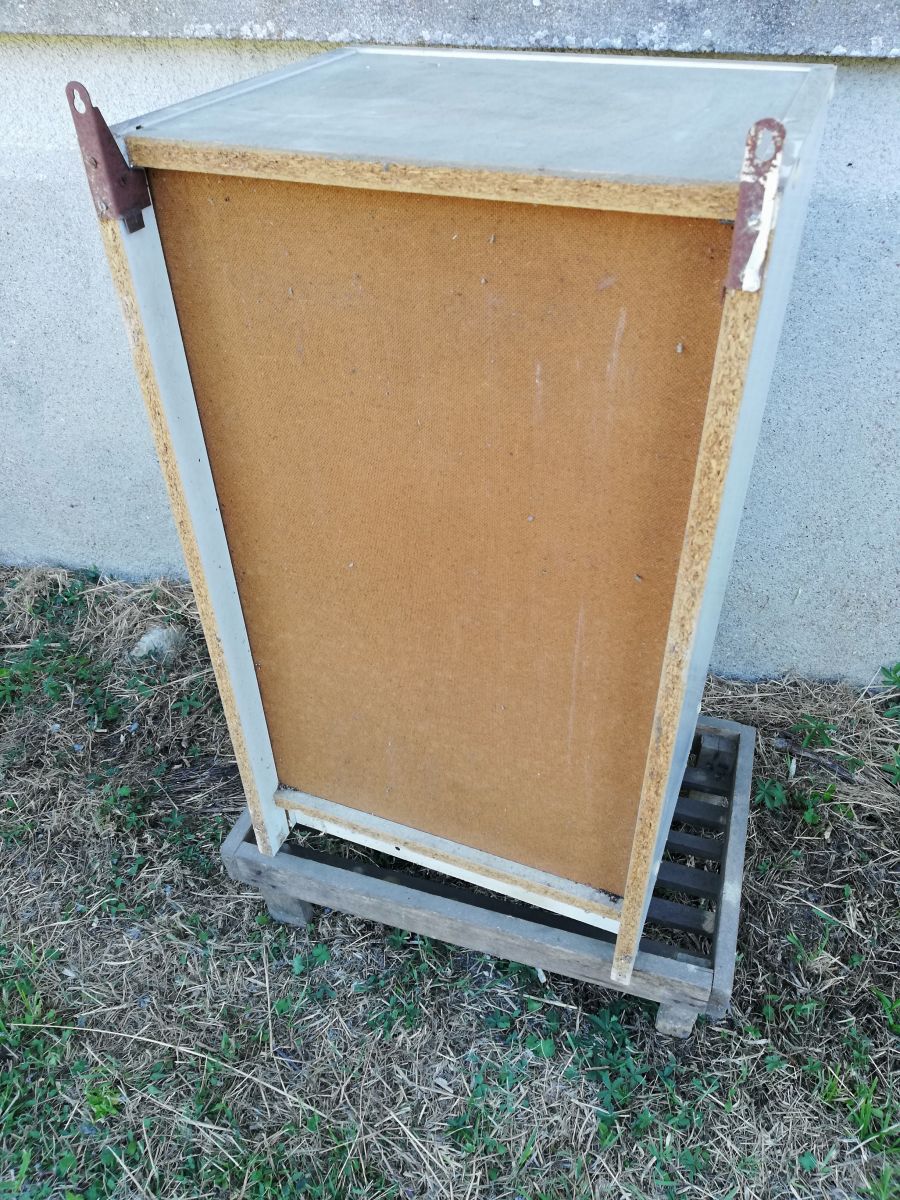 Meuble de salle de bain à accrocher au mur. En formica, vintage. Une tablette à l'intérieur et un miroir sur la porte.