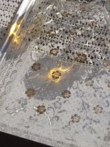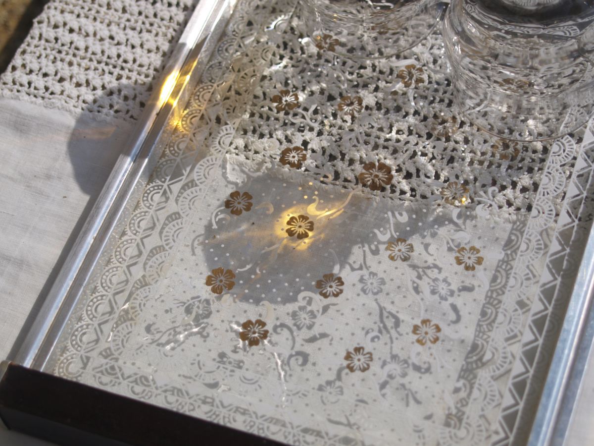 - un petit plateau en bois rouge, métal, verre peint de fleurs, frises et arabesques en blanc et or. Il mesure 25,5 cm de long, 18 cm de large pour 2c m de hauteur.