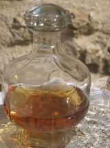 - une petite carafe et son bouchon d'origine (ferme très bien) en verre moulé blanc. Elle mesure 15 cm de hauteur bouchon compris, 10 pour cm de largeur.