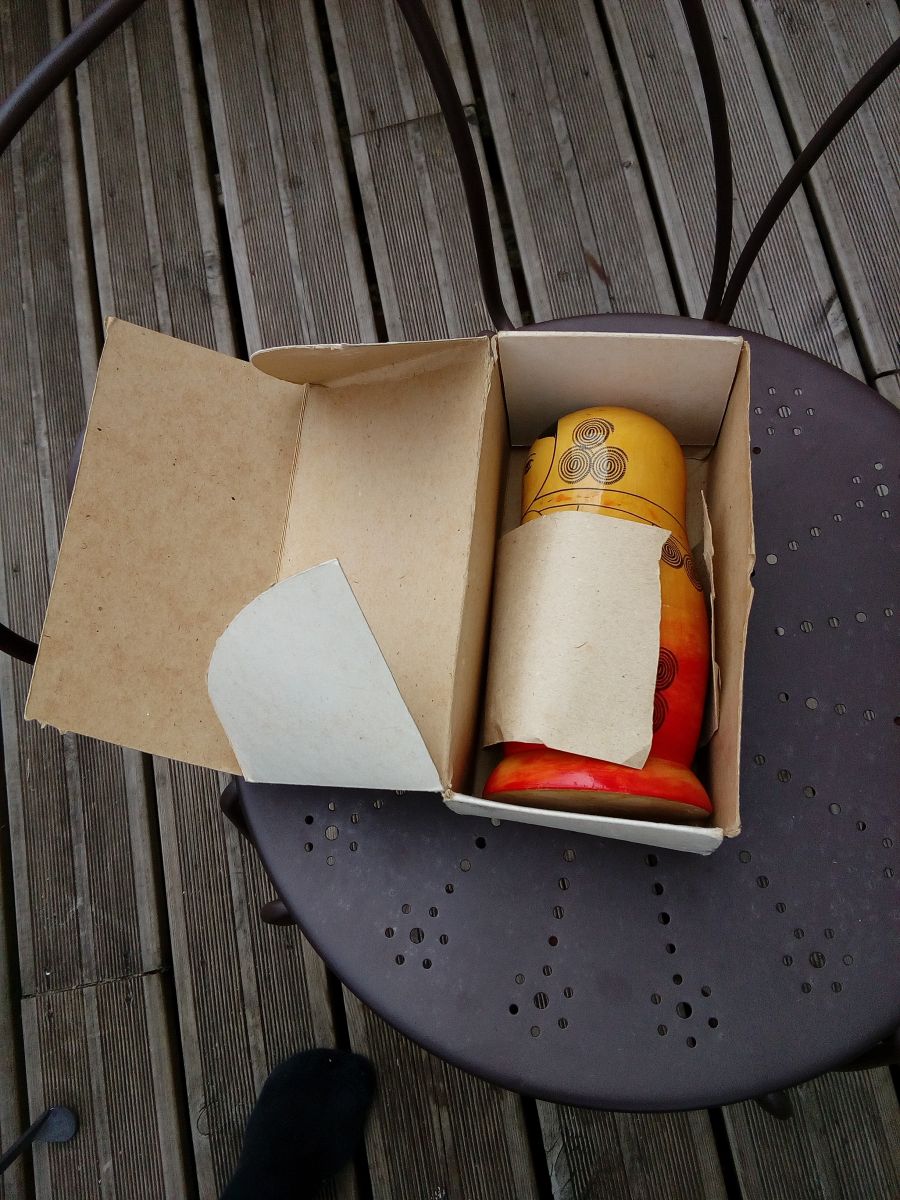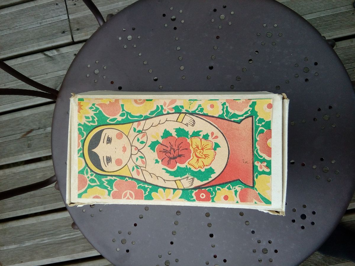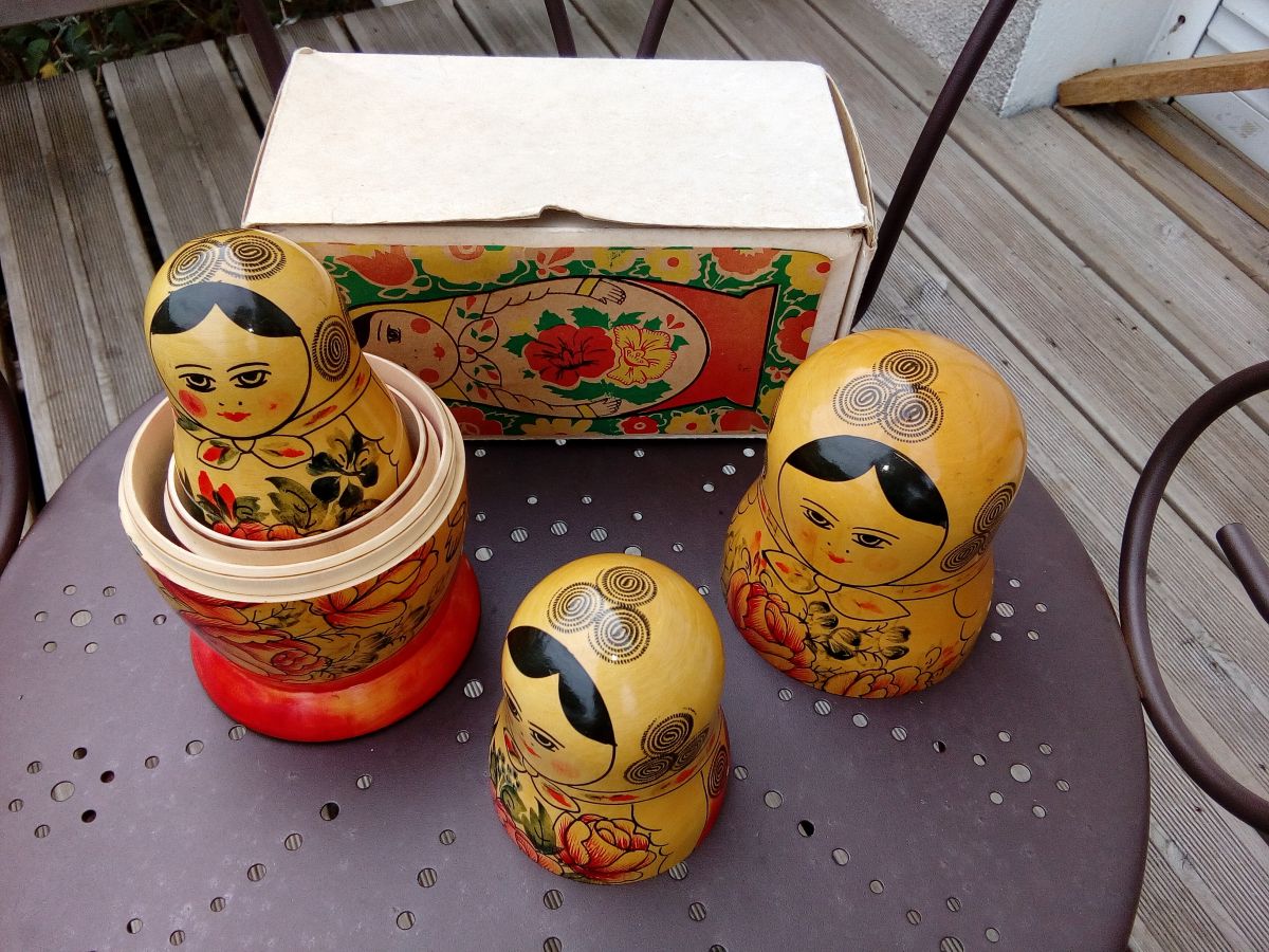 Ensemble de 8 poupées russes emboîtables les unes dans les autres. Elles datent des années 70-80, rapportées d'un voyage en Tchécoslovaquie (très certainement fabriquées en ussr). Elles sont accompagnées de leur boite en carton. Elles sont en bon état, ni cassure, ni éclat de peinture. Les couleurs sont encore vives, mais probablement un peu moins qu'à l'origine sur les plus grandes. La boite en carton est abîmée : deux déchirures d'un cm sur l'arête de pliage. La plus grande poupée mesure 19, 5 cm de haut pour 10 cm environ de plus grand diamètre. La plus petite mesure 3 cm de haut pour 1 cm environ de diamètre. Le tout pèse 420g.