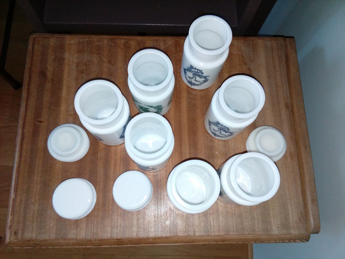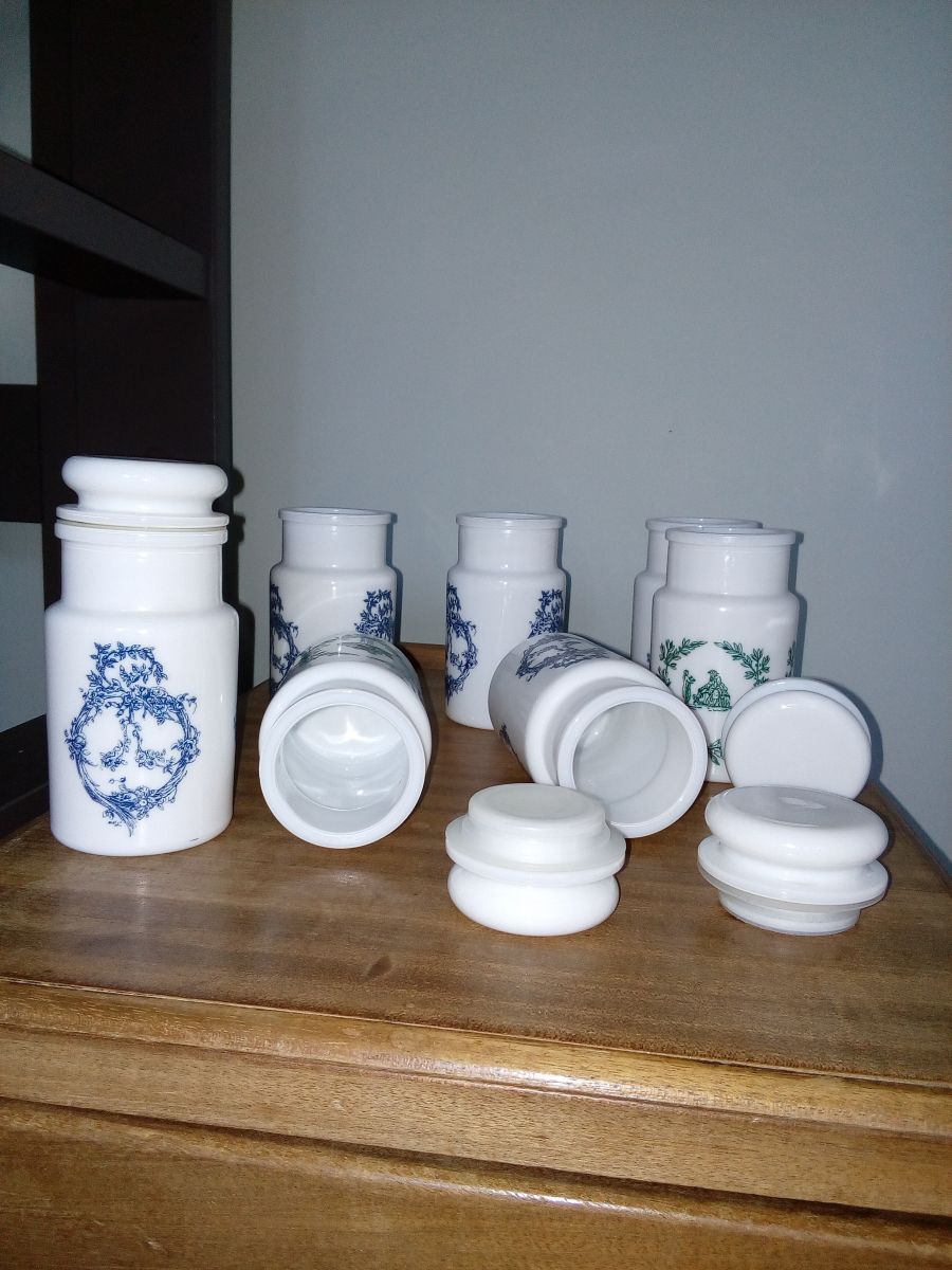 Ensemble de 7 bocaux d’apothicaire en verre opale blanc avec un décor bleu pour 5 d'entre eux et vert pour les deux autres, avec quatre bouchons dans le même matériau avec joint en plastique. Pour la décoration, ou pour conserver des herbes et fleurs séchées, du mélange pour infusion ou des épices. Les bouchons s'adaptent sur tous les flacons et sont encore en très bon état, les joints en plastique sont intacts et tout à fait fonctionnels. Les flacons sont en très bon état, aucun défaut, très propres, un seul présente une petite tache à l'intérieur (je n'ai pas réussi à la nettoyer, mais ça doit être possible). En dessous des flacons, il est mentionné, « made in italy verre opale » Chaque flacon mesure 11, 5 cm de haut, 14 cm de haut avec le bouchon, 6, 5 cm de diamètre. L'ensemble pèse 1, 8 kg.