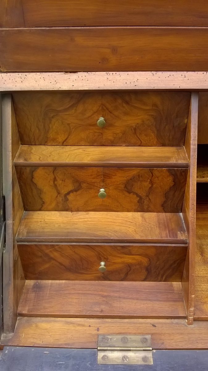 Bibliothèque secrétaire noyer et sapin xixe. Les serrures des tiroirs du bas et de la bibliothèque fonctionne. Également celui du secrétaire. Le petit tiroir a l intérieur du secrétaire ne fonctionne pas. Il y a 3 cachette sous les petit tiroirs. Le meuble a été traité. A noyé il y a des renforts sur les pieds arrière car il sons usé voir photos. Hauteur totale 225 cm. Profondeur du bas 56 cm, profondeur du haut 31 cm. Largeur 112 cm. Hauteur secrétaire 111 cm. Hauteur du haut 114 cm.
