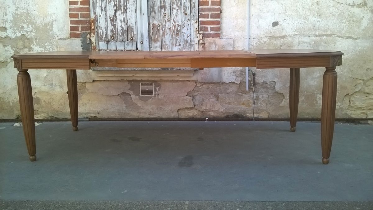 Table a rallonge art déco. Avec 3 rallonges de 34 et 35 cm. Hauteur totale 74 cm, hauteur sous bandeau 65 cm. Longueur sans rallonges 116 cm, longueur avec rallonges 219 cm. Largeur 100 cm. A noté quelques marque sur le plateau voir photos. Pieds dévissable par courant. Les rallonges se range sous le