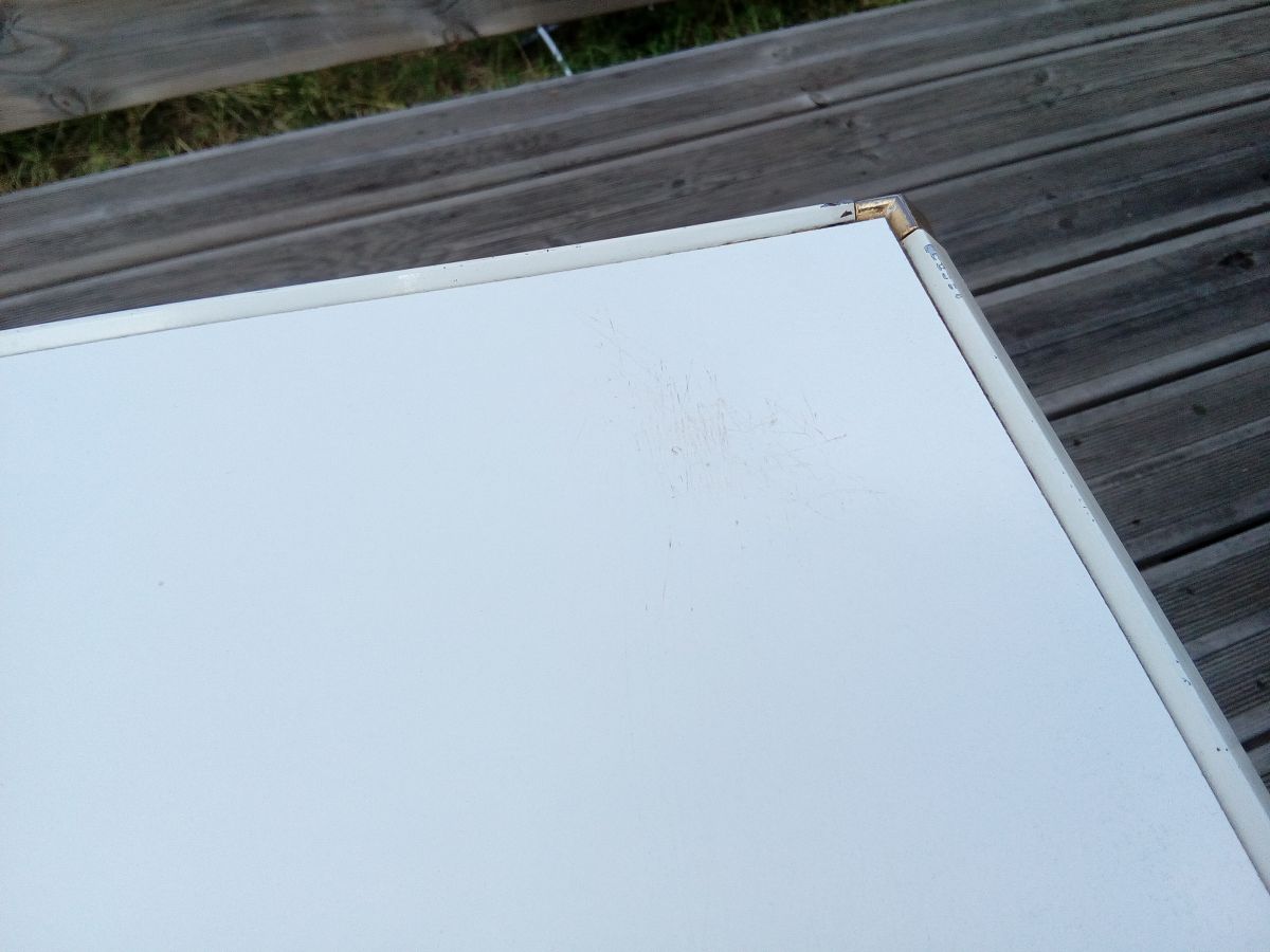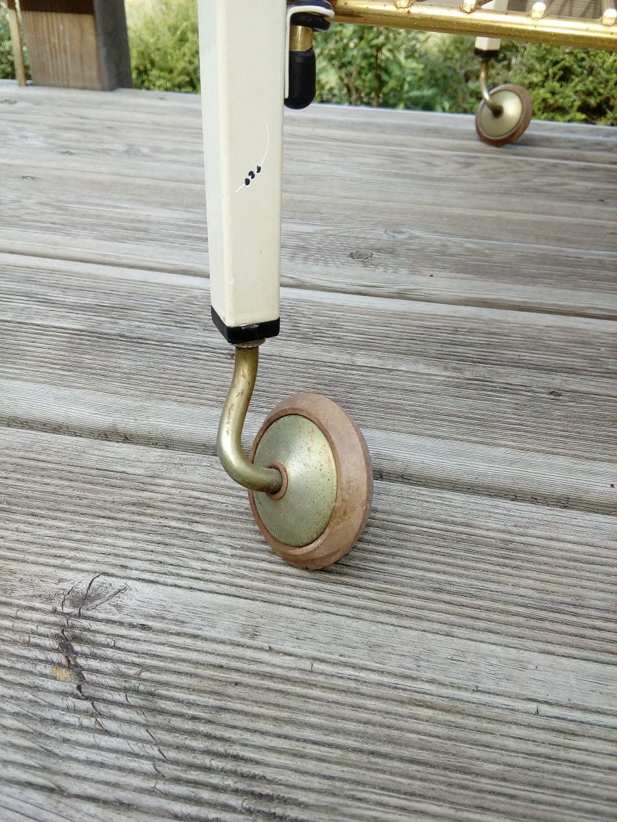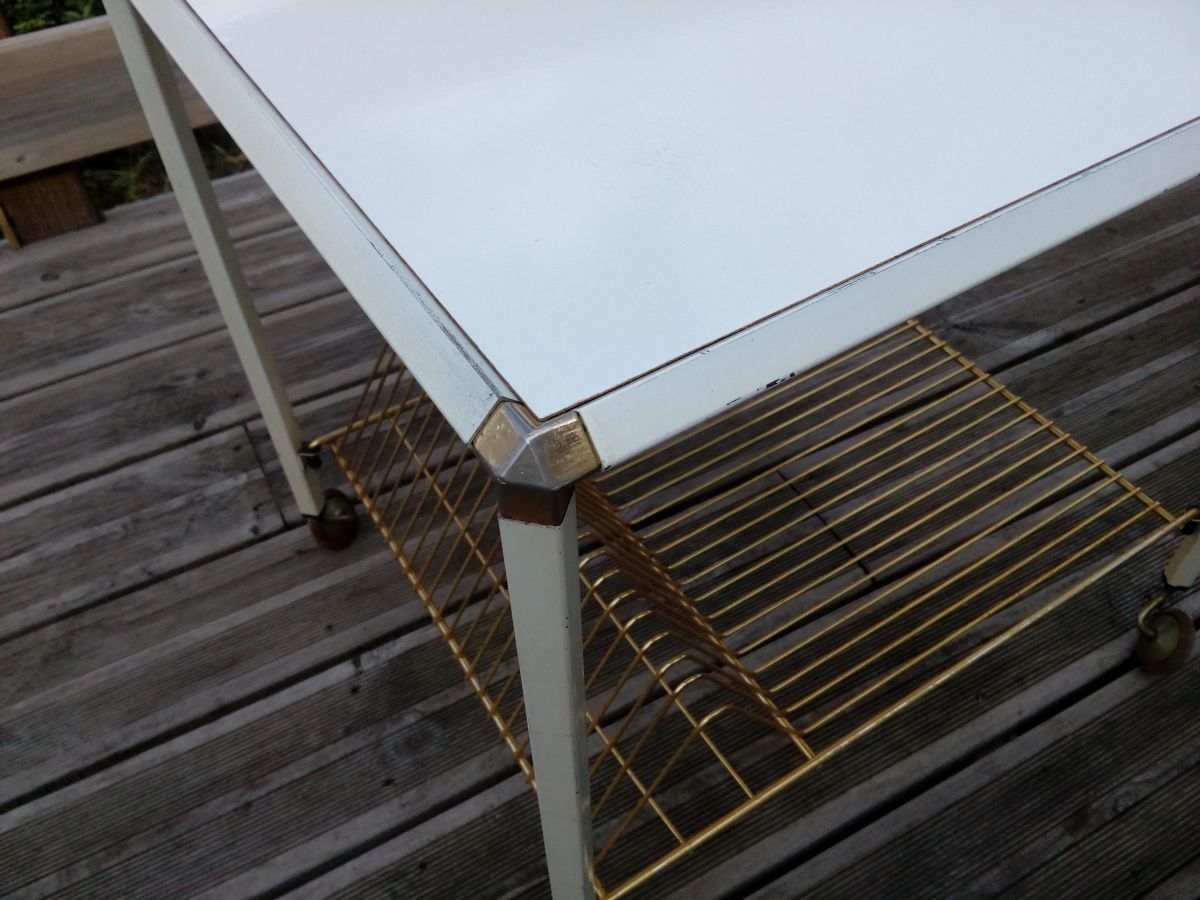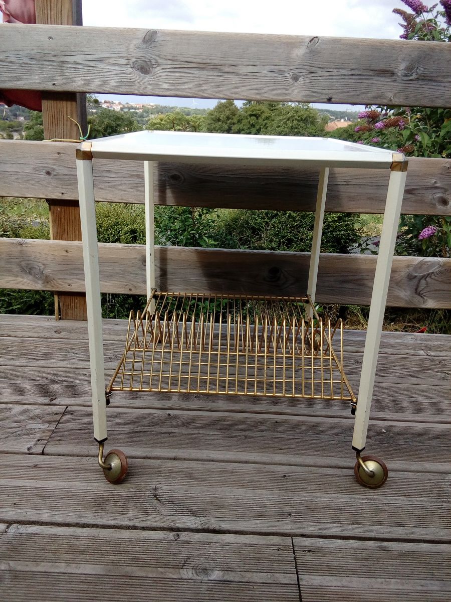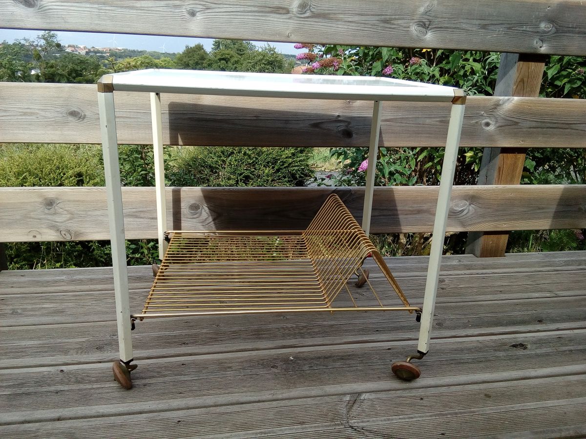 Jolie desserte, résolument vintage, pour les amateurs de vinyles, avec son espace porte-vinyles en bas, et son grand plateau pour y poser une platine tourne-disque en haut. Les roulettes très stylées, et les pièces métalliques dorées qui « cassent » les angles du plateau, ajoutent de l'originalité à l'ensemble. Cette desserte est encore solide, elle peut porter du poids (la structure est en tubes de métal à section carrée, le plateau est épais (formica?)), elle roule bien, mais elle présente aussi les signes de son âge : rayures sur le plateau (surtout localisées dans un seul coin du plateau) et sur les montants, taches diverses et manques sur la peinture de la structure. Les angles en métal sont moins dorés qu'ils ne l'étaient à l'origine probablement et il y a un piquetage de rouille sur la partie range-vinyle dorée. Elle mesure 54 cm de haut, 54 cm de large, 44 cm de profondeur. Et pèse environ 7 kg. Attention, la livraison de gros colis en Colissimo n'a pas repris à la Poste, il faudra attendre octobre apparemment pour les envois.