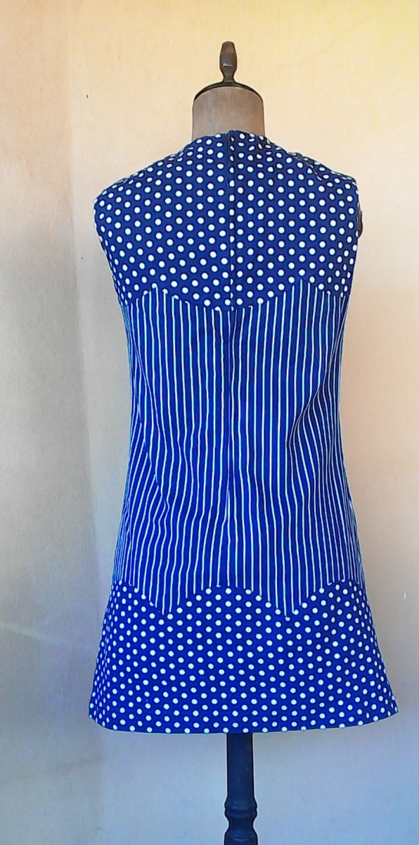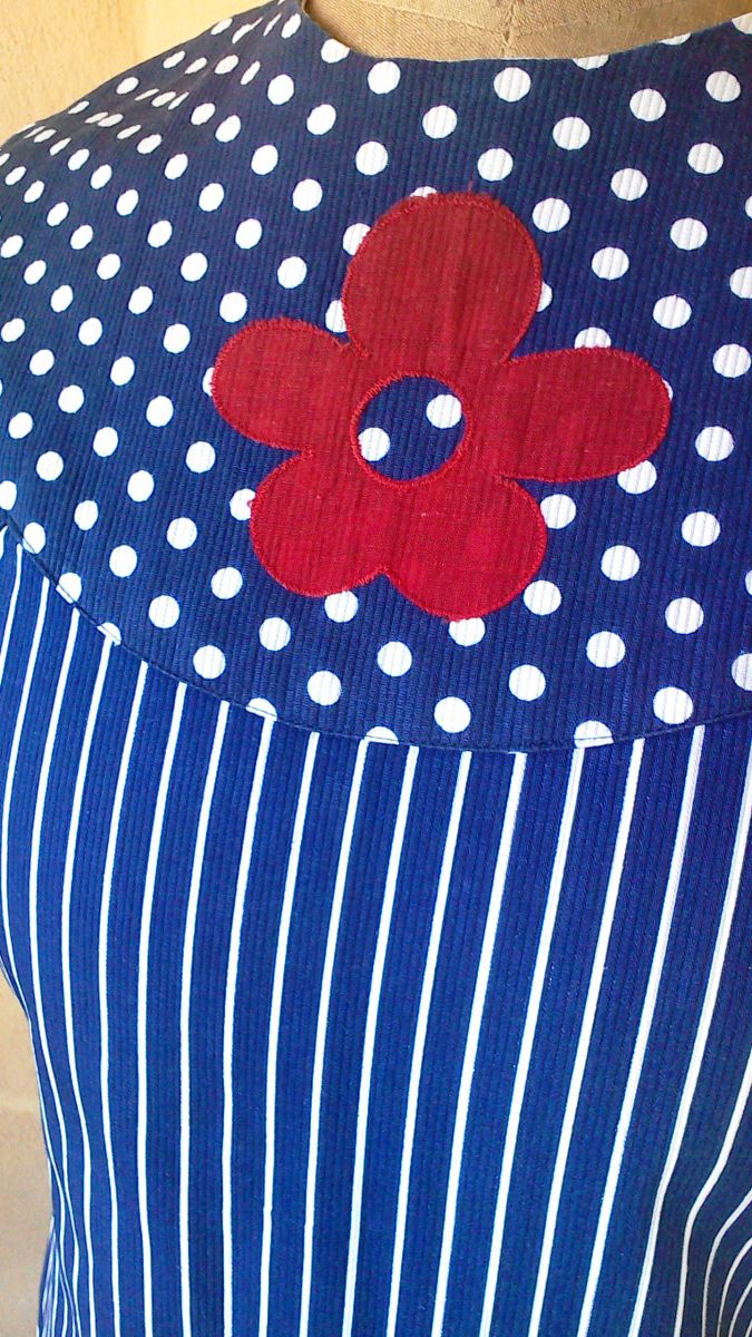 Forme trapèze, encolure arrondie, ras de cou, courte, de couleur bleue avec rayures en son centre et petits pois avec fleurs rouges sur poitrine et et bas de robe.