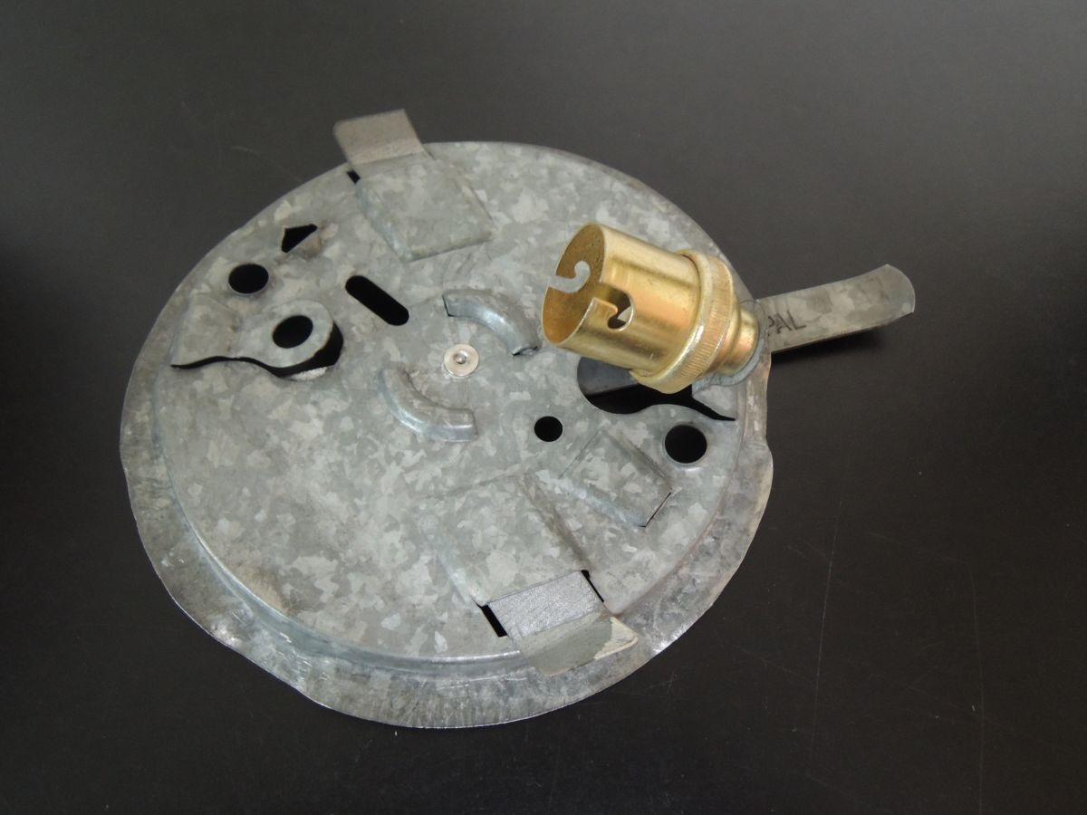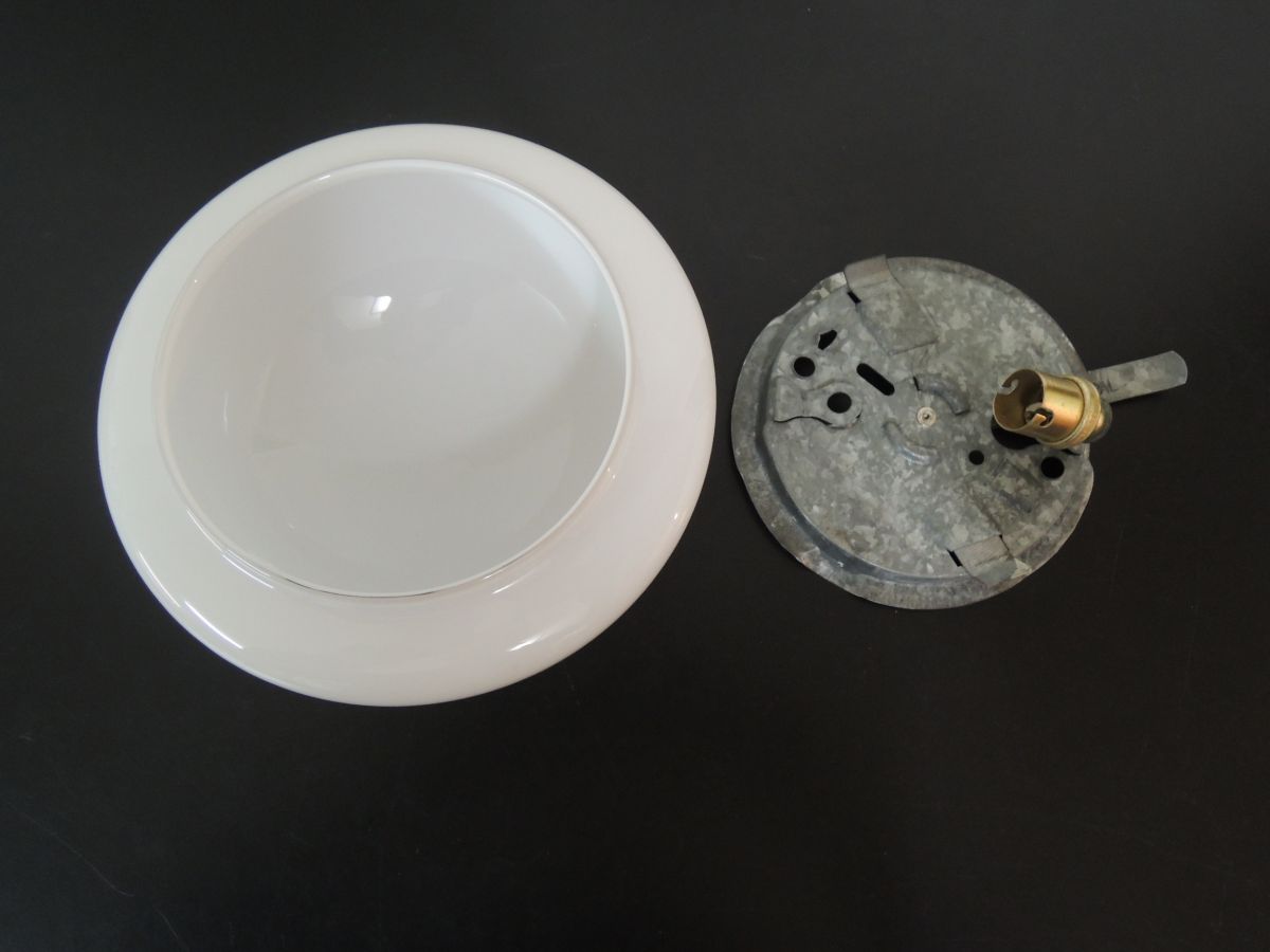 Petit plafonnier avec globe en opaline brillante de 20 cm de diamètre et socle en acier galvanisé. Il est équipé d'une douille à baïonnette de type B22 d'origine (peut être changée par une douille à vis plastique de type E14 ou E27 sur demande au moment de la commande). Quelques petites traces de peinture sur le socle (non visibles une fois installé)