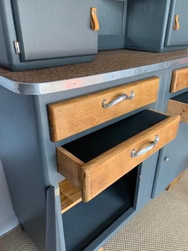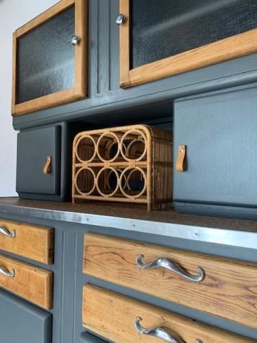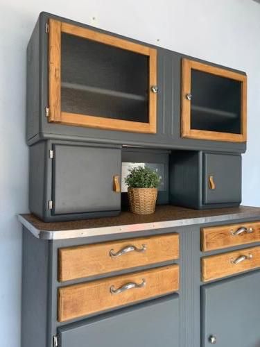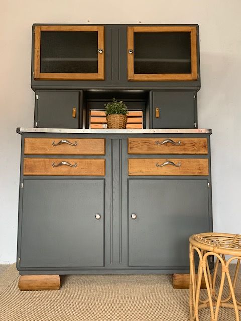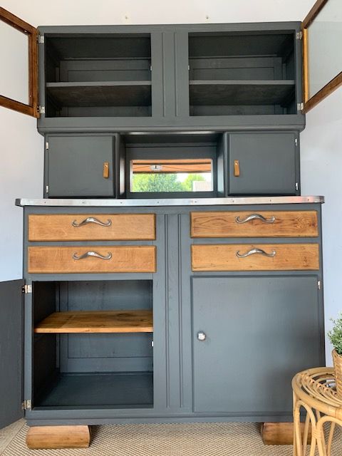 Des meubles chinés puis restaurés pour une deuxième vie. Un soupçon de Vintage pour styler nos intérieurs avec des meubles qui ont une histoire Buffet Mado deux corps Meuble décapé, poncé, traité intégralement (insecticide, fongicide) Couleur: peinture Gris Charbon Satin Boutons "Nickel" et Languettes Cuir sur portes Poignées "Moustaches" d'origine Vitres neuves Miroir niche Neuf Loqueteaux neufs (identique a l'origine) Paumelles neuves Peint intégralement sur toutes ses faces Vernis chêne clair Plateau d'origine dans son jus D'autres photos sur demande Hauteur 1,79m Profondeur 49cm Largeur 1,26m