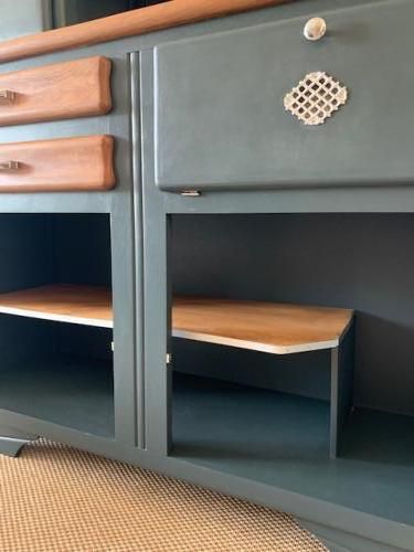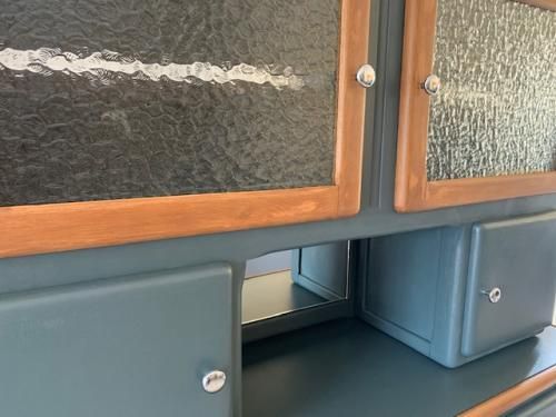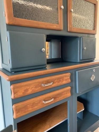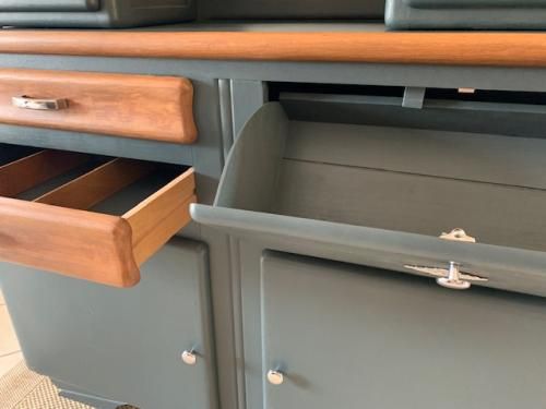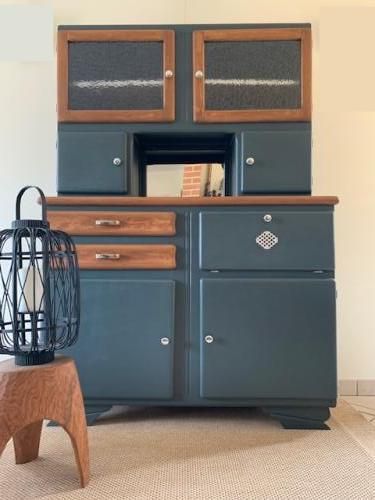 Des meubles chinés puis restaurés pour une deuxième vie. Un soupçon de Vintage pour styler nos intérieurs avec des meubles qui ont une histoire Buffet Mado deux corps Etiquette au dos: 1er prix médaille d'or concours qualité du meuble "seguin" foire de paris 1955. Meuble décapé, poncé, traité intégralement (insecticide, fongicide) Couleur: naval night (vert/gris) Boutons ancien nickelé neufs. Poignées tiroirs d'origine. Vitres neuves. Miroir niche neuf. Loqueteaux neufs (identique a l'origine) Paumelles neuves (identique à l'origine) Peint intégralement sur toutes ses faces. Vernis chêne moyen sur bordure plateau, étagère haute et basse. Plateau peint naval night. Alu sur plateau étagère haute et basse. Niche à pain avec ventilation. D'autres photos sur demande Hauteur 1,82m Profondeur 45cm Largeur 1,31m