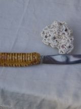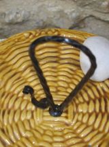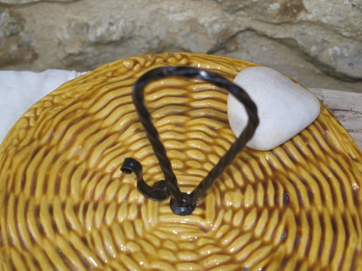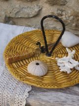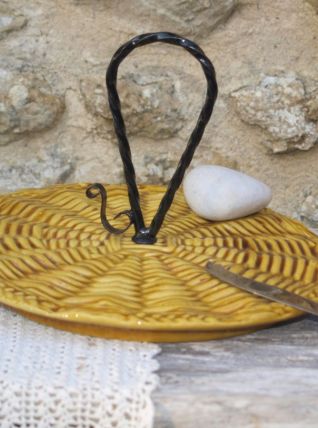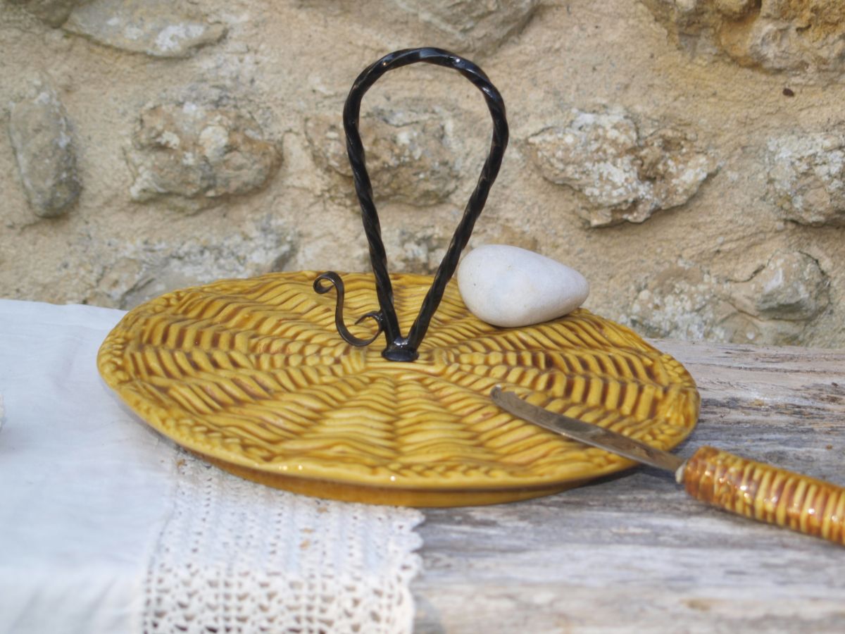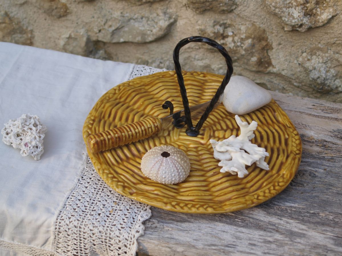Voici un plateau à fromage des faïenceries de Vallauris des années 50 avec son couteau, en poterie imitation paille tressée, poignée et repose couteau en fer forgé noir brillant.