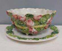 Il est en très bon état et mesure 23 cm de diamètre pour 13 cm de hauteur avec la poignée. Le couteau à fromage mesure 16,5 cm de longueur.