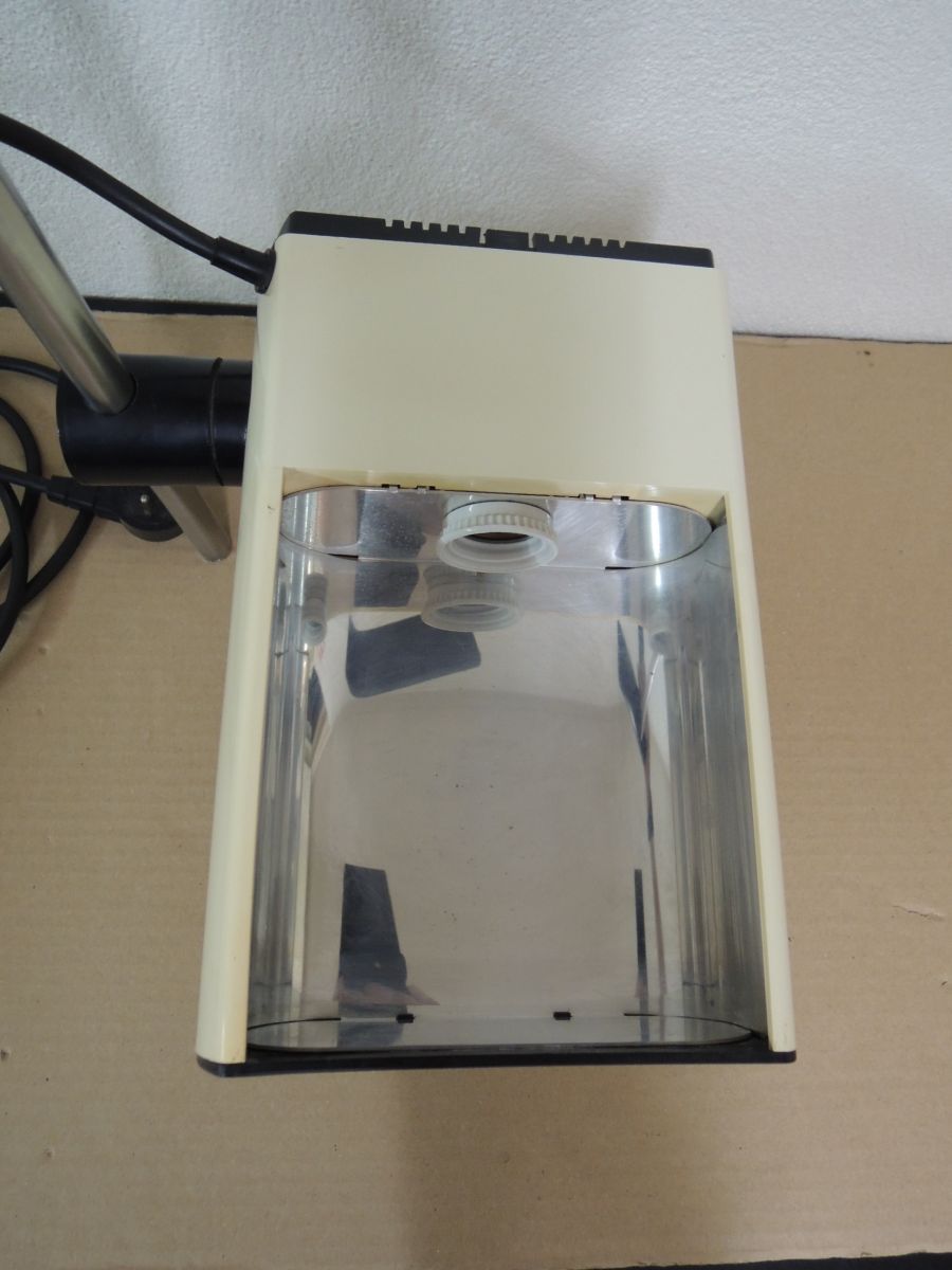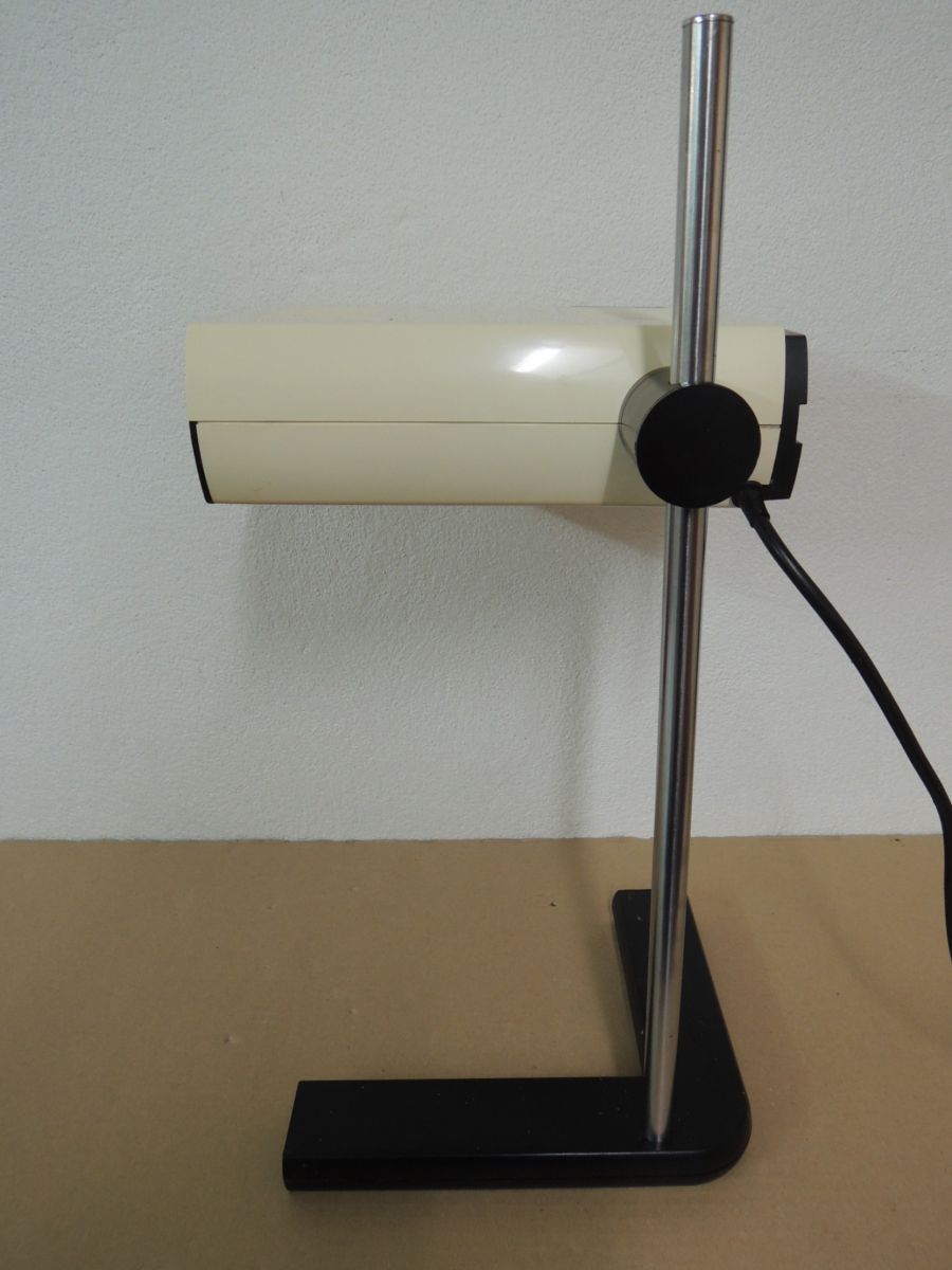Lampe de bureau designé par Jean René Talopp pour la marque Samp en 1972. Le réflecteur plastique est réglable en hauteur, inclinable et peut tourner autour l'axe en acier chromé. Le socle est en fonte habillé de d'une coque plastique. Les composants électriques sont d'origine et ont été contrôlés. La douille est à vis de type E27, (douille cuivre avec collerette céramique). Traces et marques d'usage et du temps.