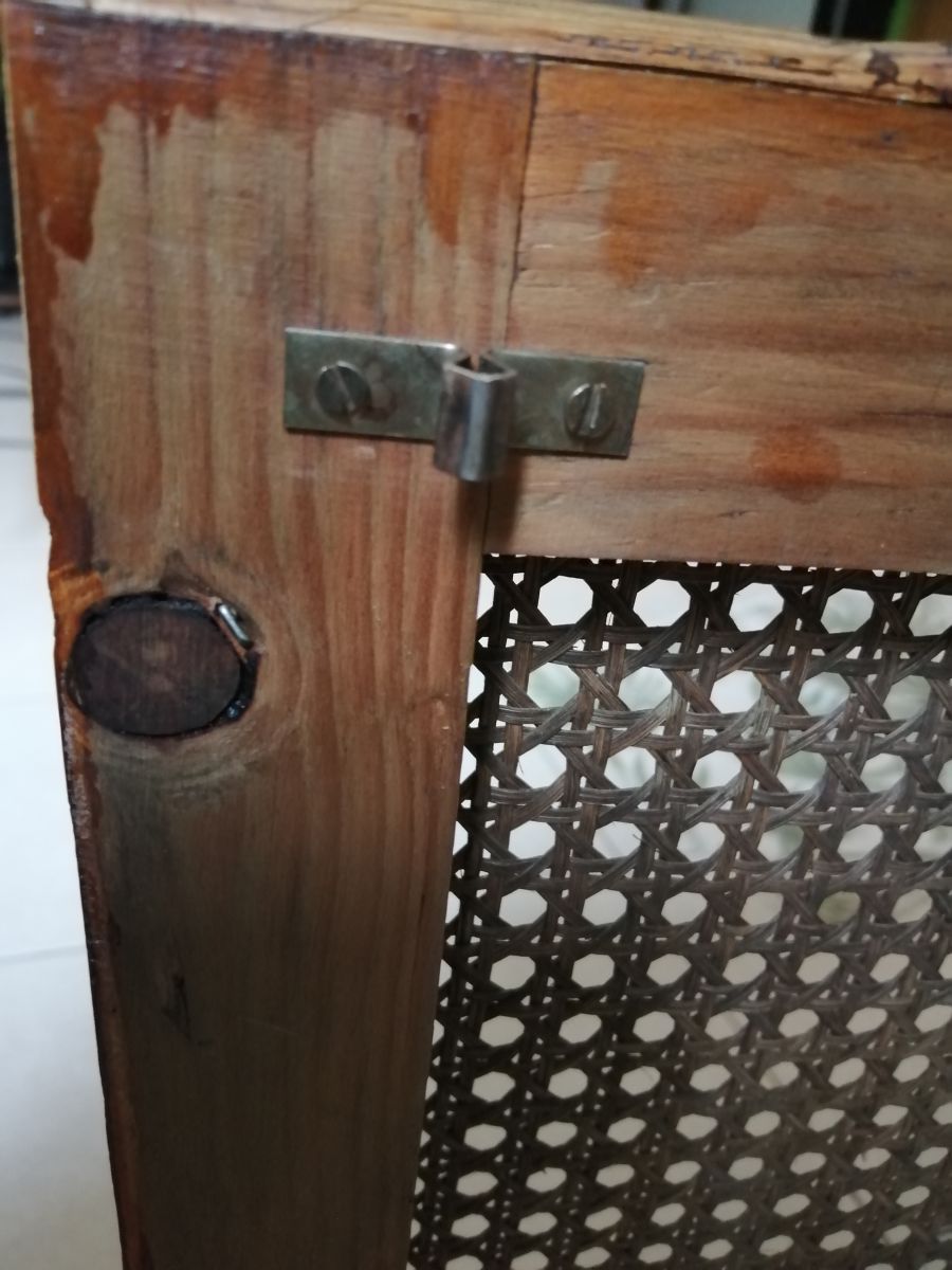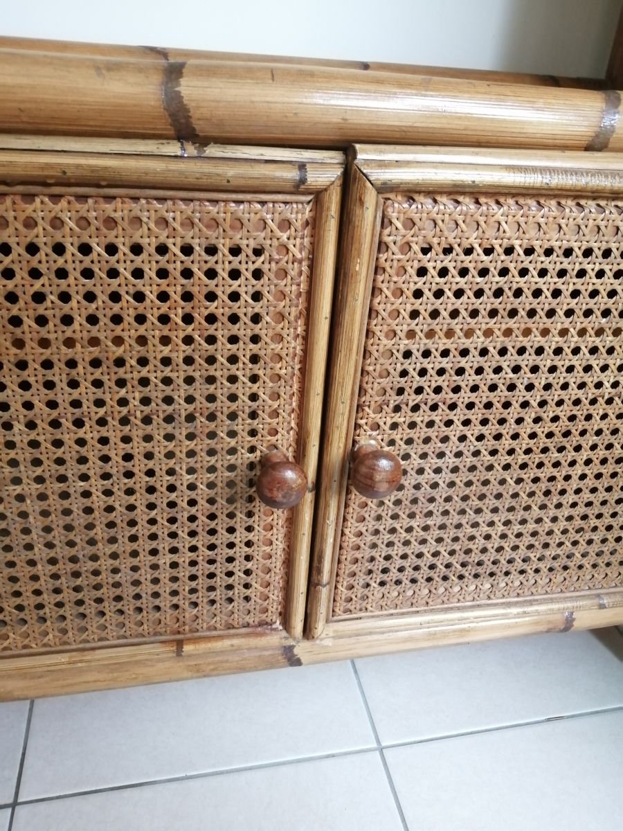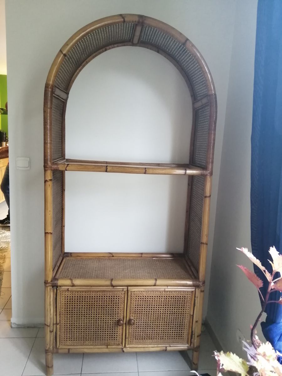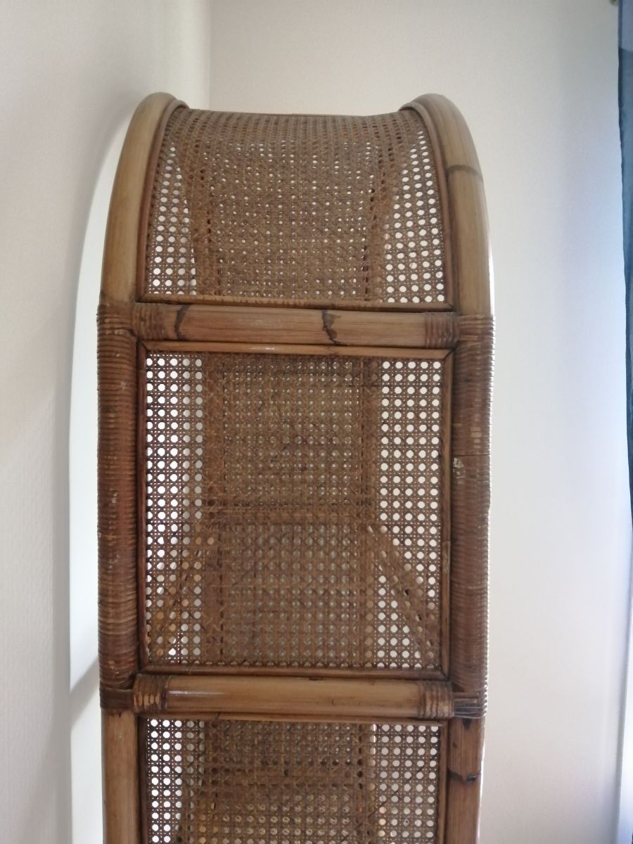 Bibliothèque /étagère en rotin et cannage, haut en arc de cercle, 1 étagère en verre et 1 rangement bas avec 2 portes en cannage. Probablement année 70.