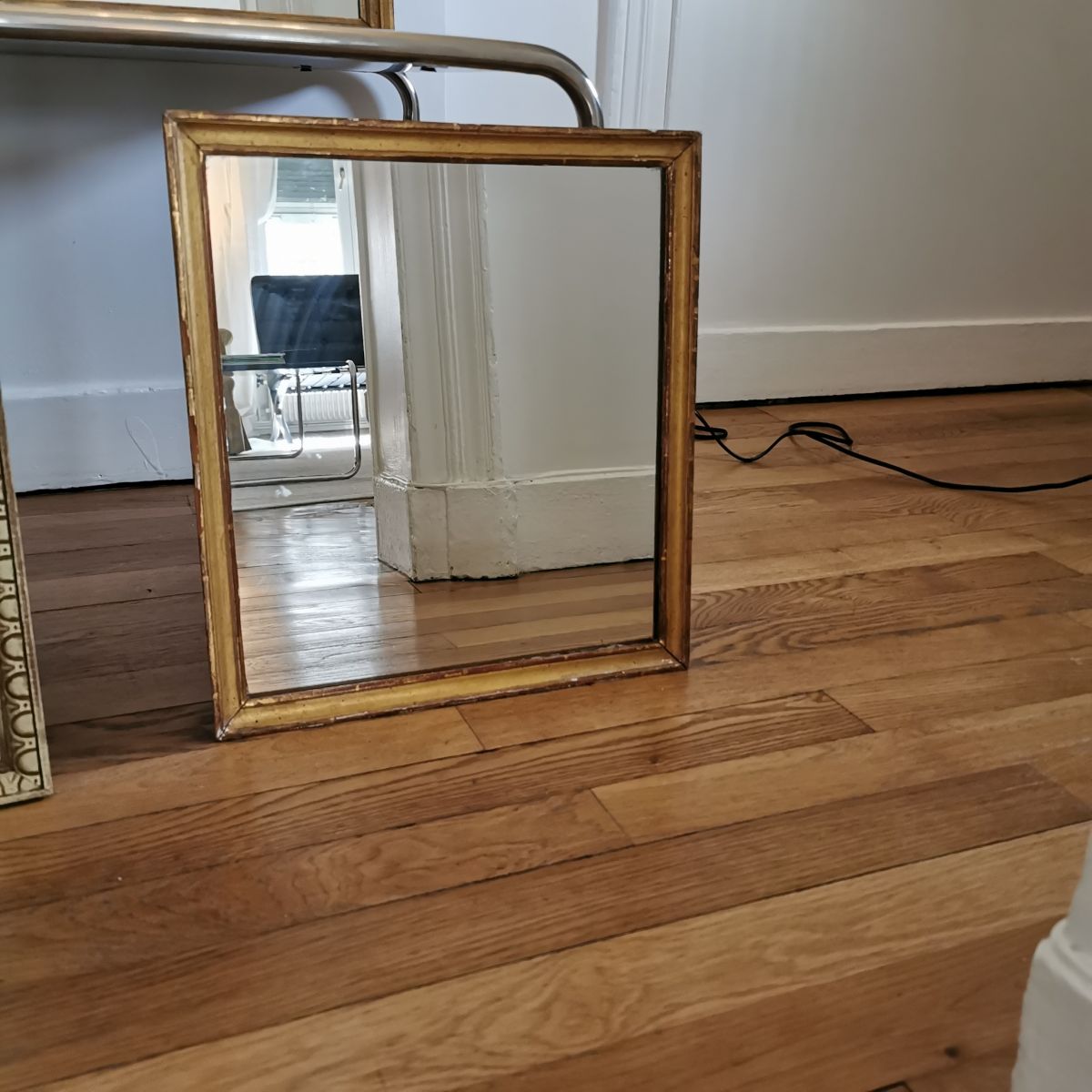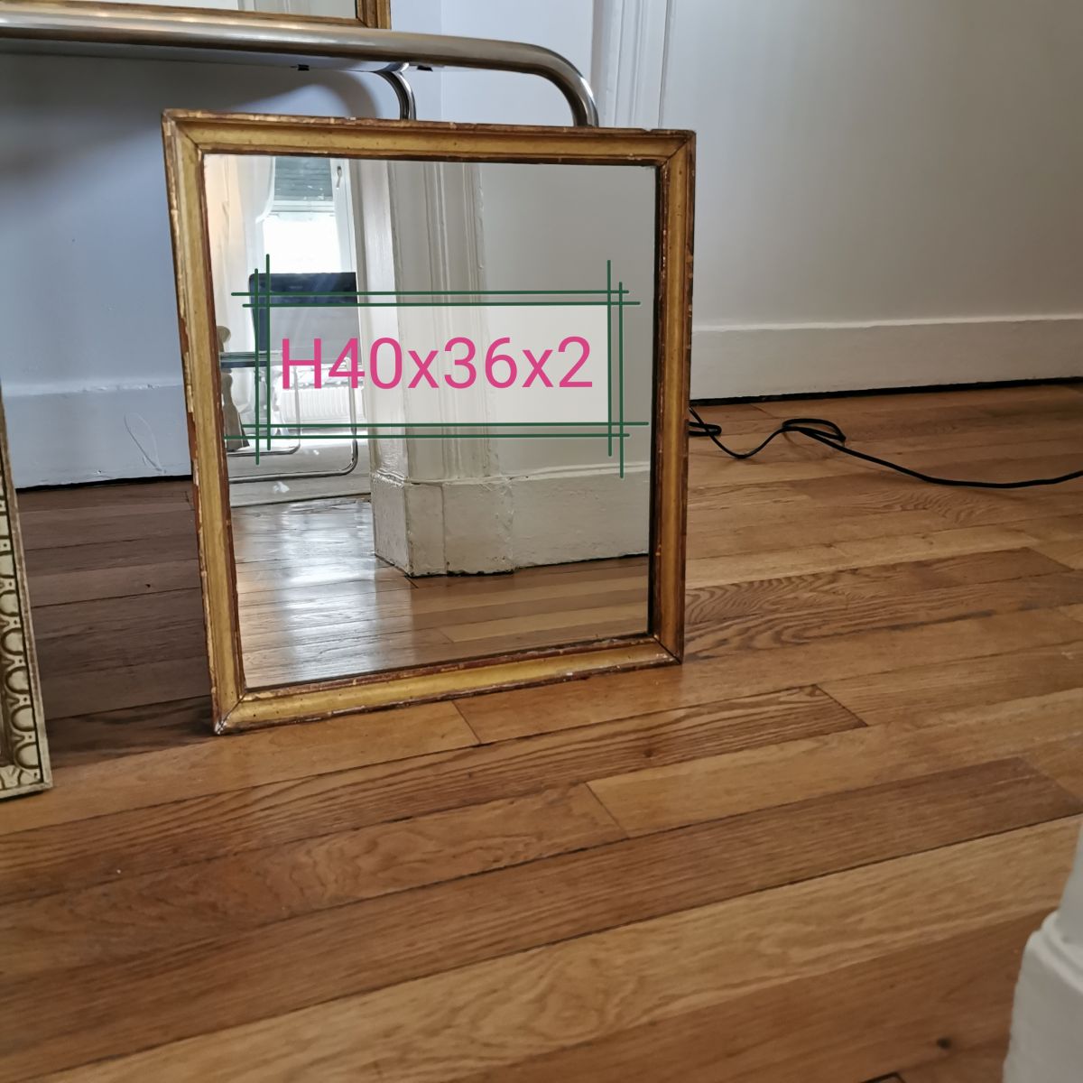 Joli miroir au format rectangulaire avec boiseries simples et élégantes. Le cadre est en bois plâtre avec quelques éclats de plâtre. Le miroir à été remplacé car l'ancien était cassé.