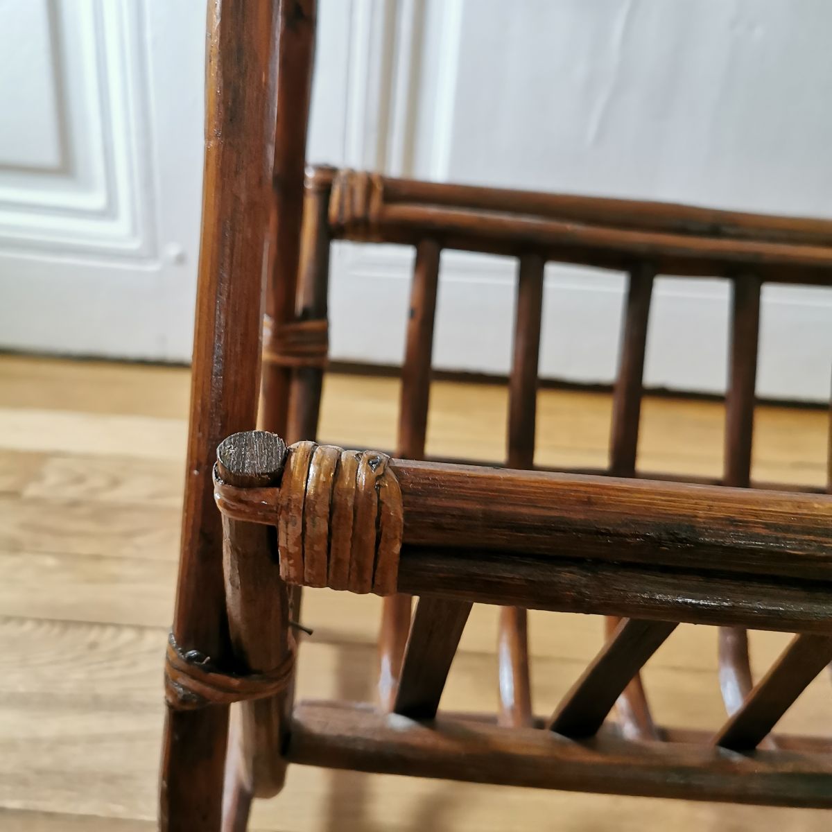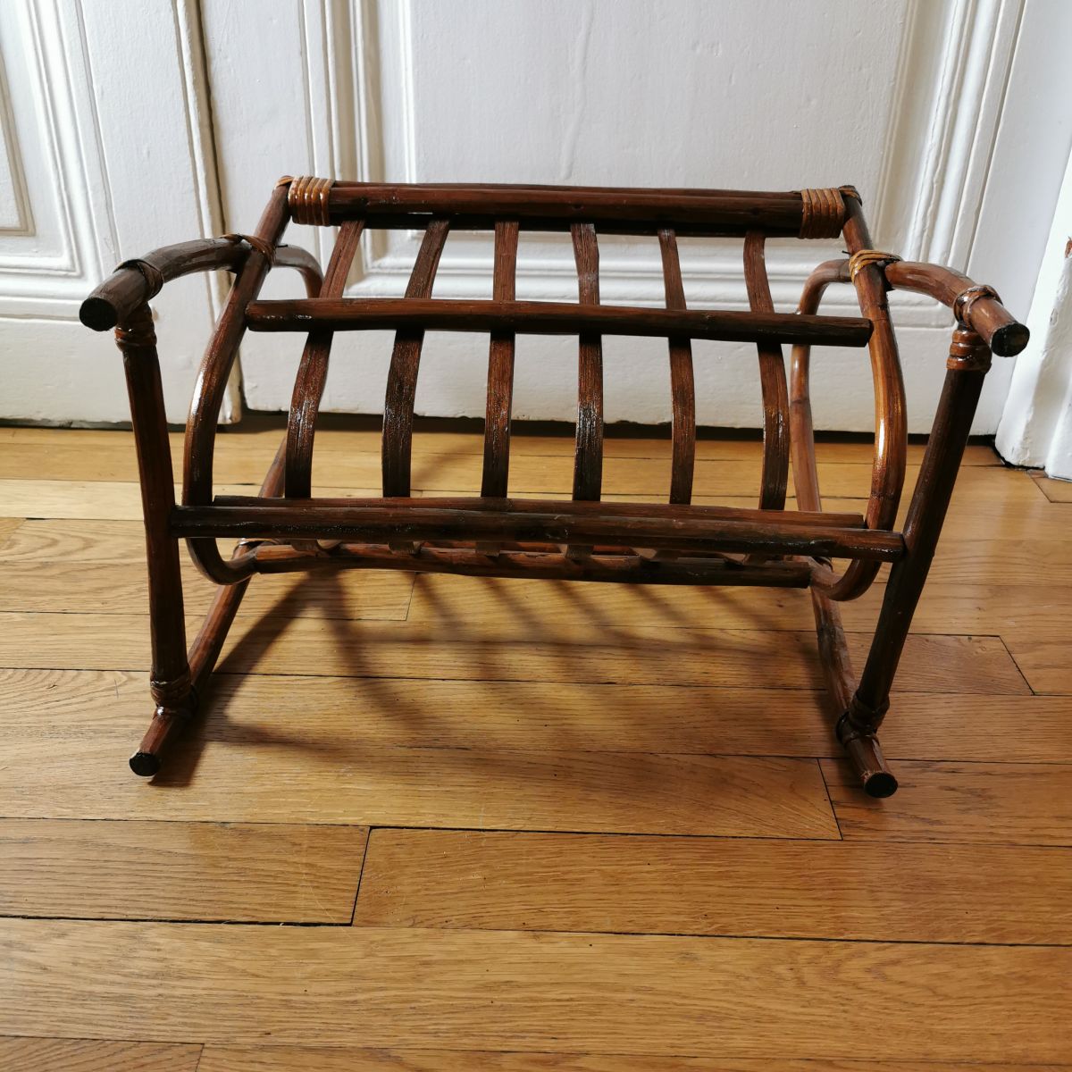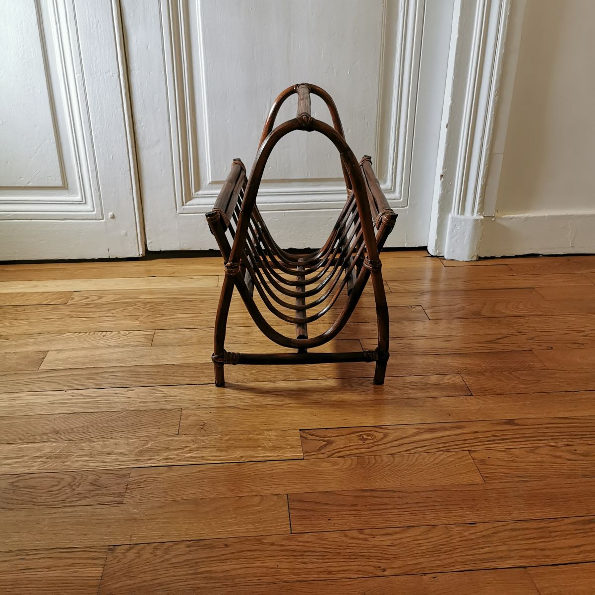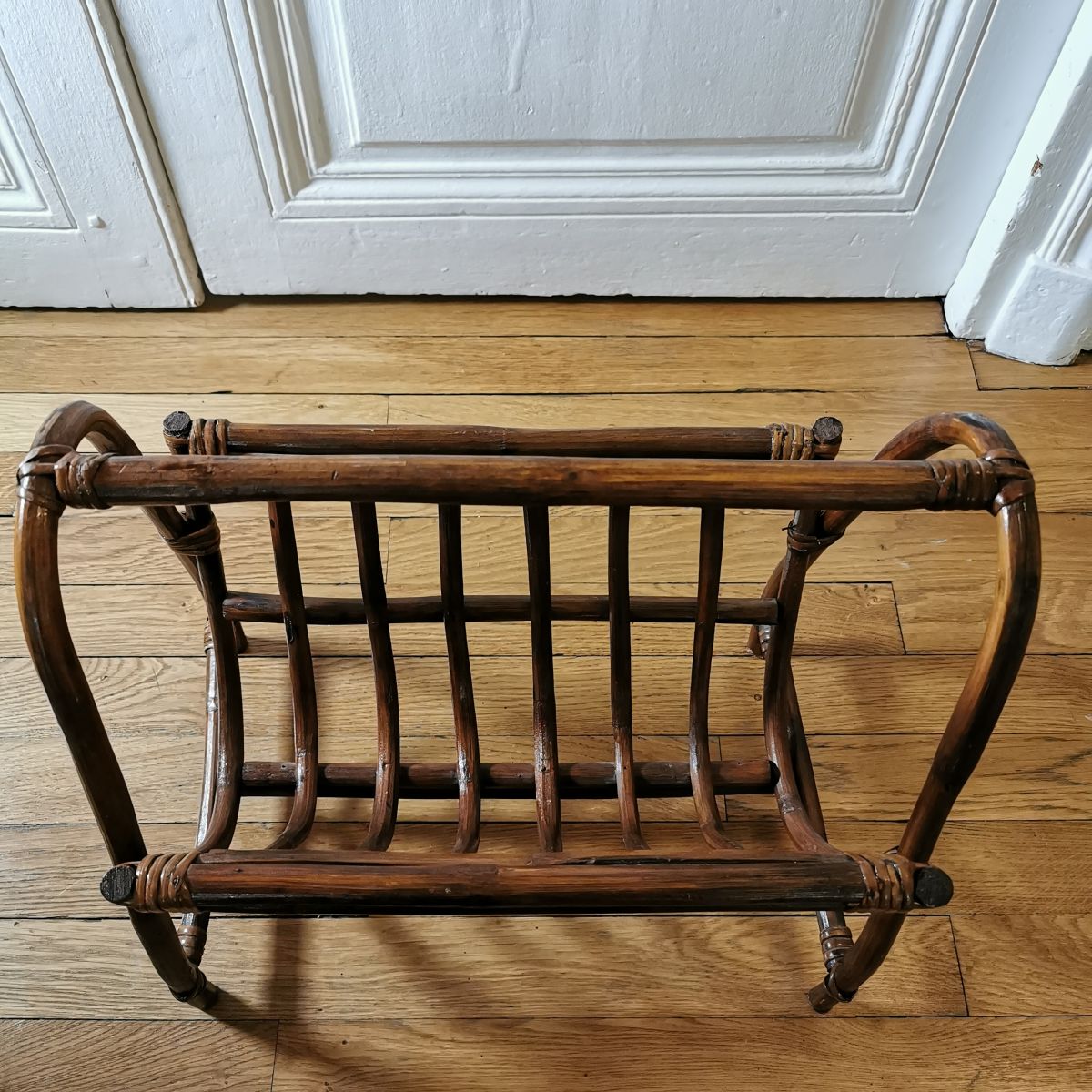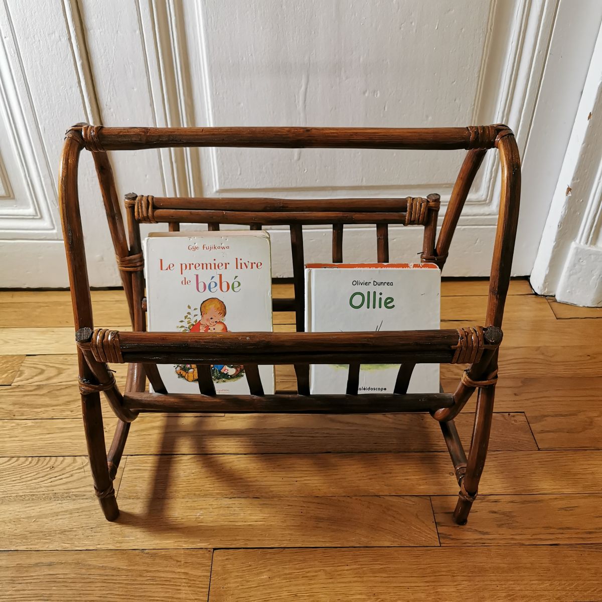 Porte revue en bambou et rotin en plein dans la tendance. Il est en très bon état. De couleur miel foncé. Il est très léger. Très joli décor pour une chambre d'enfant. Il ira parfaitement aussi avec des livres d'adultes dans un coin lecture.