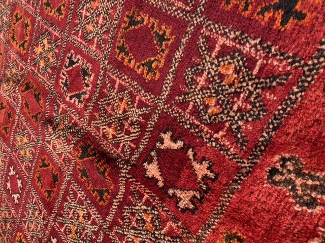 Notre passion pour la décoration d'intérieure et le tapis s’exprime aussi en partageant avec vous une partie de nos plus belles pièces déniché dans les marchés, les villages et les montagnes du Maroc comme ce tapis de famille en excellente laine généreuse et super douce et un dos magnifiquement décorée en motif berbère. La couleur principale est un rouge chaud intense, avec des motifs éclectiques en divers couleurs.