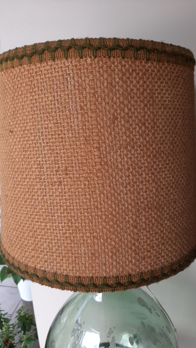 Belle lampe dame Jeanne. Le pied est en verre vert avec quelques coulures à la bougie. L'abat-jour festonné est en toile de jute beige .