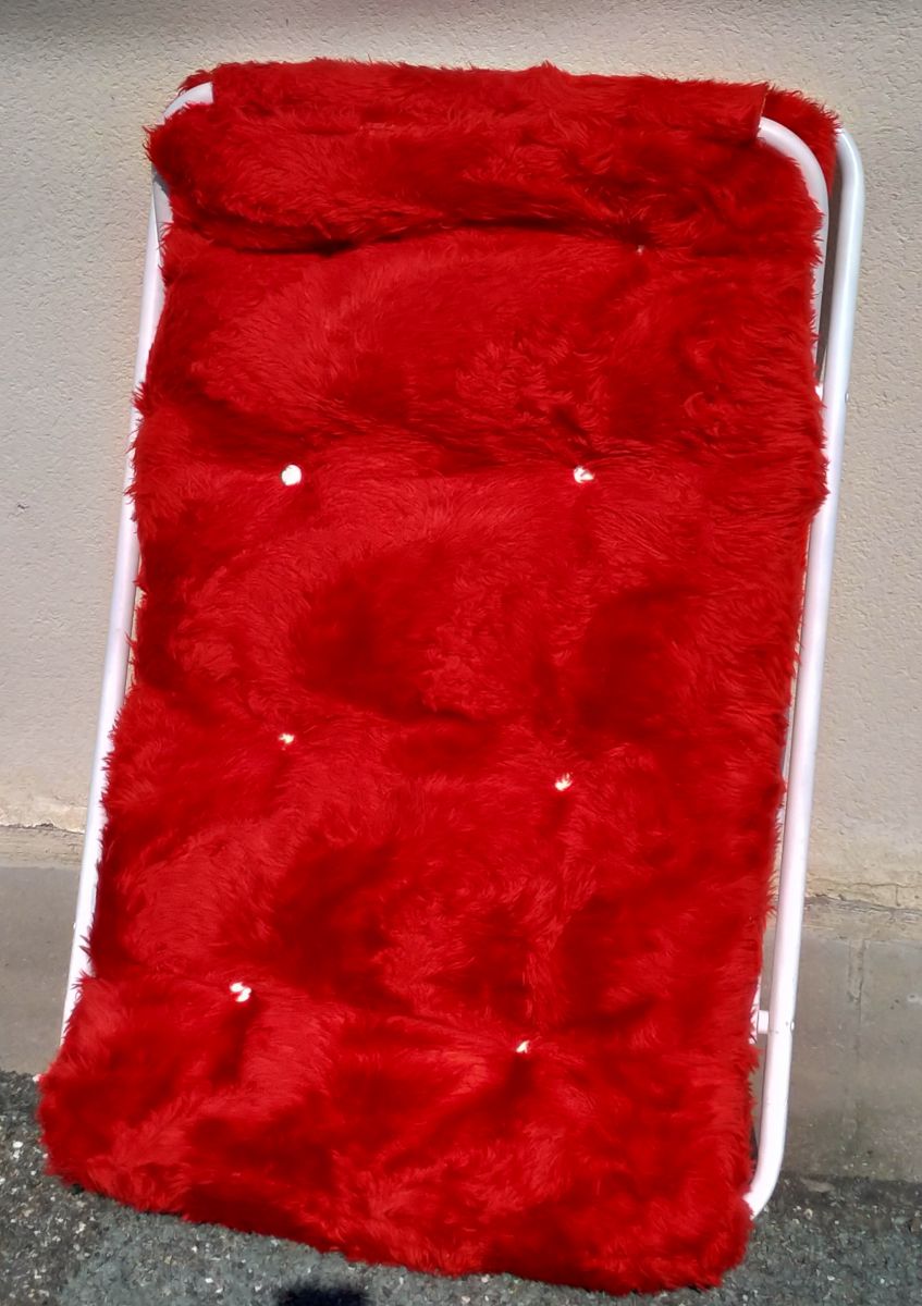 Fauteuil pliable en fausse fourrure rouge et structure tubulaire blanche. Assise capitonnée. Produit rare.