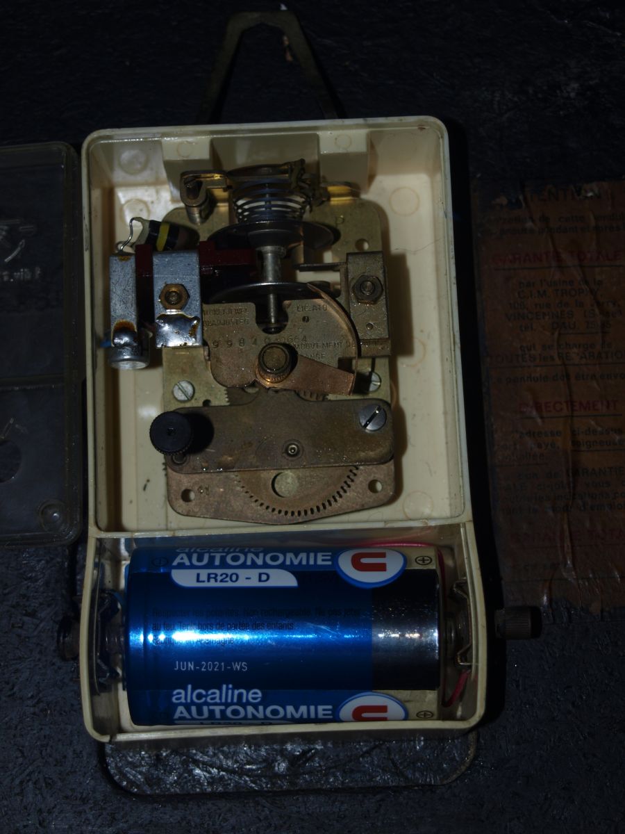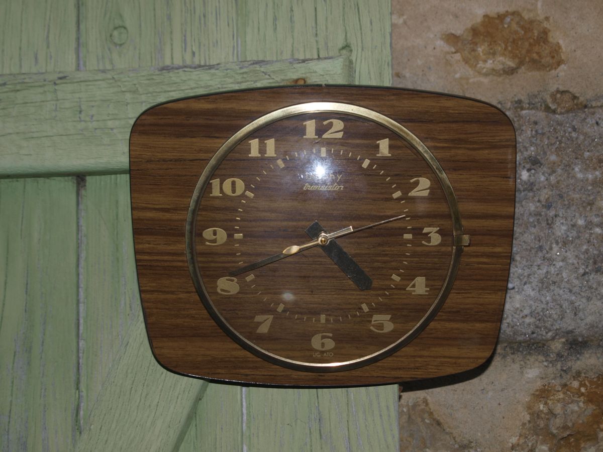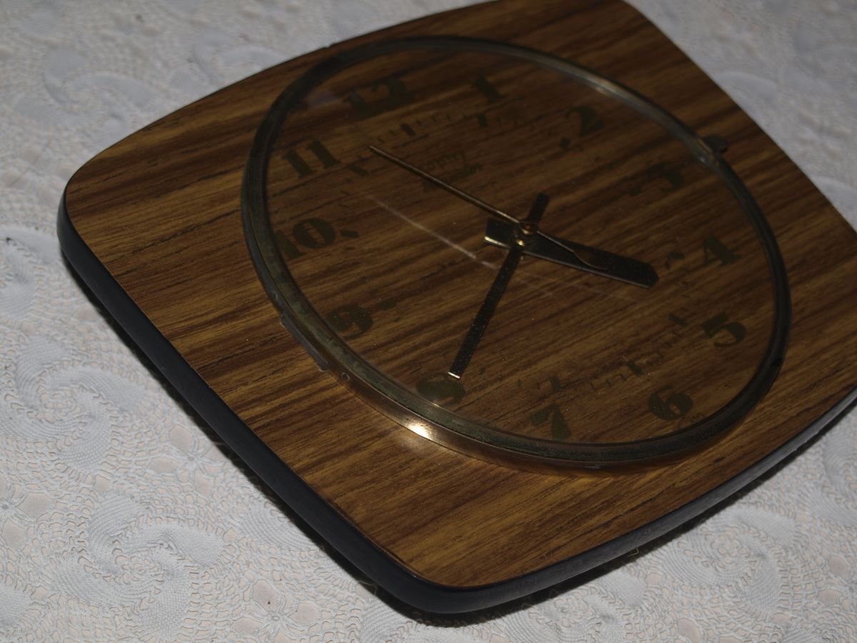 Voici une horloge de cuisine vintage, de marque Trophy Transistor des années 60. Revêtement en formica marron. Chiffres et aiguilles dorés. Cadran en verre ouvrant. Elle a son MECANISME D'ORIGINE qui fonctionne bien (voir photos boîtier ouvert)