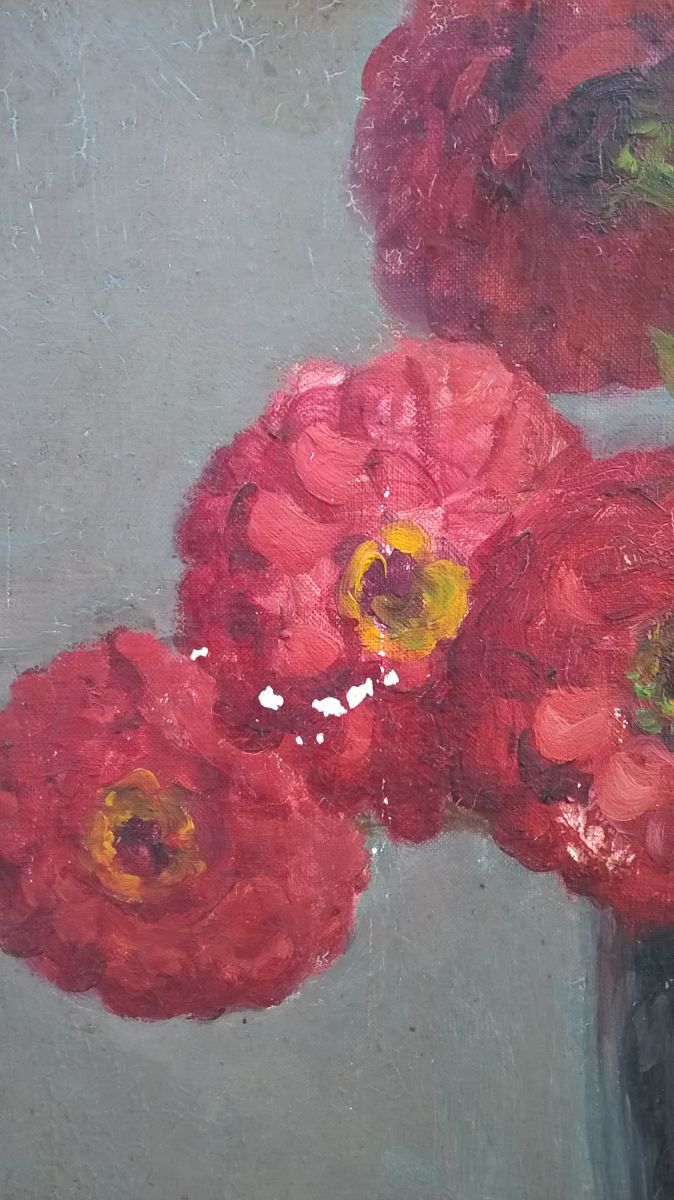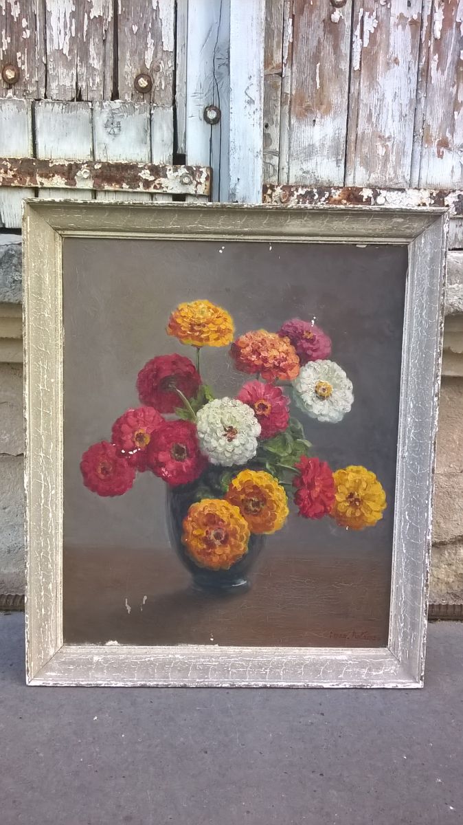 Tableau bouquet de fleurs. Sur toile. Signée marc antoine. Quelque marque d usure. hauteur cadre 69.5 sur 59 cm de largeur. toile 61 sur 49 cm de largeur