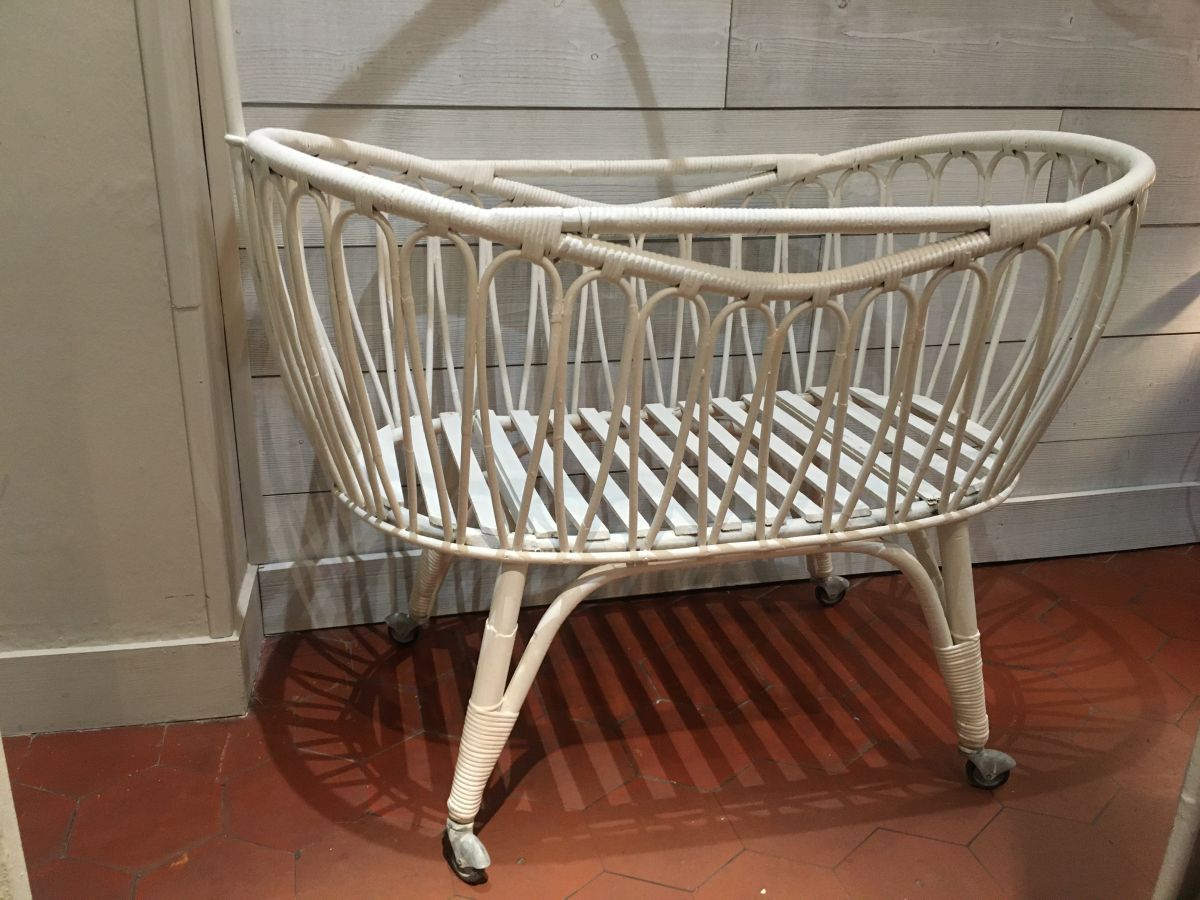 Berceau de bébé en rotin, peint en blanc par de précédent propriétaires. J'ai repeint quelques manque de peinture,. Quelques traces d'usures.