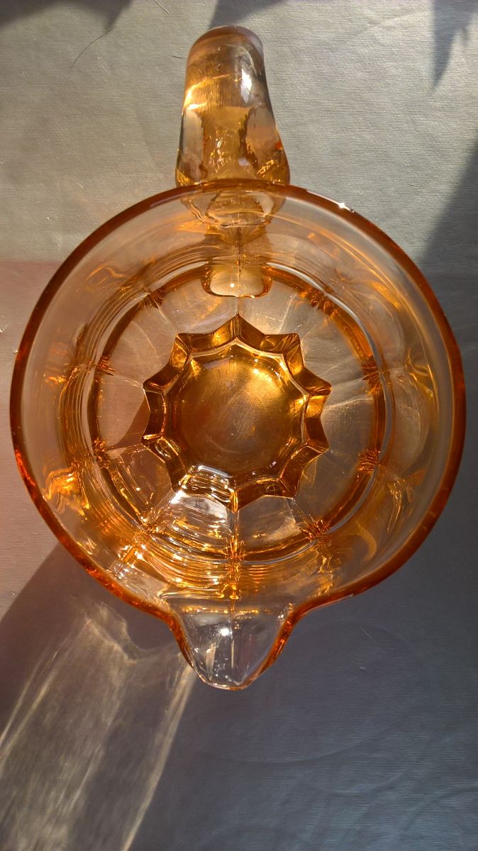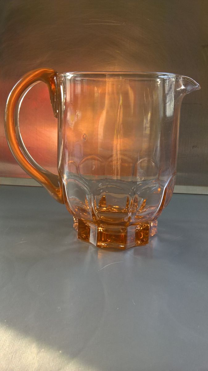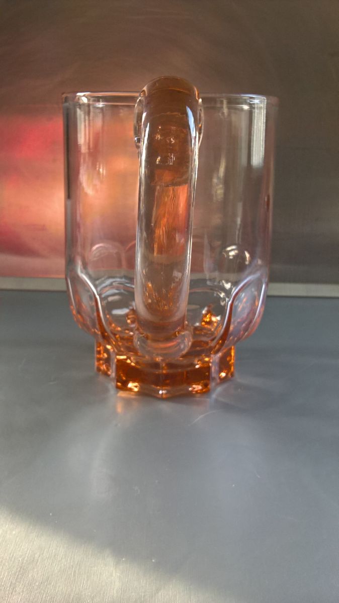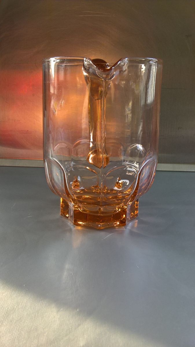 Pichet en verre moulé teinté vieux rose. Contenance: 1, 3 litre.