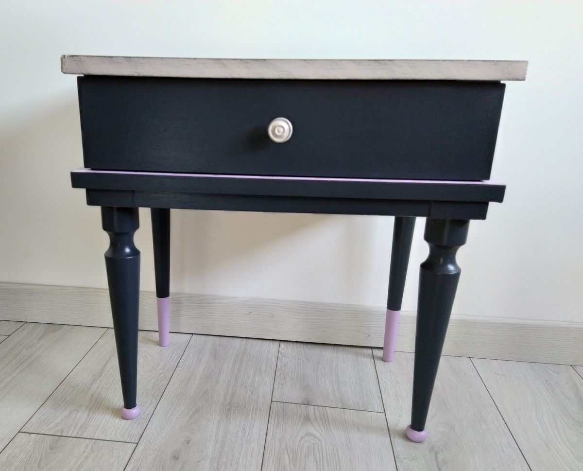 Table de chevet de style vintage scandinave au relooking très girly. Corps en bois aggloméré, pieds en bois massif, très bon état d'origine à part un petit bobo sur le coin avant gauche.