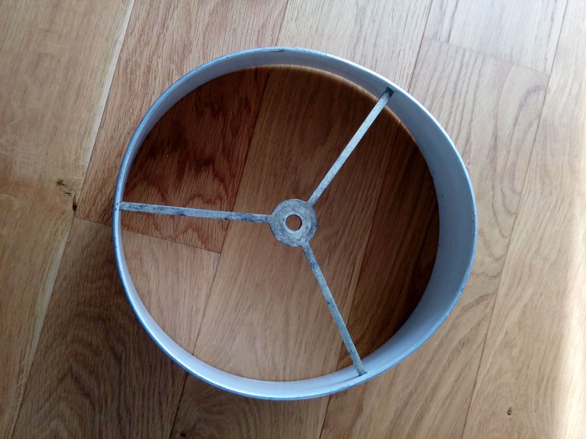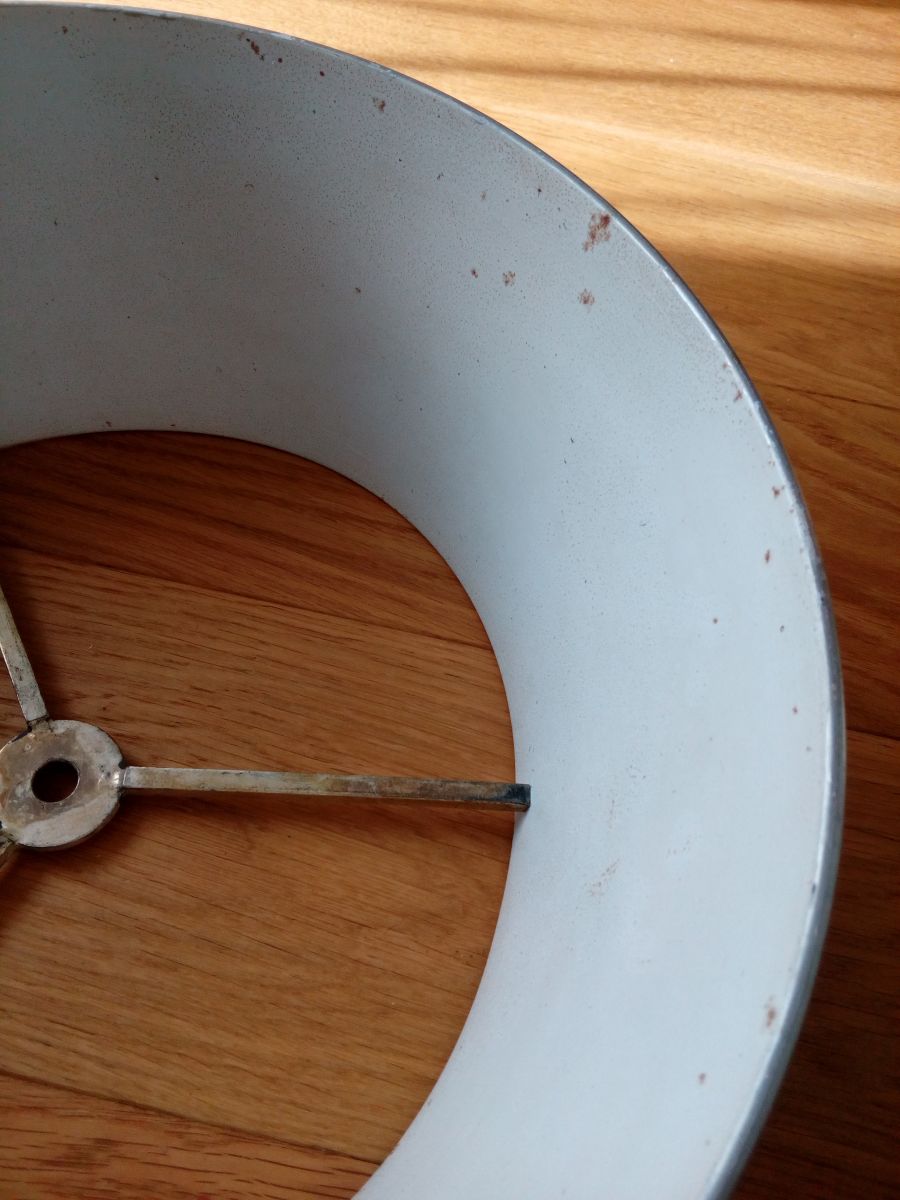 Envie de changer l'abat-jour de votre lampe bouillotte ? En voici un de couleur rouge bordeaux foncé, tirant sur le brun avec pour décor deux liserés argentés (motif feuilles). Il est en fer assez épais, peint en blanc à l'intérieur. Il est encore solide, mais comporte les traces de son âge : rayures et tâches diverses sur les deux faces, et points de rouille superficielle en face interne. Il mesure 32 cm de diamètre bas et 26,5 cm de diamètre haut, pour une hauteur de 13 cm. L'orifice pour la fixation sur le pied de lampe est un cercle de 1,2 cm de diamètre. Il pèse 600g.
