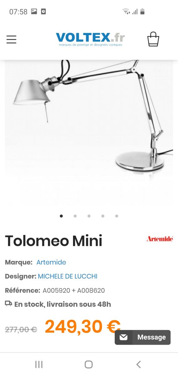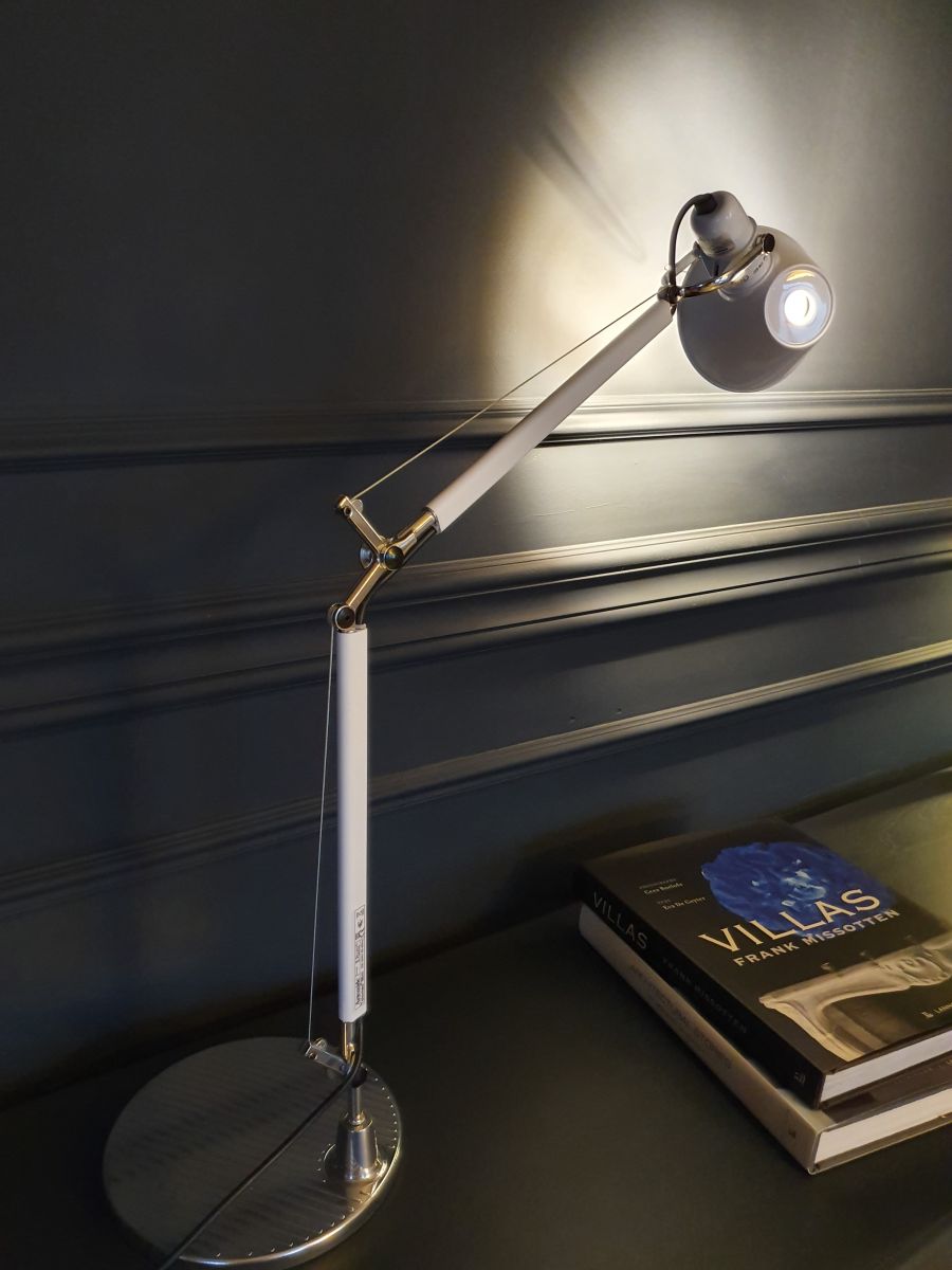 best sellers de la marque Artemide. Cette lampe de table ou de bureau dessinée par Michele de Lucchi est très élégante et très pratique. La base et la structure à bras articulés sont en aluminium poli. Le diffuseur orientable dans toutes les directions est en aluminium anodisé. Chaque élément est minutieusement travaillé : les rotules et supports sont en aluminium brillant. Enfin, Toloméo est équilibrée par un système à ressorts.