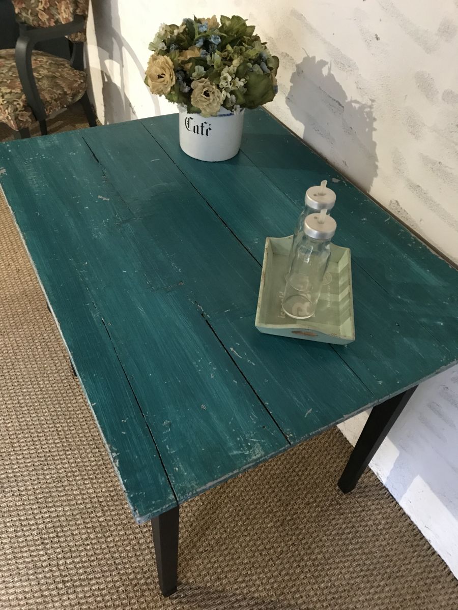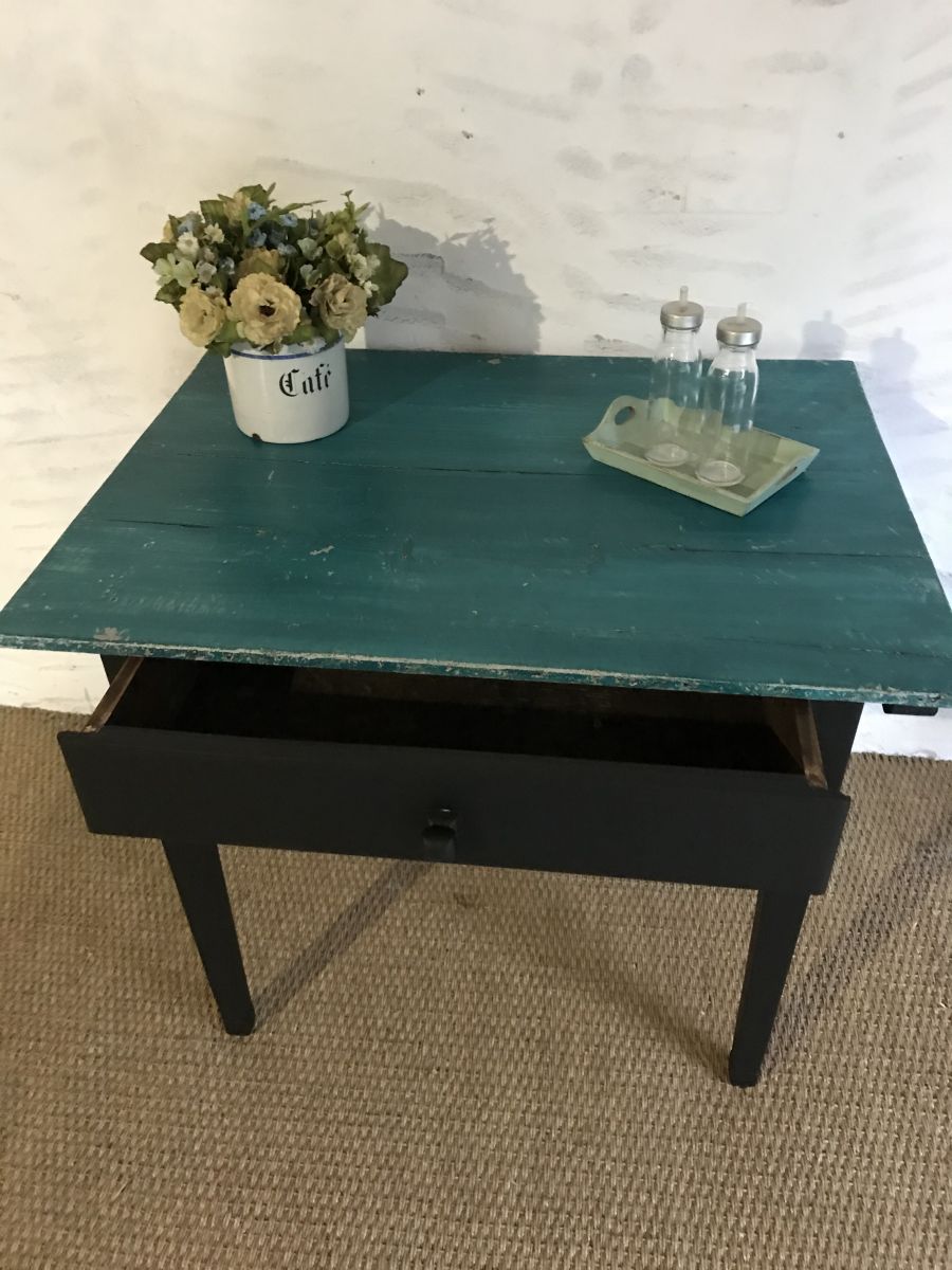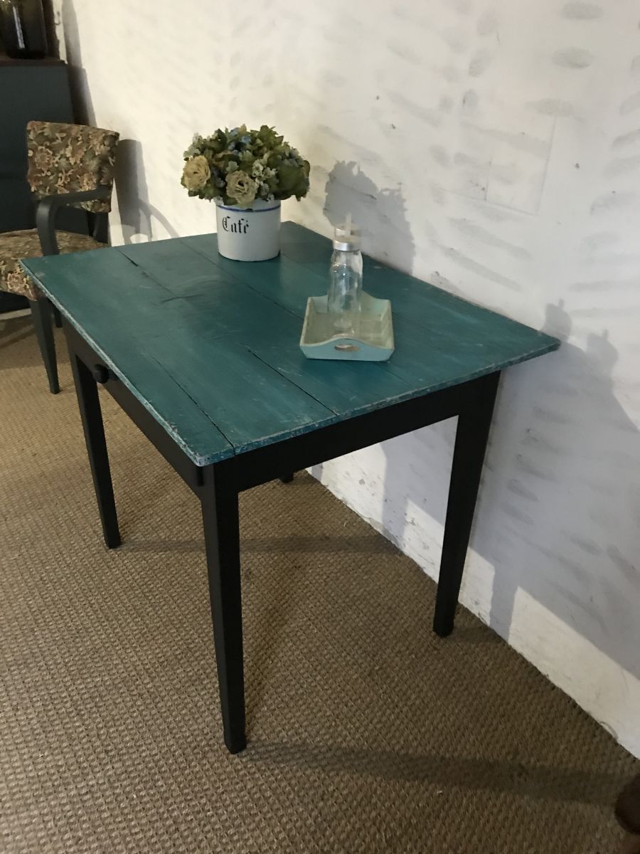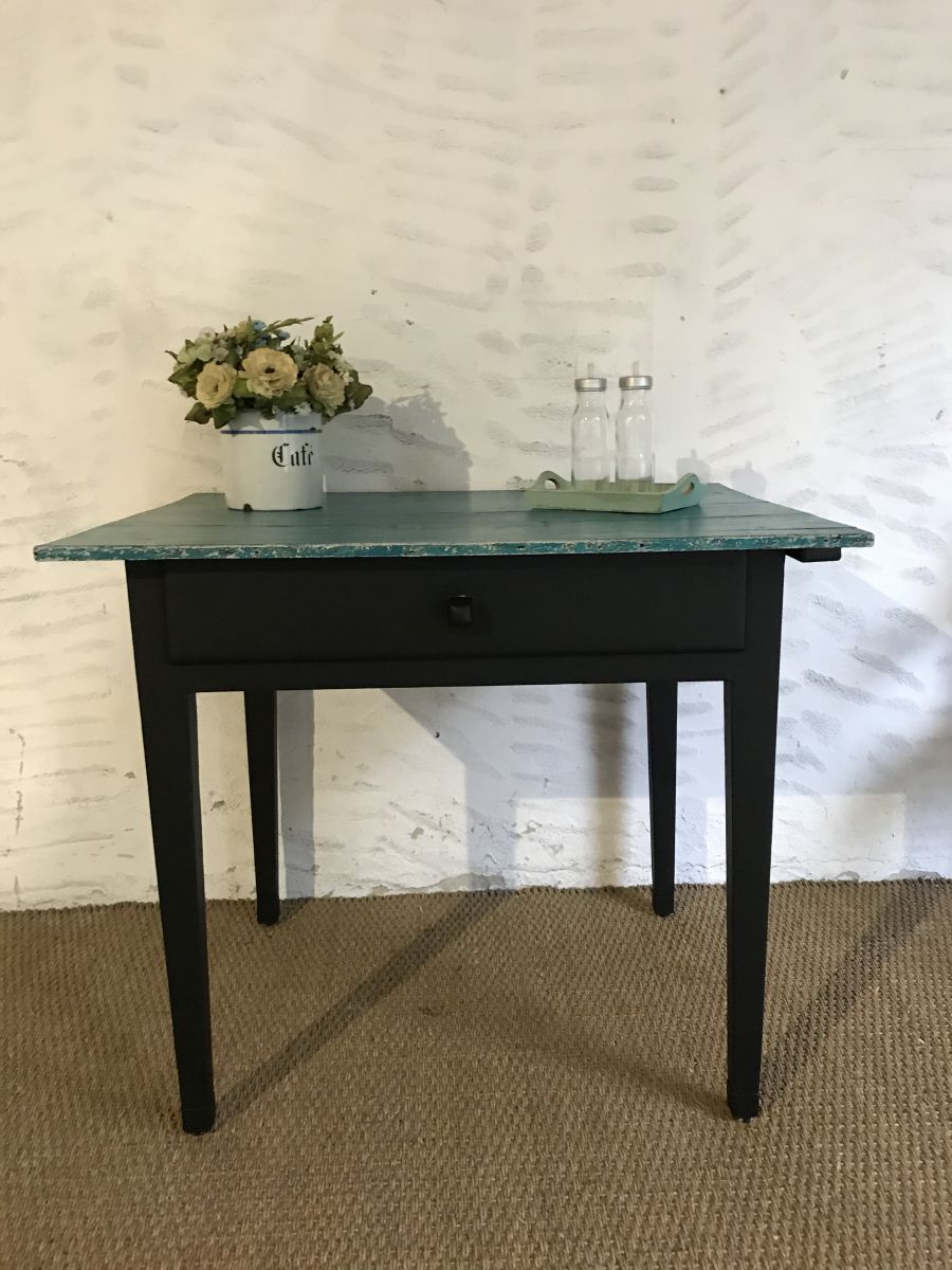 Piétement noir et plateau bleu esprit usé, patiné, vieilli