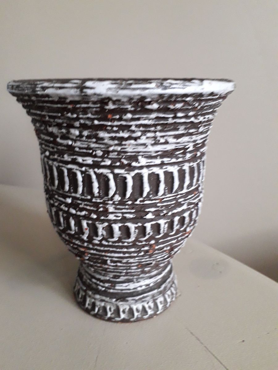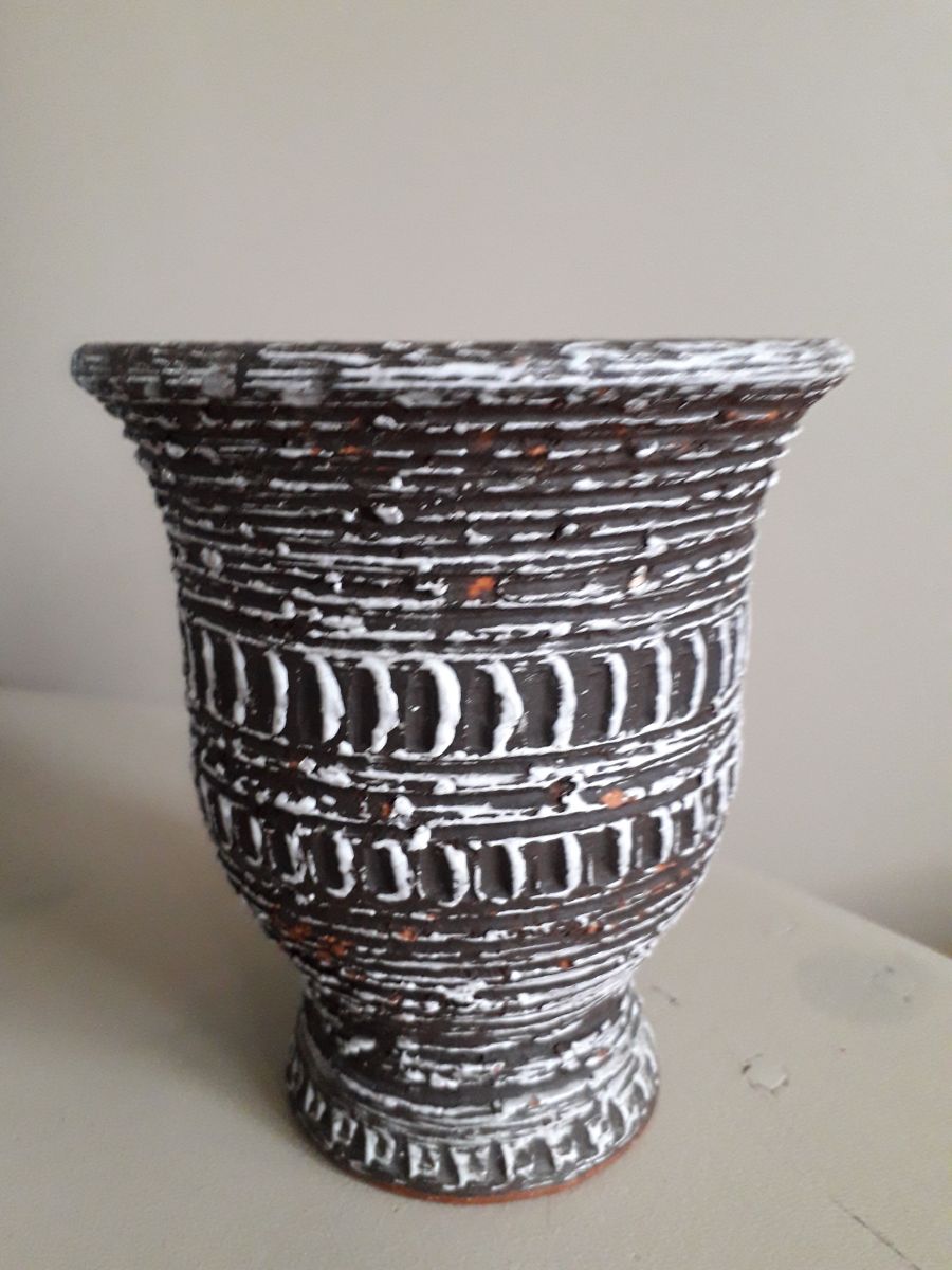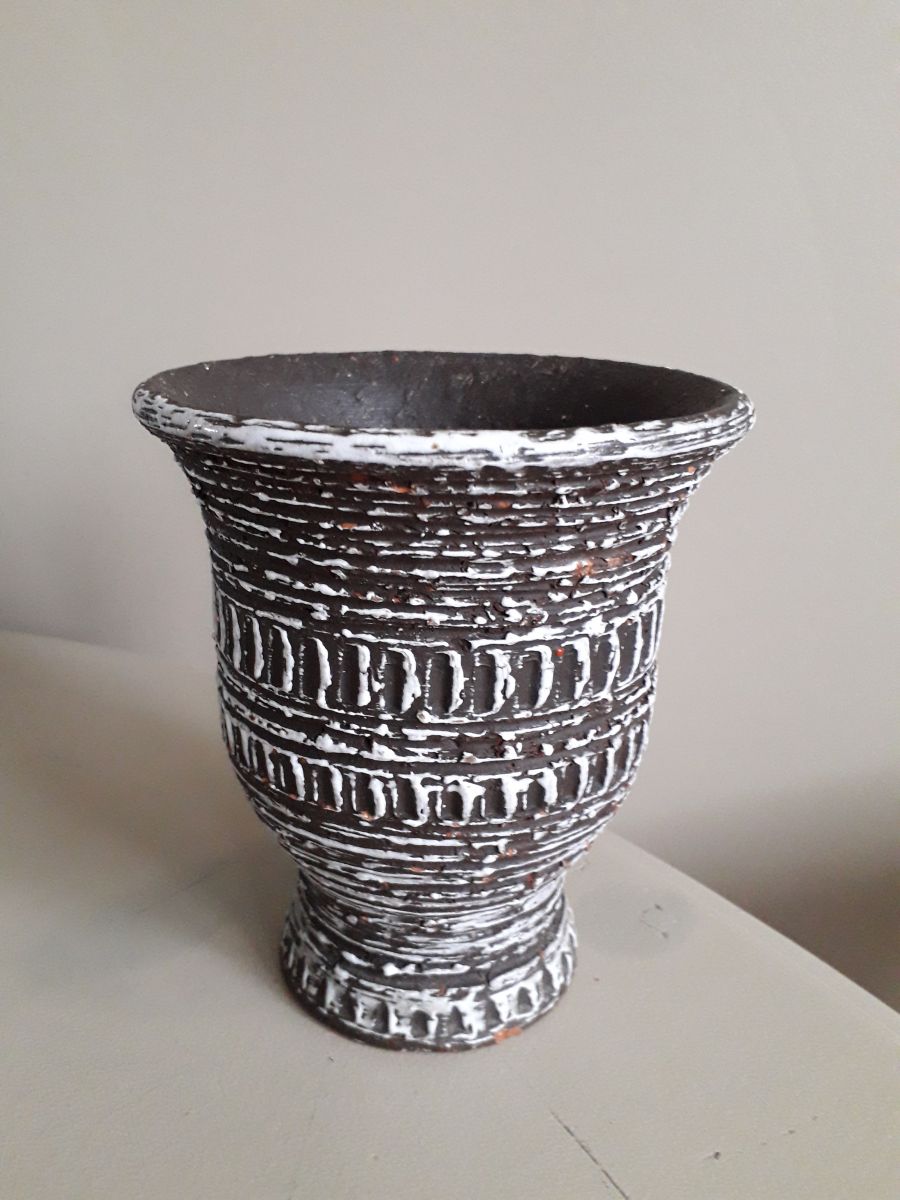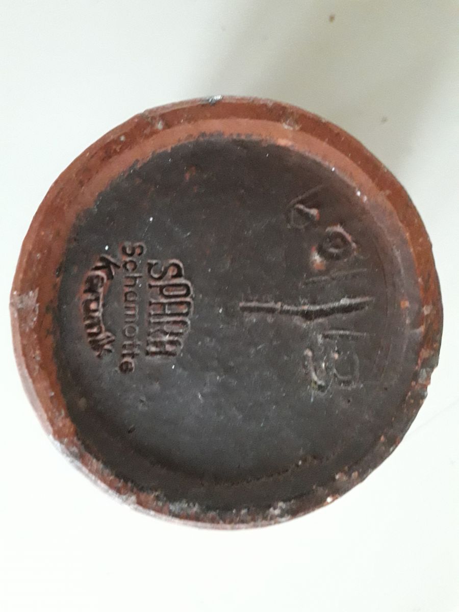 Vase vintage en céramique allemande signé SPARRA. L'engobe est chocolat avec des motifs géométriques en relief.
