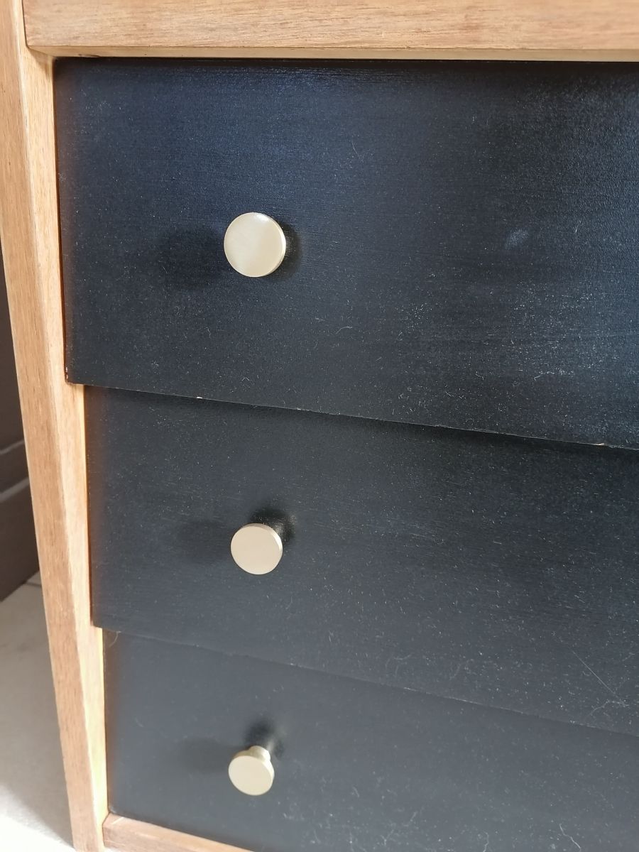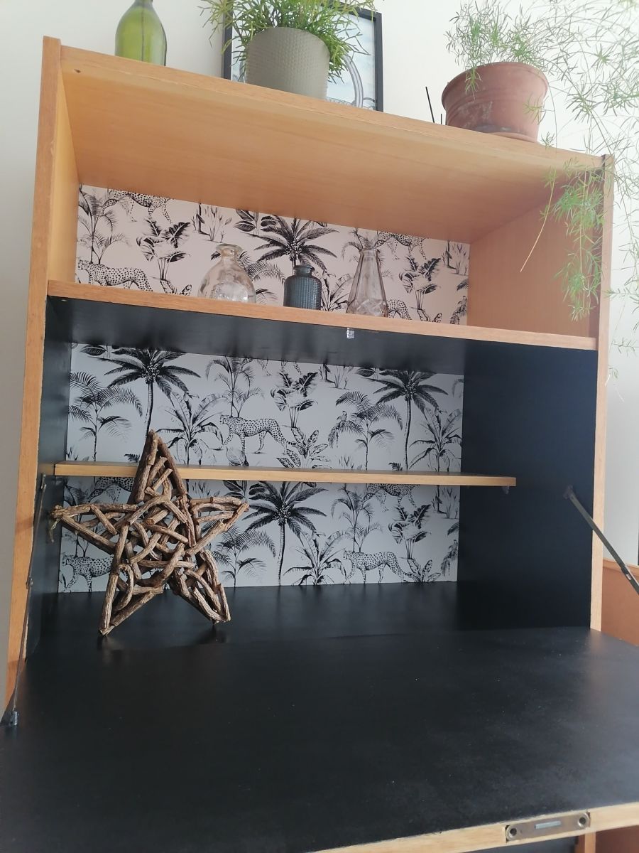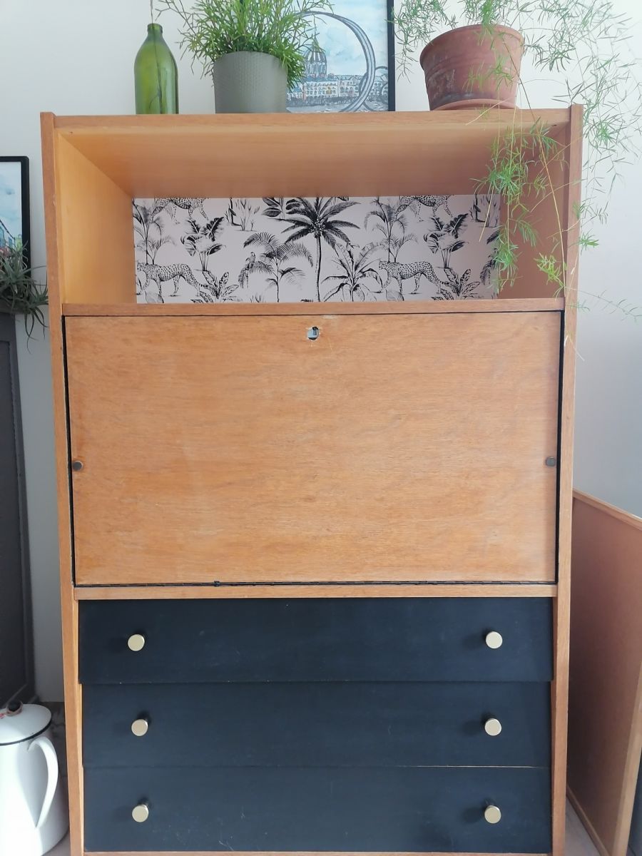 Transformation apportée : peinture des tiroirs et des parois intérieures en noir, boutons changés, papier peint jungle noir et blanc en fond de meuble, tablette rabaissée, butoirs transparents.