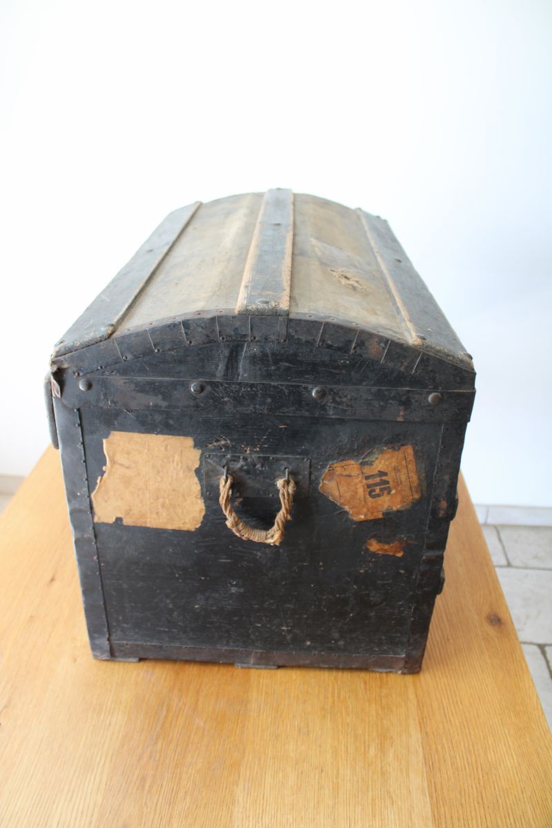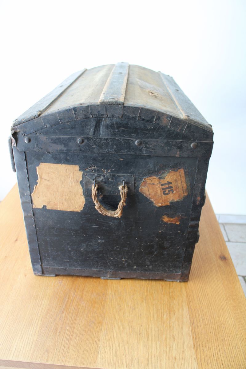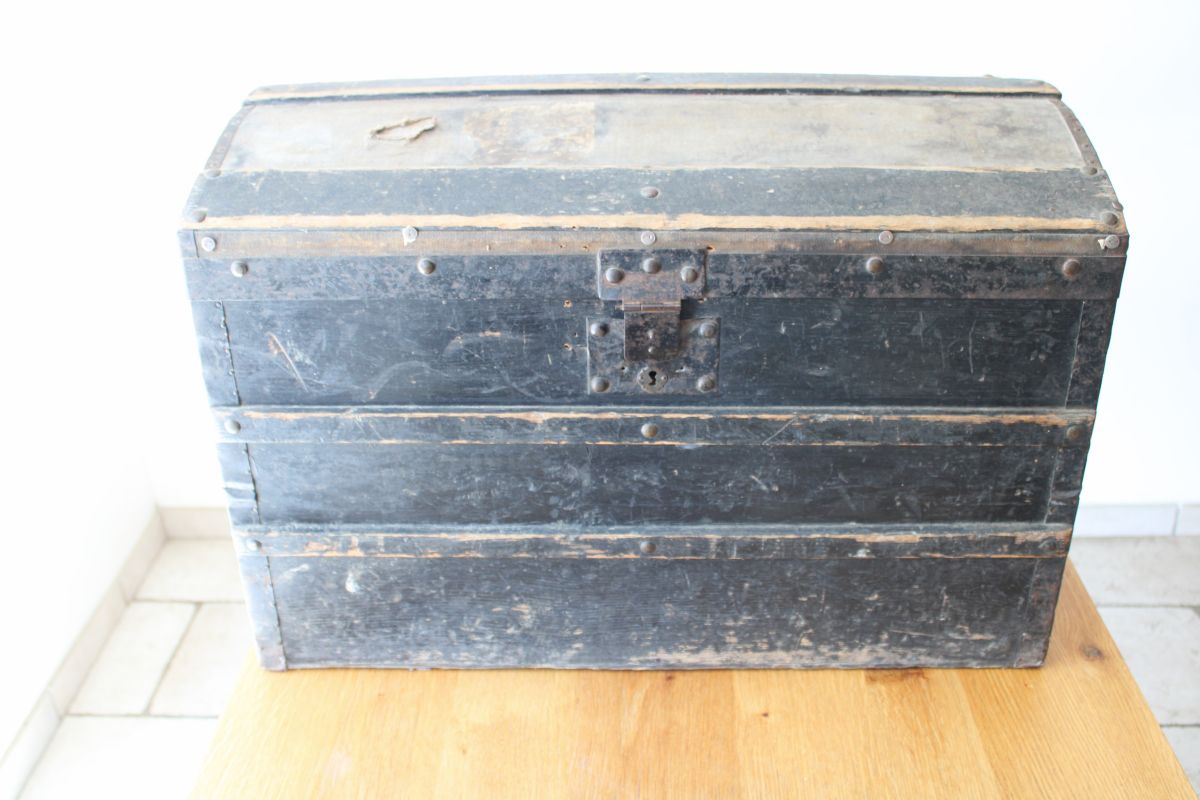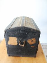 En bois, cerclages et renforts en acier, cloutés. Loqueteau de fermeture en fer.