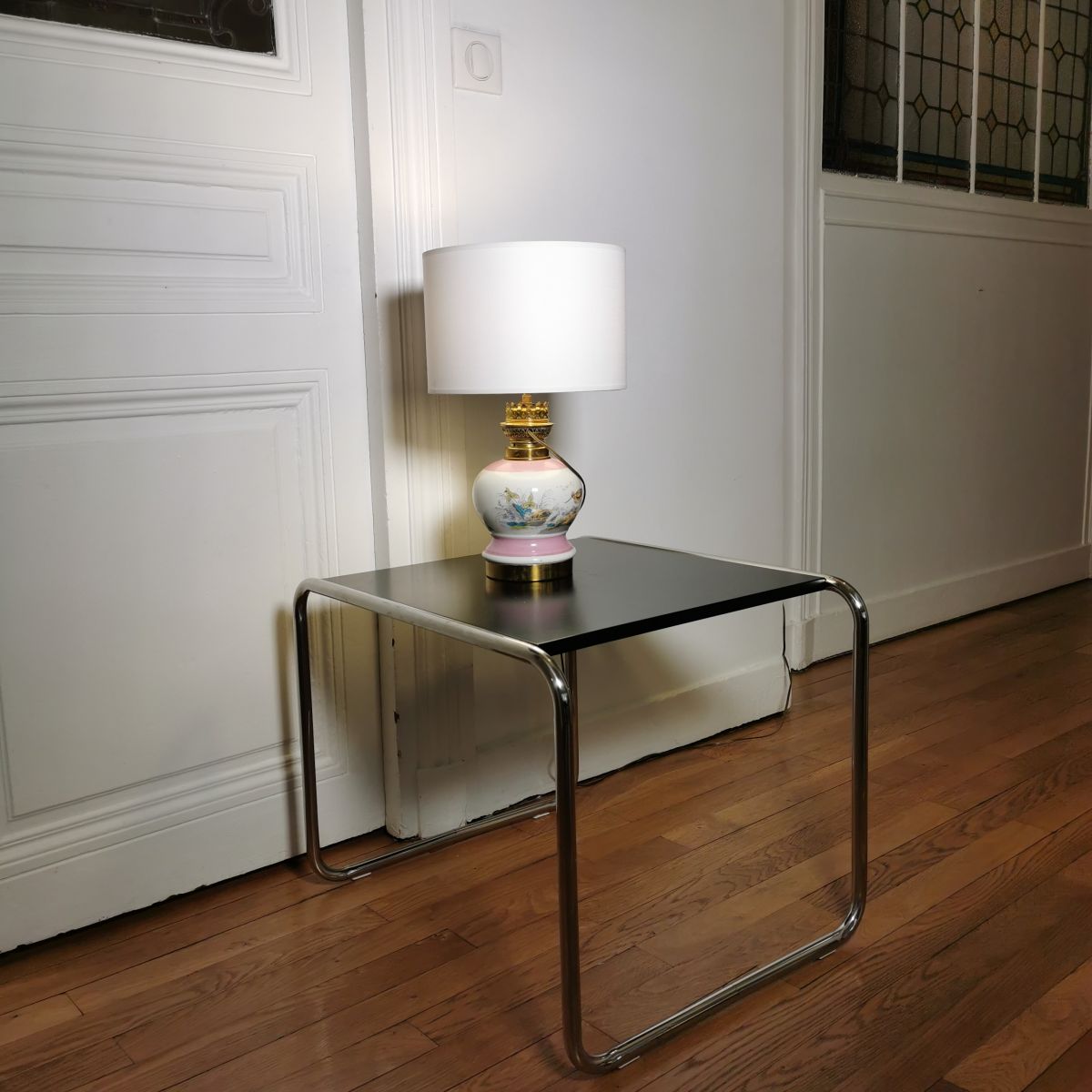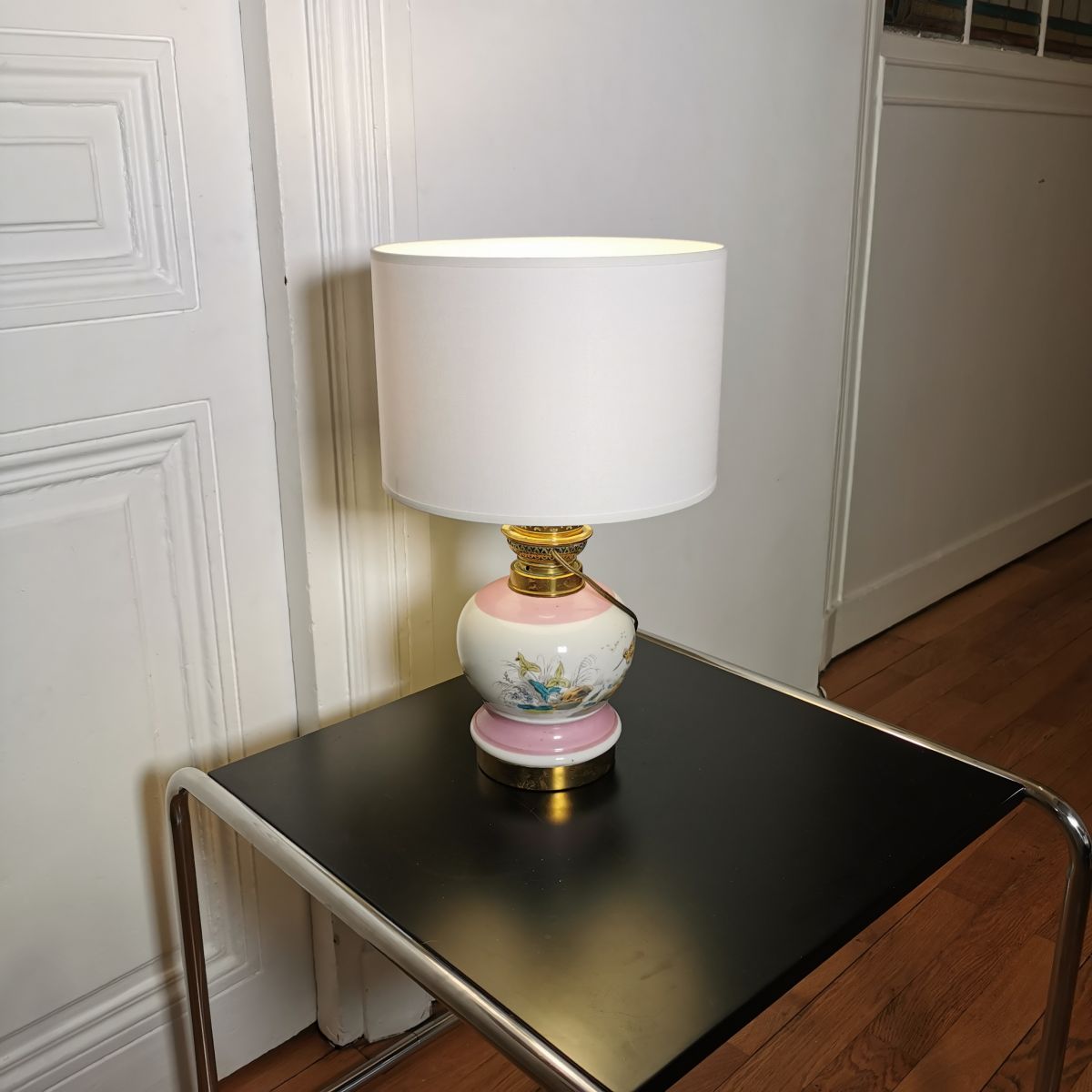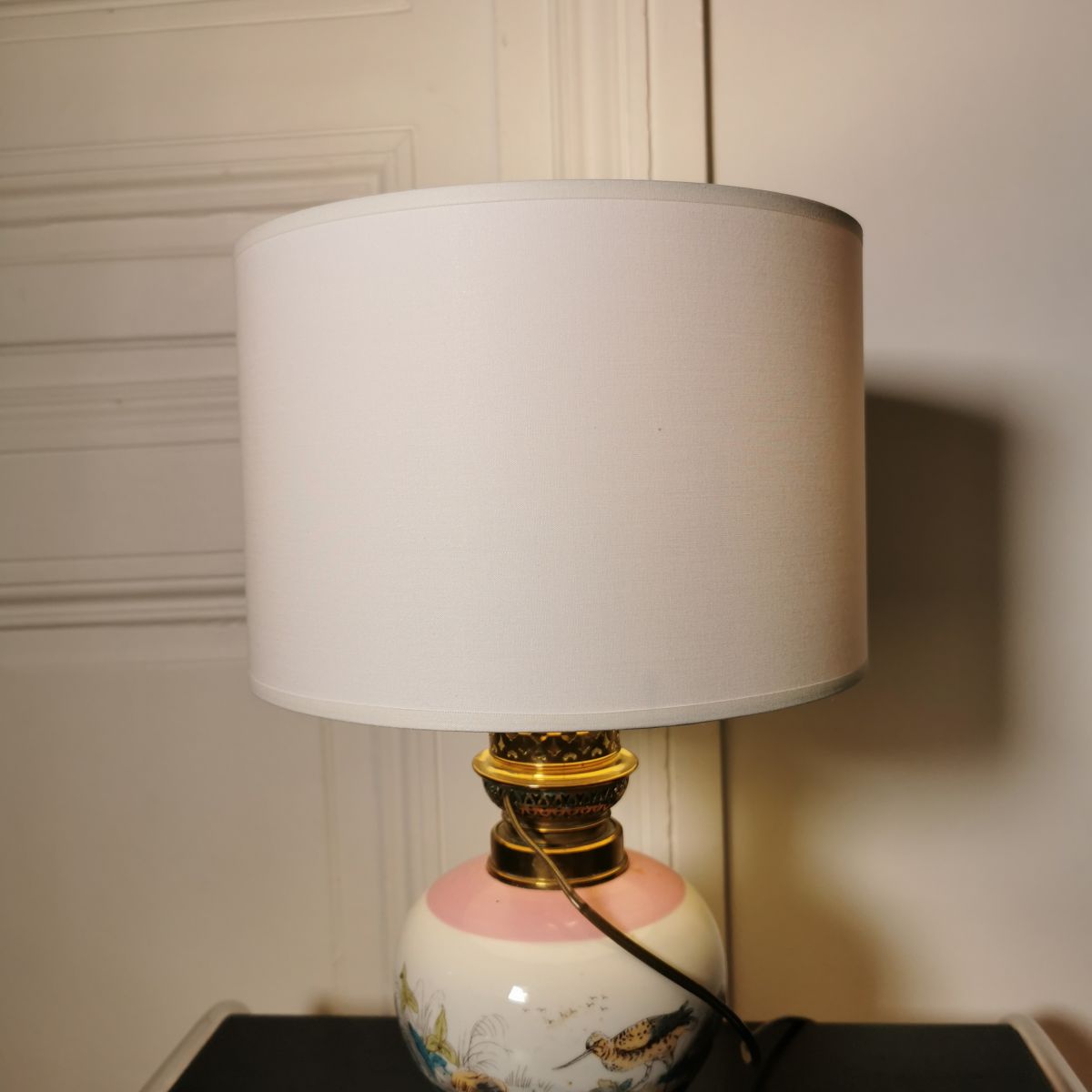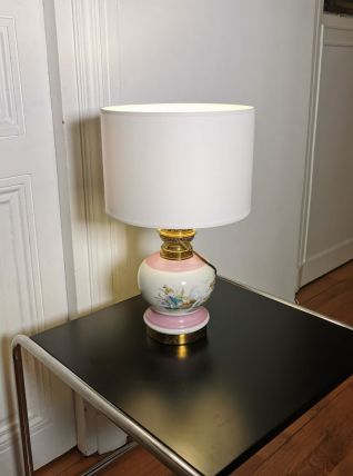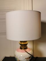Jolie lampe au socle tout en rondeur avec des décors moustiers d'oiseaux dans les teintes pastelles (rose, vert, bleu).