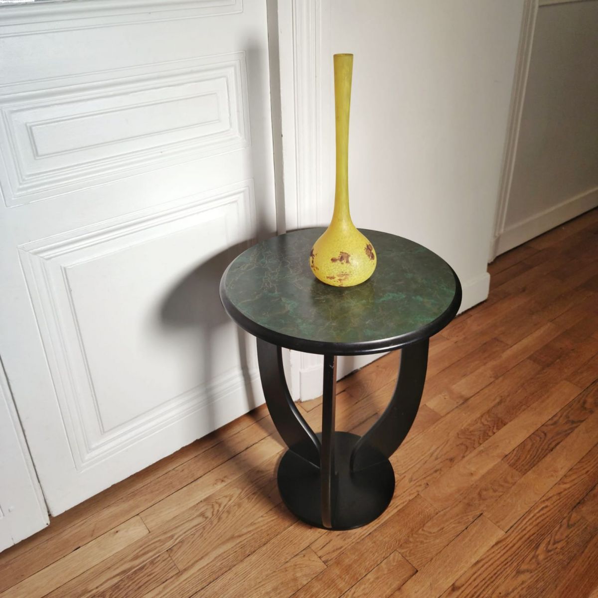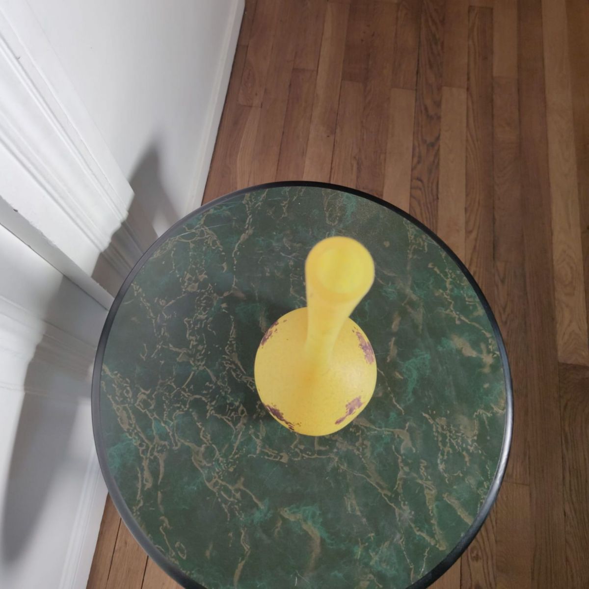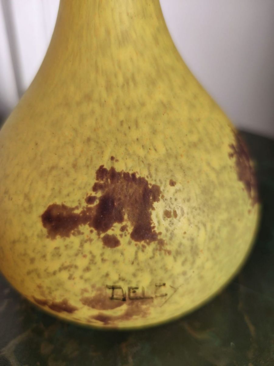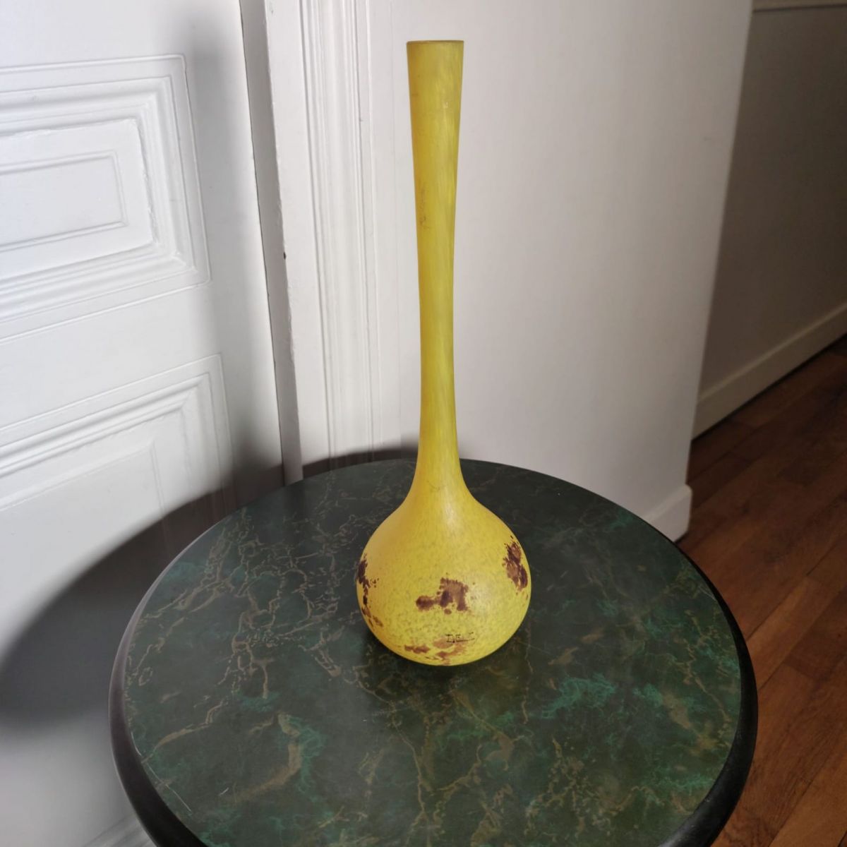 Beau soliflore d'André Delatte(1887-1953) signé sur l'arrondi au bas du vase. Il est en pâte de verre jaune et mauve, de très bonne conservation. Aucun éclat.
