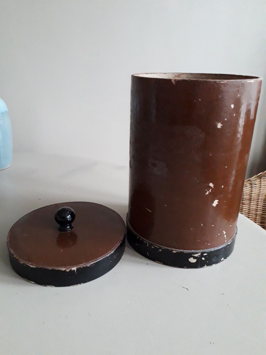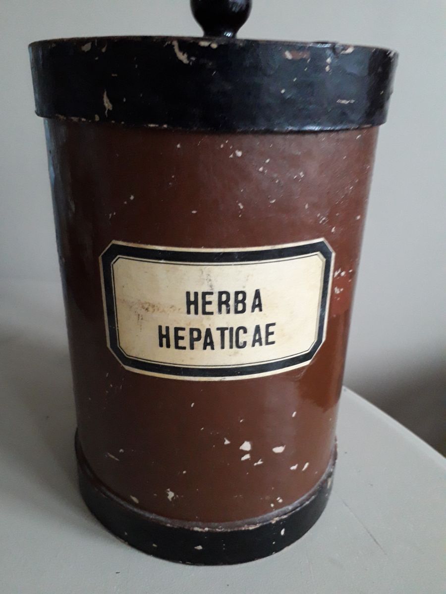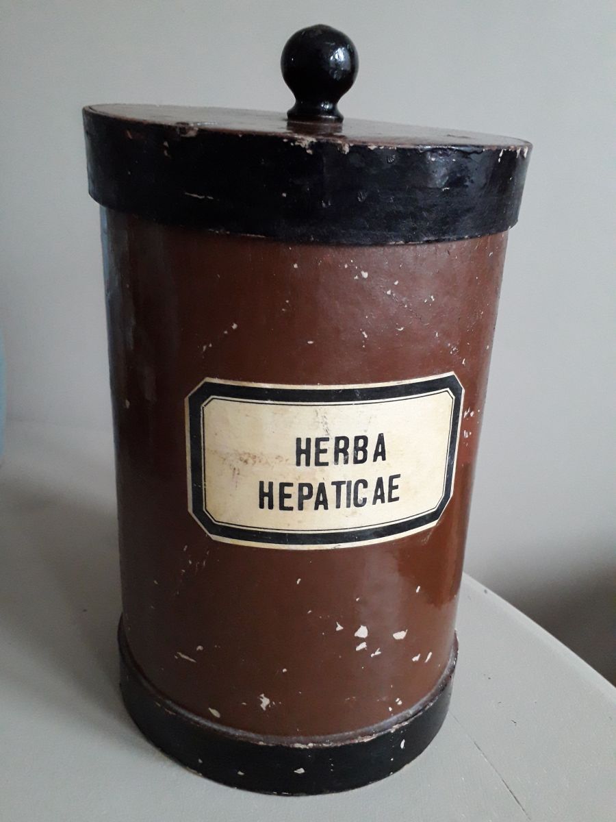 Pot d'herboriste des années 40/50 en bois (couvercle et le fond) et en carton bouilli avec sur une face l'inscription "Herba Hepaticae".