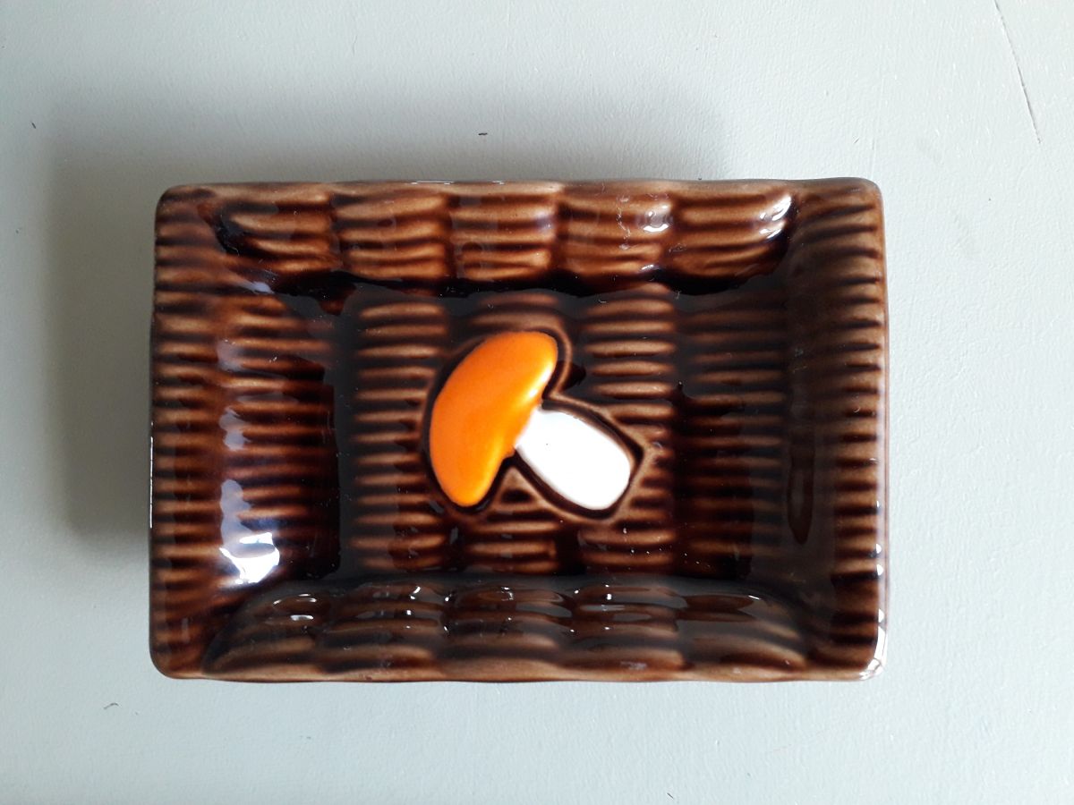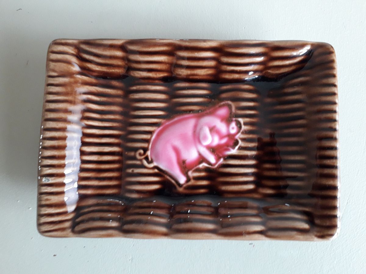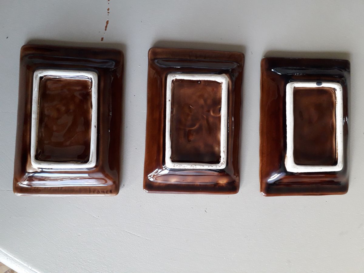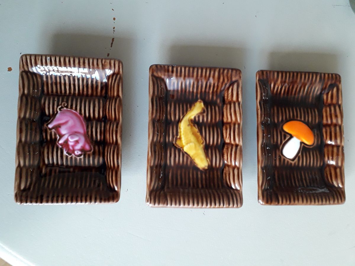 Un lot de 3 vide-poche Vallauris de couleur marron avec un décor cochon, poisson et champignon. En très bon état.
