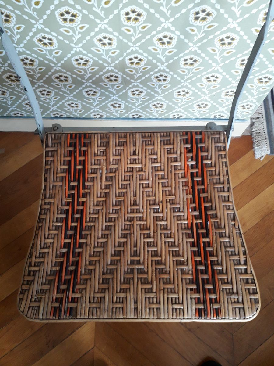 Chaise pliante des années 30 avec une structure métallique grise avec l'assise et le dossier cannés avec 2 bandes orange et noire.