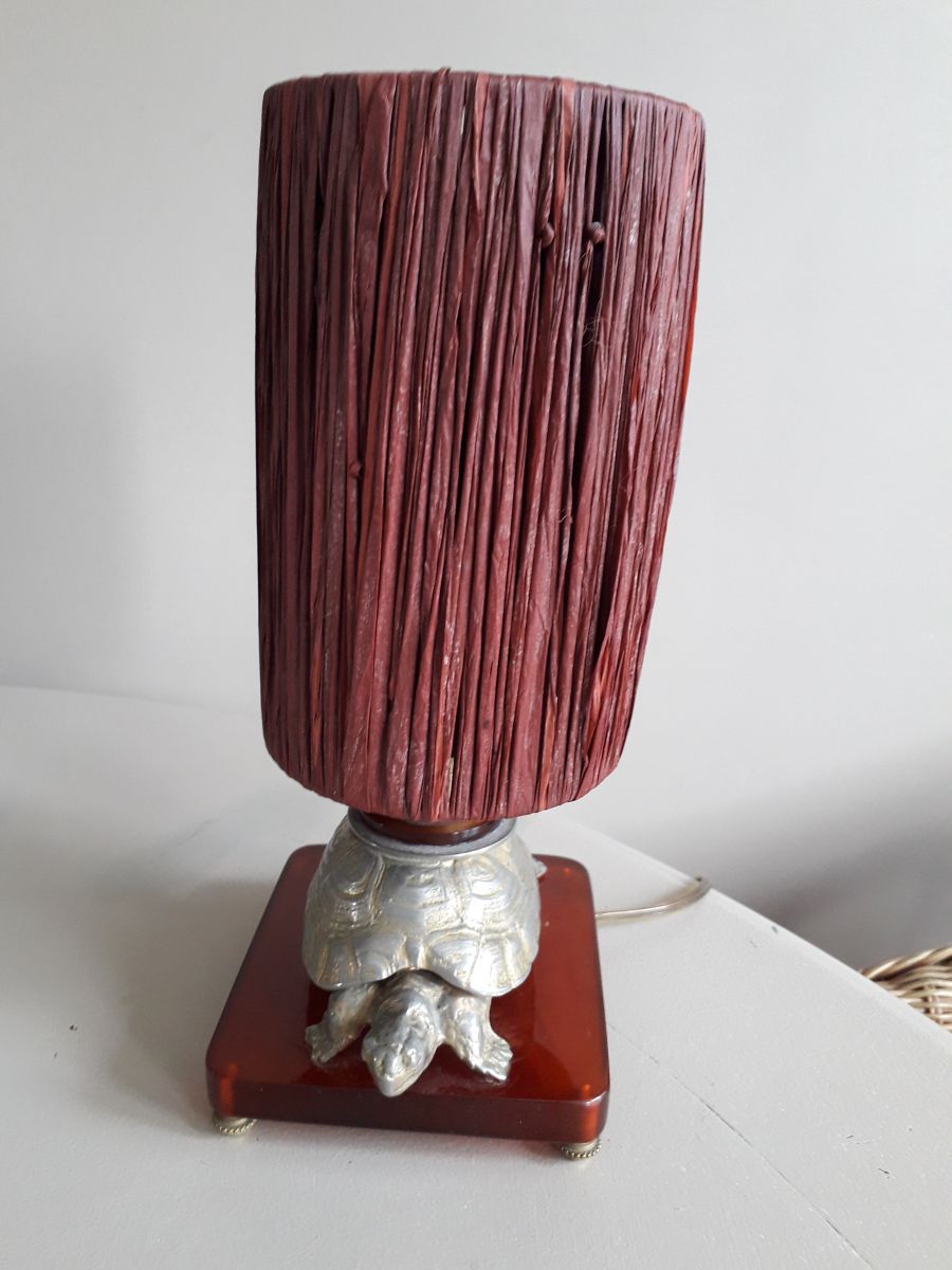 Lampe tortue des années 40 en excellent état. La tortue est en métal bronze sur un socle en résine et un abat-jour en raphia. L'appareillage électrique fonctionne.