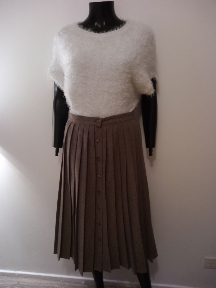 Jupe plissée en laine mélangée, excellent état, correspond à 34/36, mesures à plat : largeur taille 35 cm, longueur 73 cm