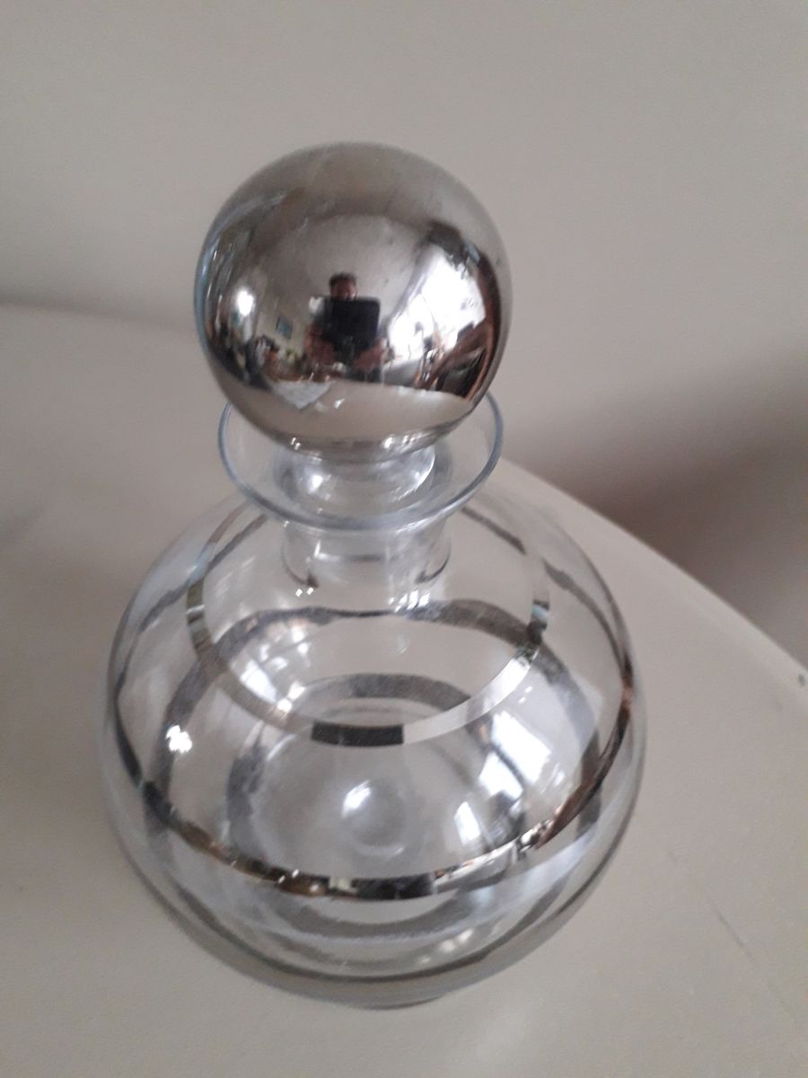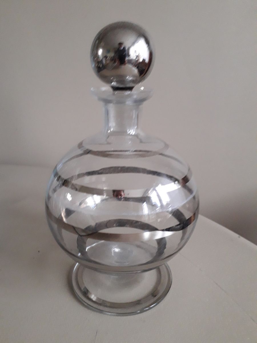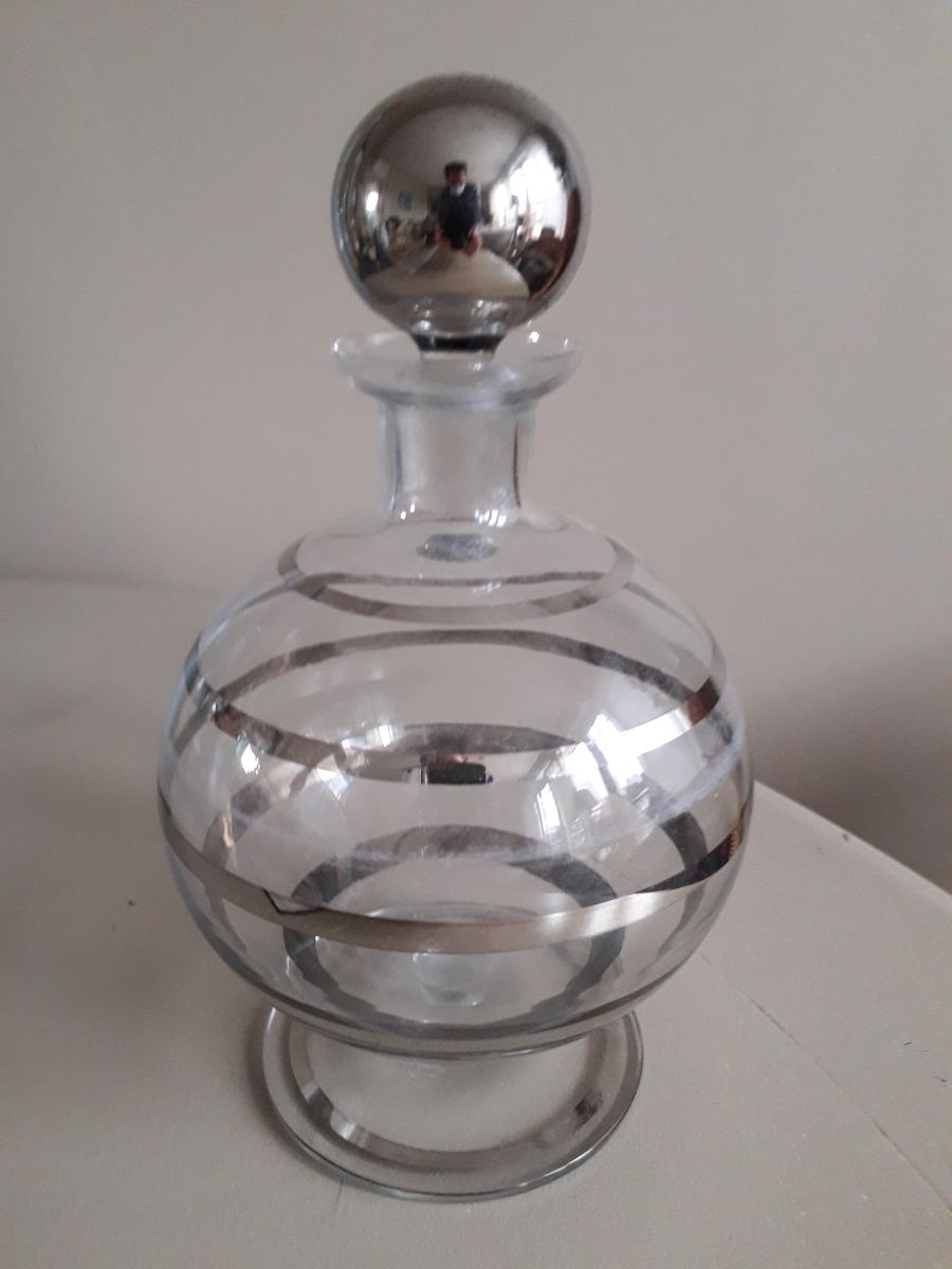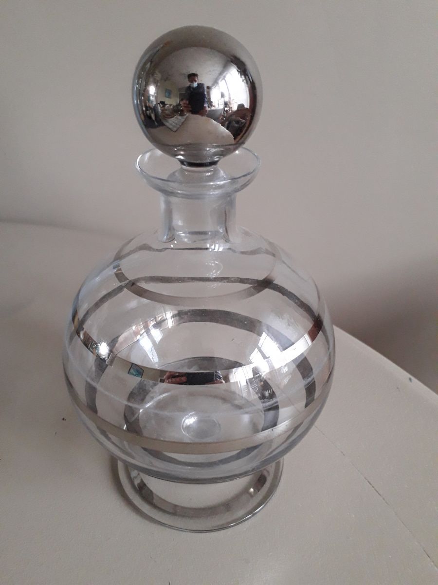 Carafe vintage des années 30 de forme sphérique avec des rayures et le bouchon argentés. En excellent état.