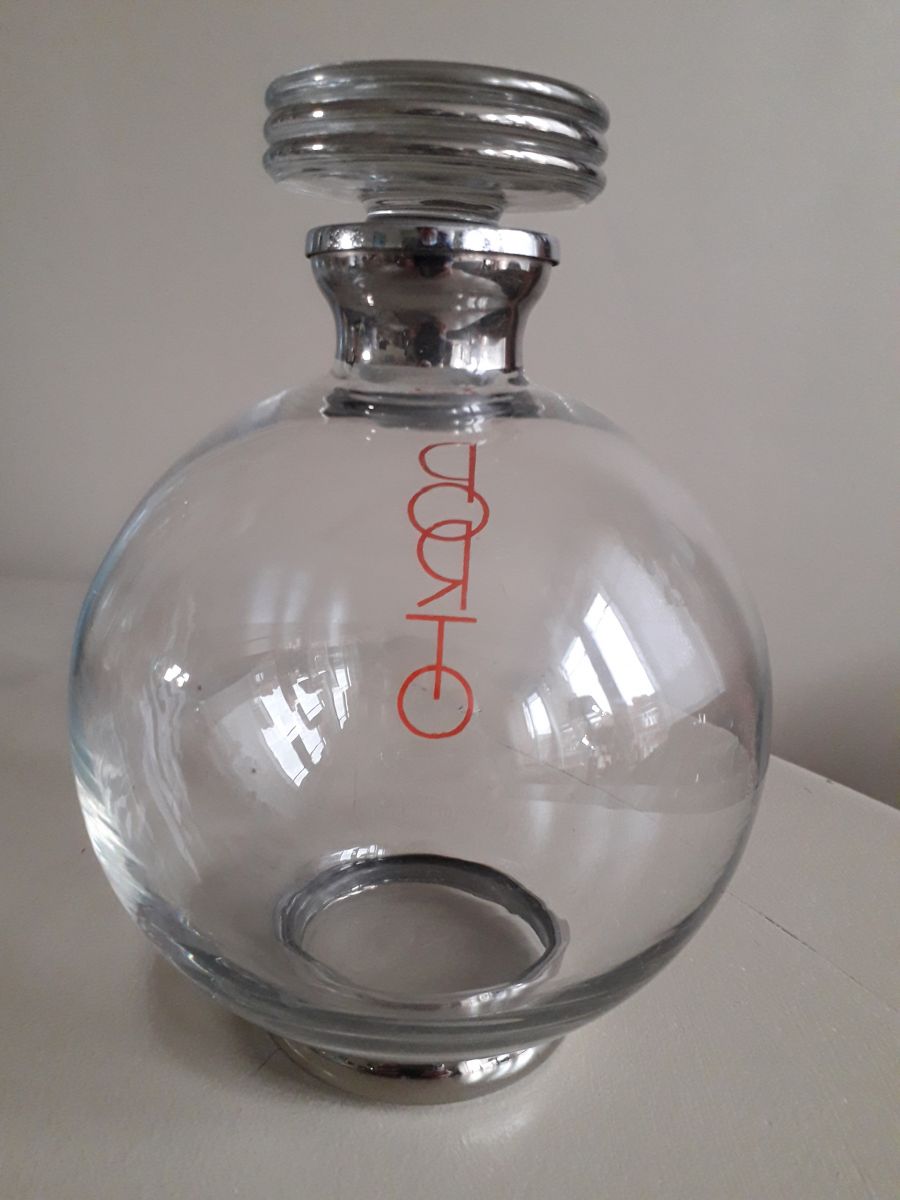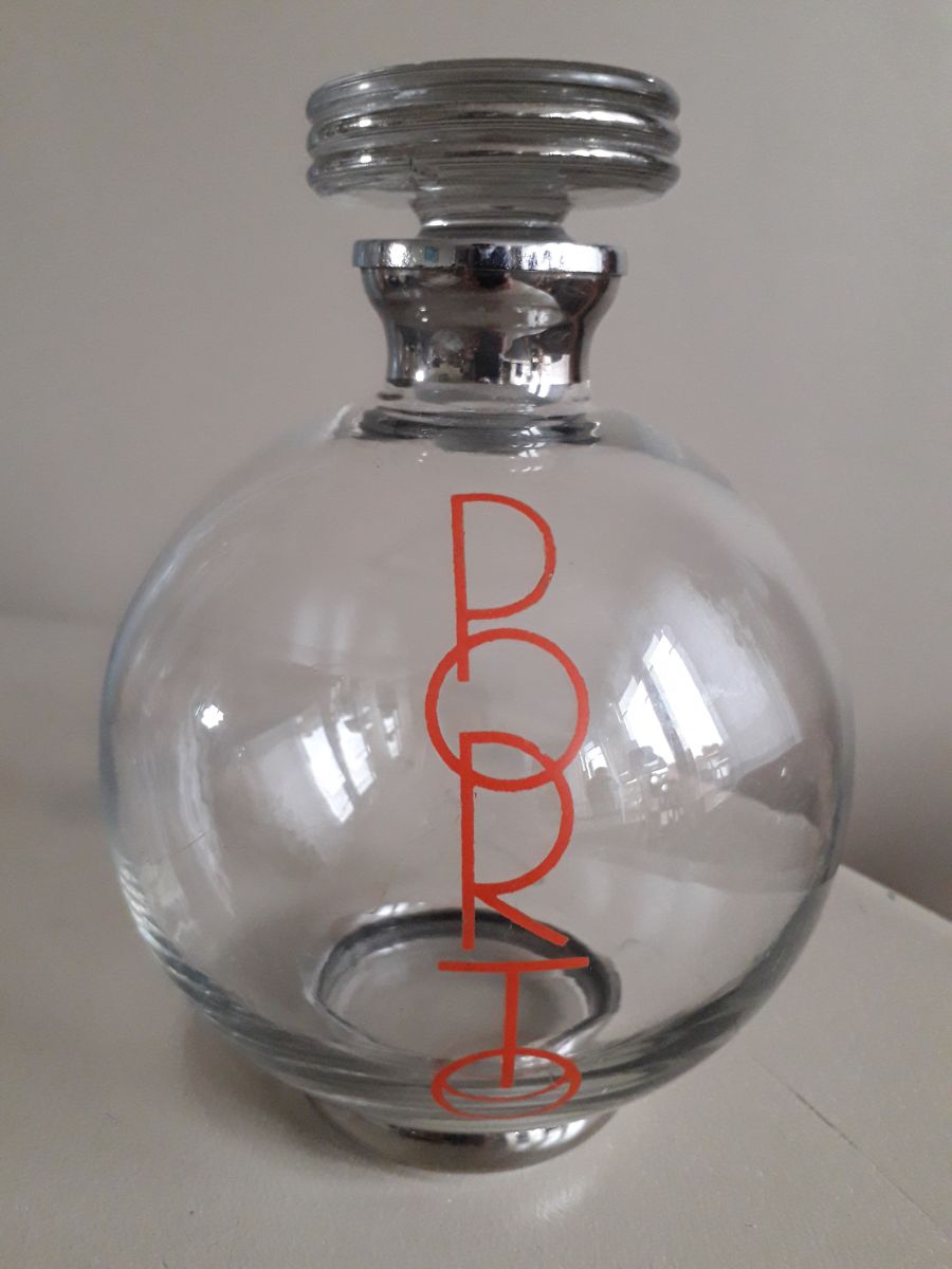 Carafe à porto des années 30 de forme sphérique avec une inscription art-déco et un bouchon en verre de forme plate.