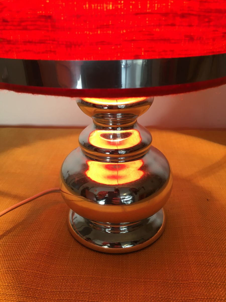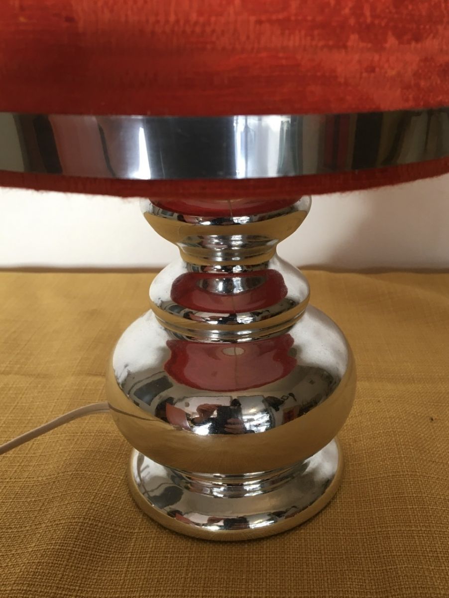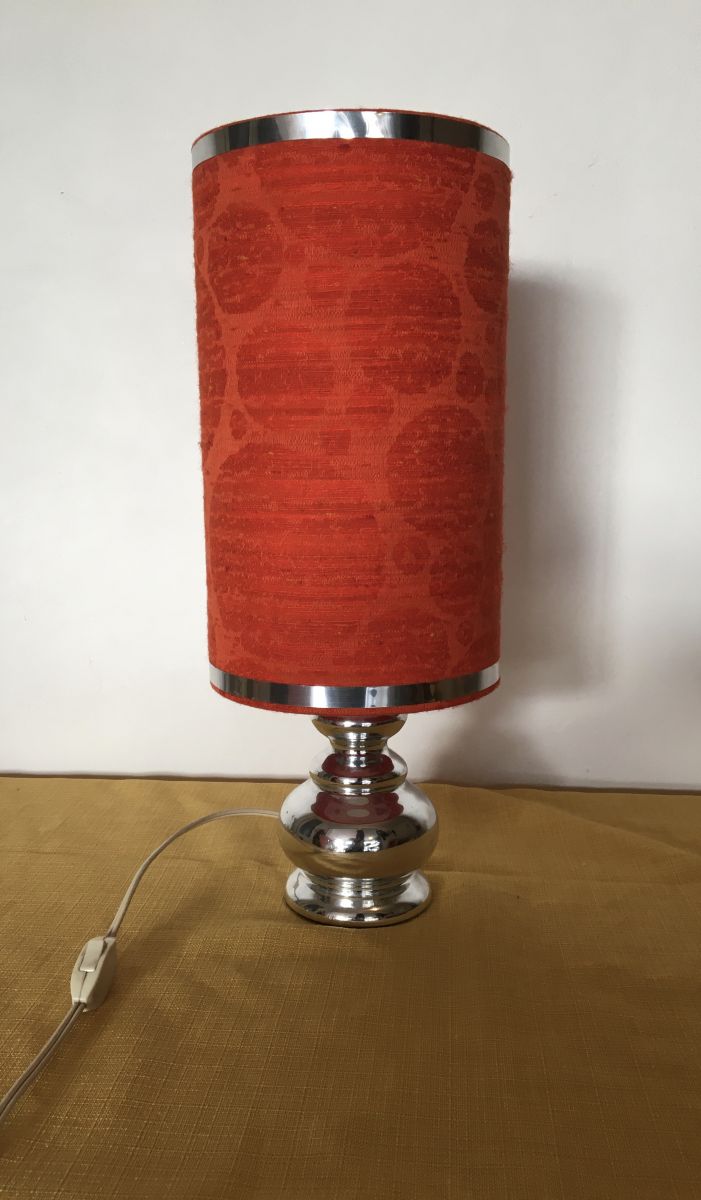 Belle lampe, des années 70, orange et chromée. Pied en céramique chromée d’une hauteur 15 cm. Bel abat-jour orange en tissus souligné d’un ruban métallique chromé en haut et en bas. Hauteur de l’abat-jour 30 cm, diamètre de l’abat-jour 18 cm. Hauteur du ruban métallique chromé sur l’abat-jour 1 cm.