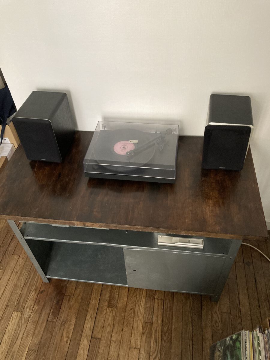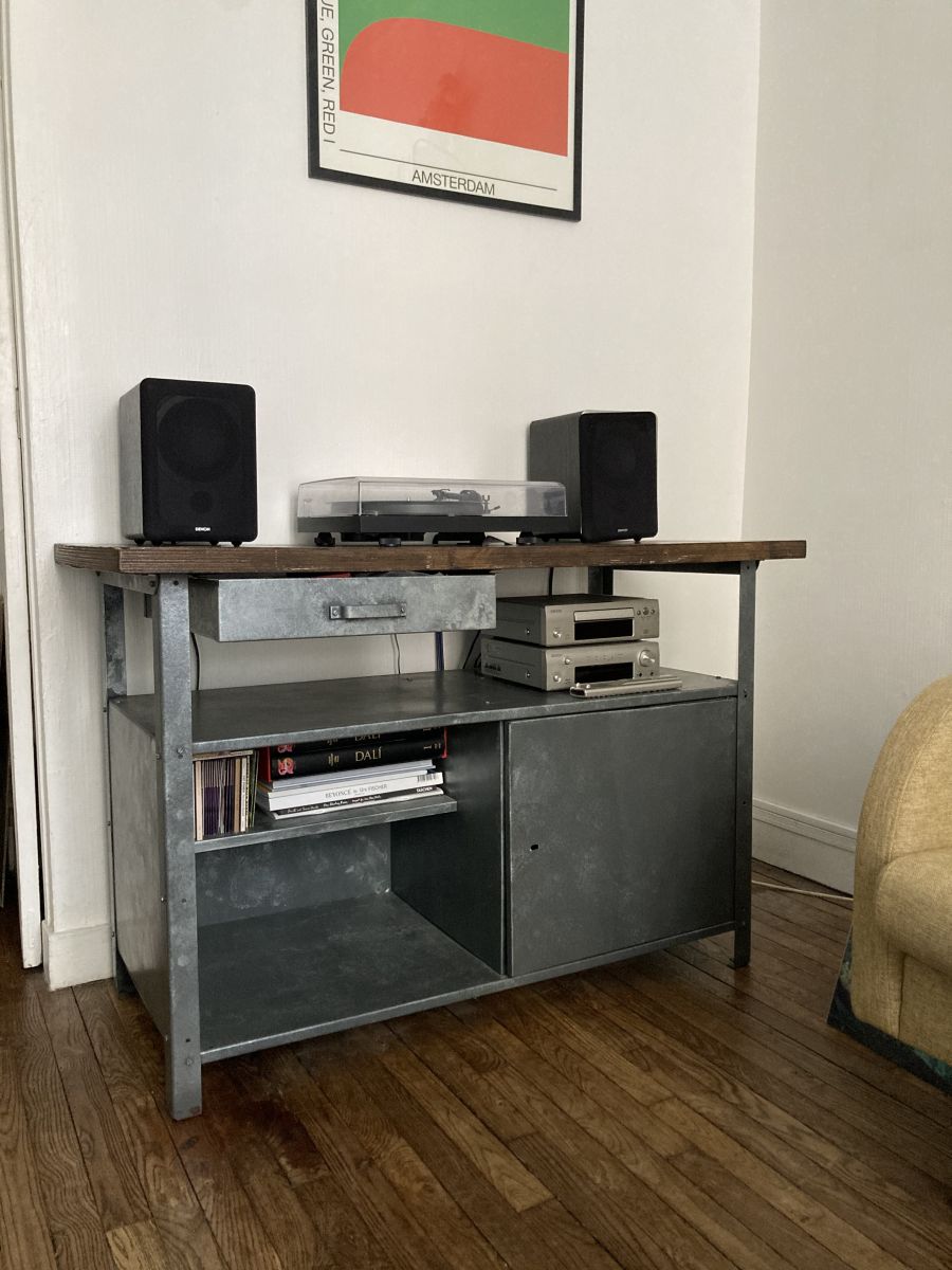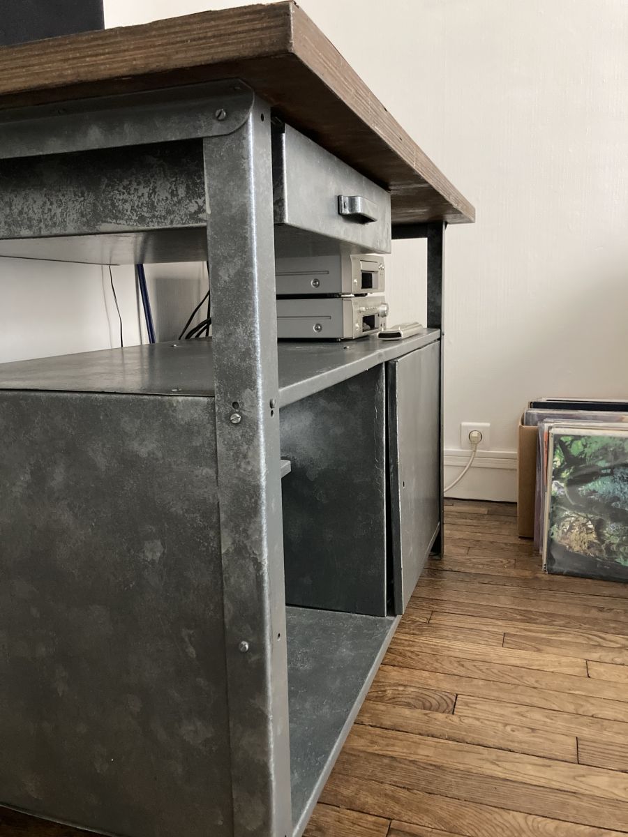En bon état. Joli établi industriel rénové. Utilisé pour ma part comme meuble hi-fi et rangement. Corps de l'établi en métal et plateau en bois massif foncé. Esprit Loft.