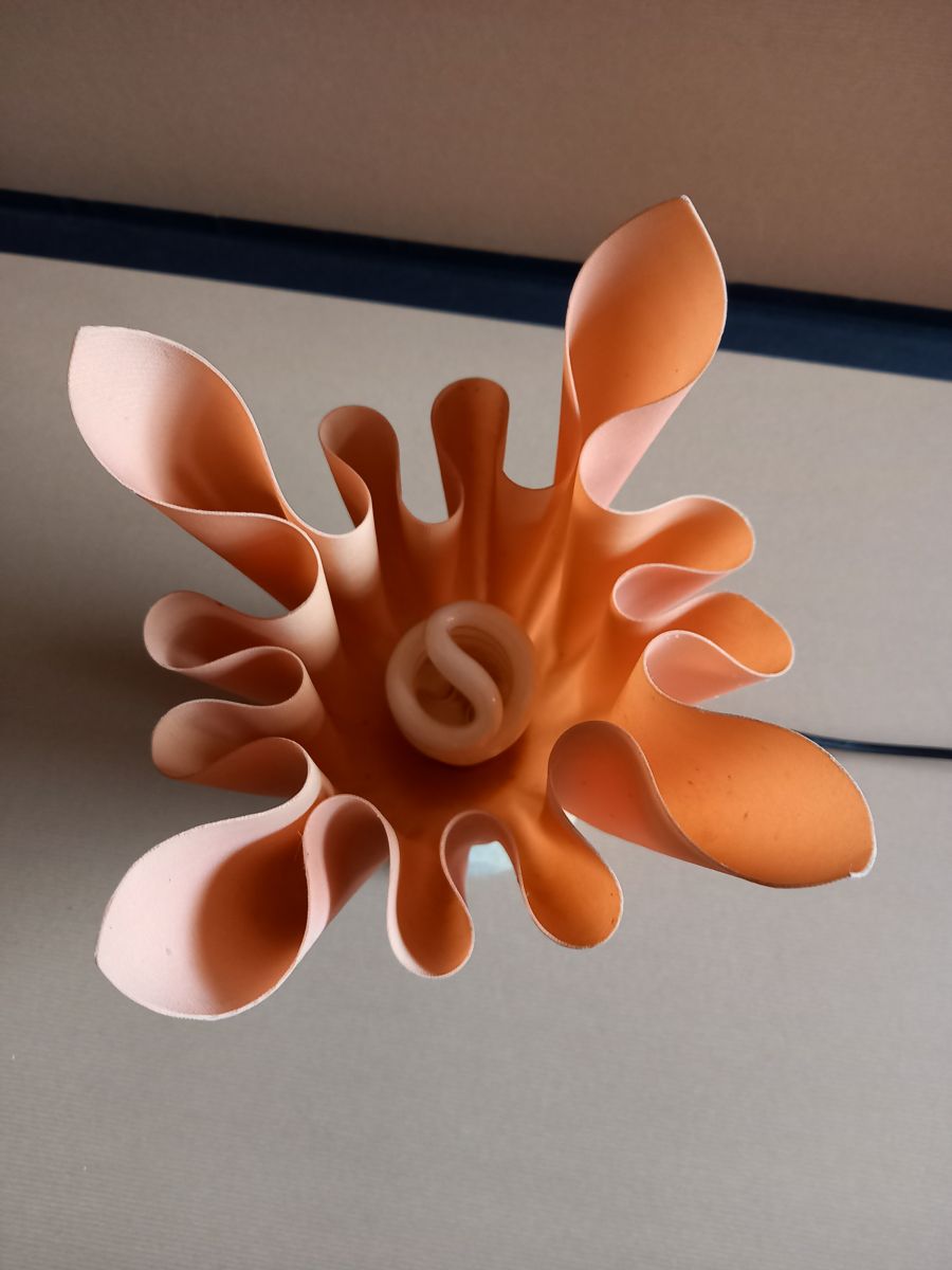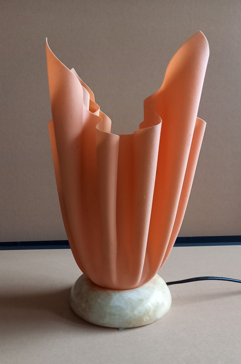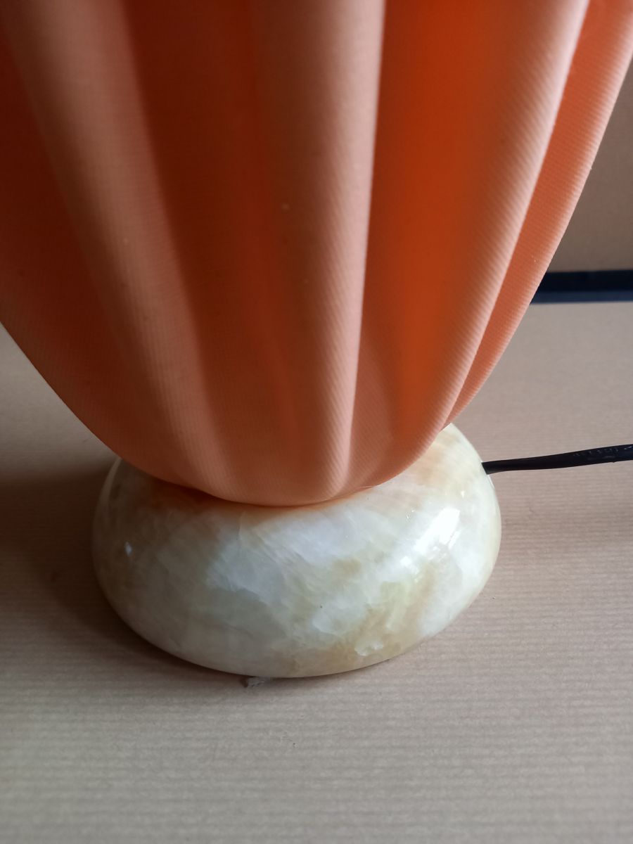 Pied en albâtre crème et corolle en résine de synthèse de couleur pêche.