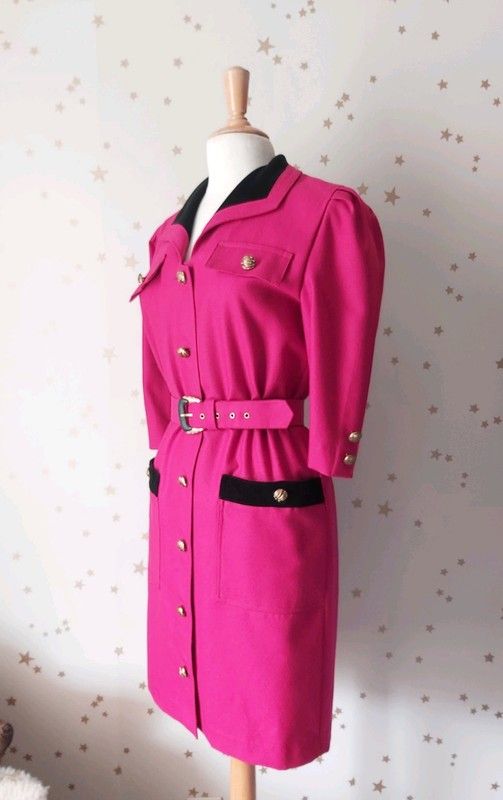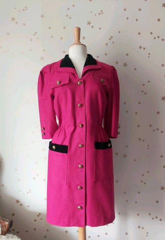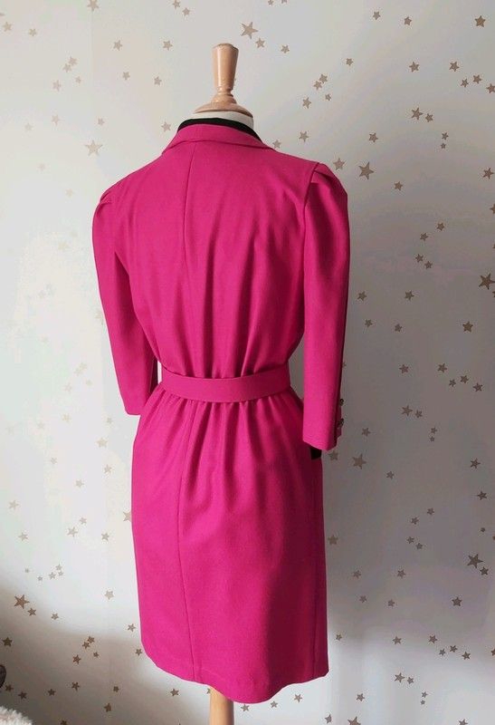 Vintage années 1980 robe style veste drap de laine rose fuschia col et poches velours noir, boutonnée devant, taille élastique, manches trois quart, ceinture assortie, non doublée.
