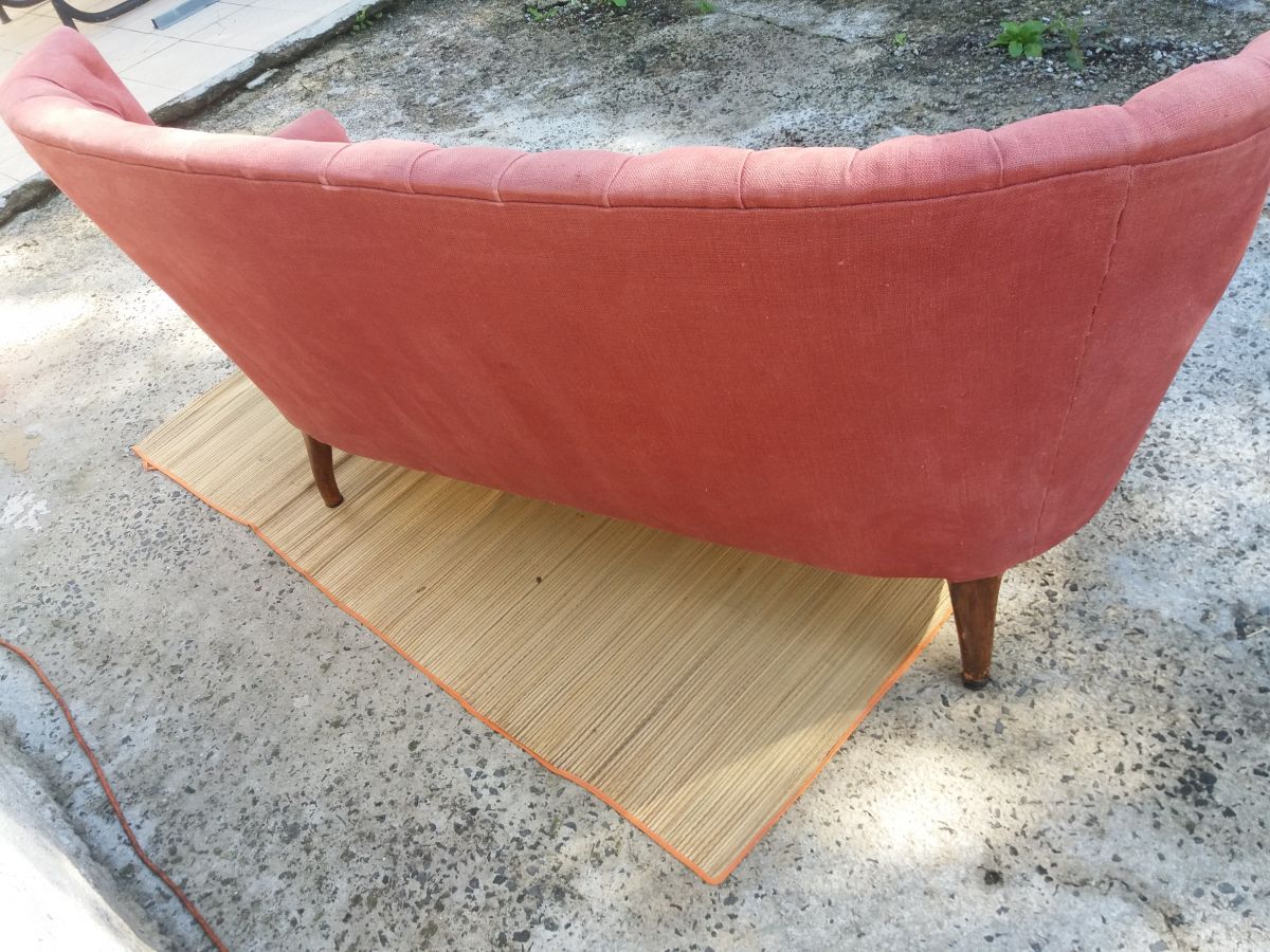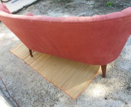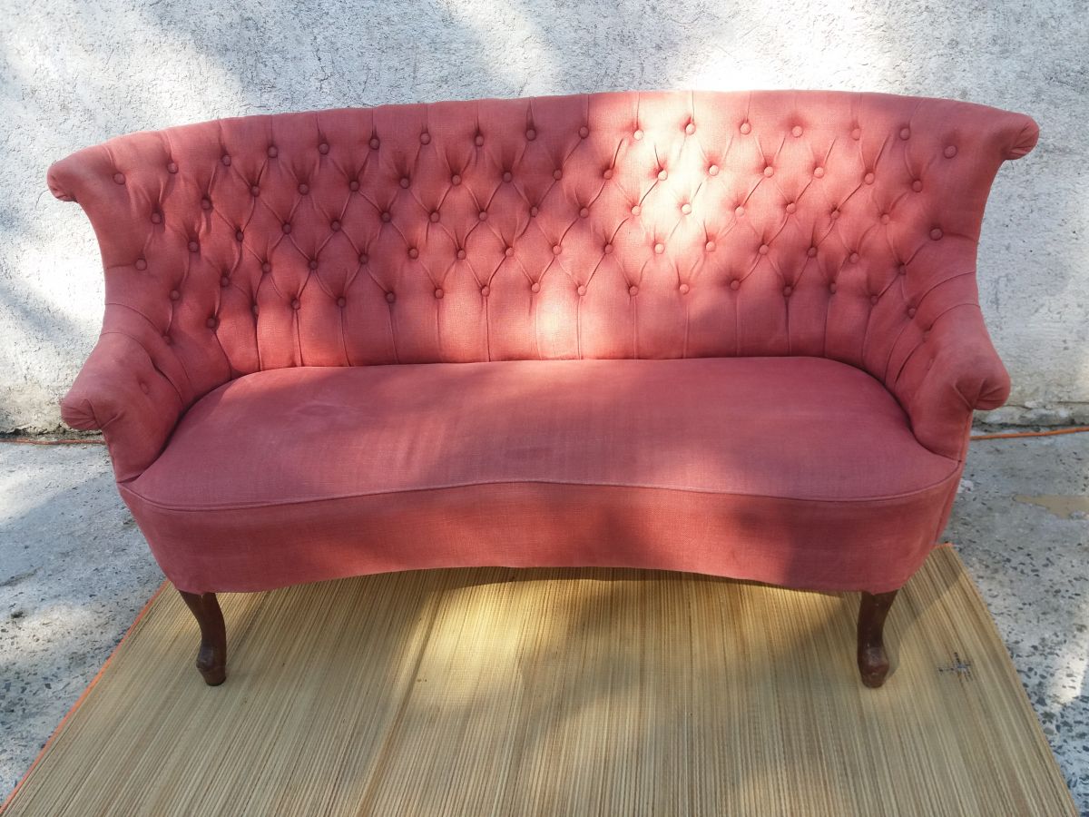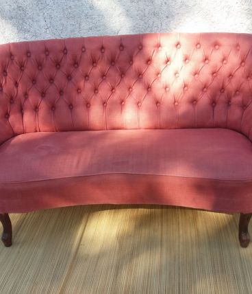 Très beau canapé de style Napoléon III en acajou. Retapisser il y a quelques années avec un tissus de très bonne qualité coloris terracota, dossier capitonnée. Dossier et assise confortable. Un seul pied en photo est légèrement abîmé pour l'age.