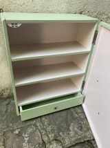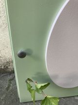 Armoire à pharmacie ancienne restaurée.Elle est vert amande à l'extérieur et rose clair à l'intérieur. La porte est ornée d'un ovale en bois en relief rose et d'un petit bouton en metal.